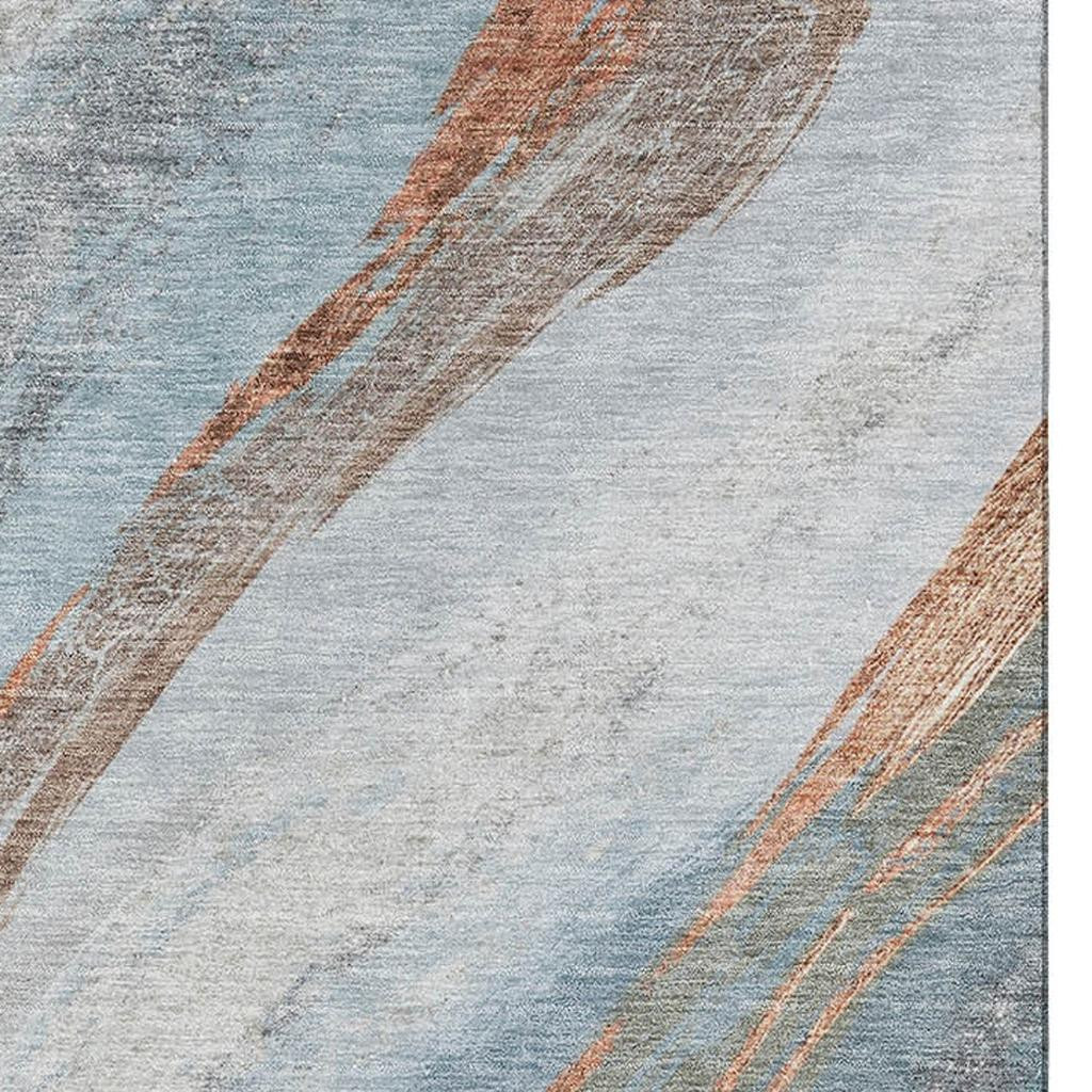 Add some artistry to your room with this 9-foot x 12-foot blue and copper abstract washable area rug with uv protection. Ideal for spaces with kids and pets, this rug is stain resistant to help repel dirt and spilled liquids. Built to last, this rug crafted from polyester fibers is known for its durability and long lasting appeal. Rugs are a great way to showcase your style, hide imperfections, warm your home and reduce noise. This larger sized, transitional styled rug is ready to create a focal point or statement piece in your room. 108.00-inch h x 144.00-inch w x 0.39-inch d.