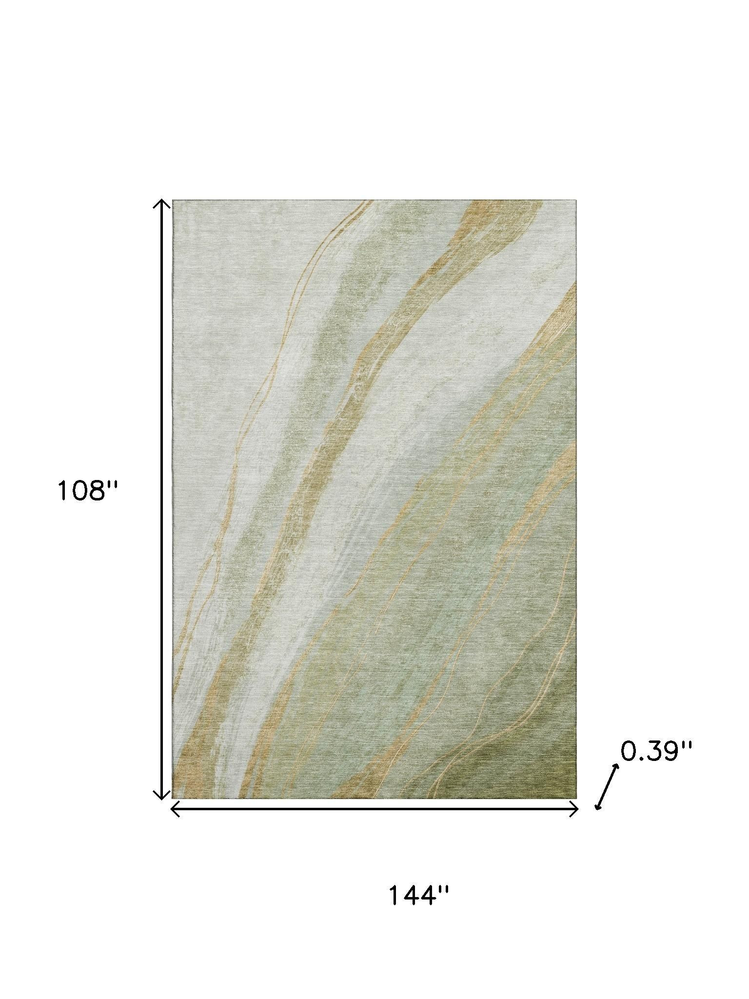 This 9-foot x 12-foot sage and copper abstract washable area rug with uv protection, is a great way to add warmth to a room. Ideal for spaces with kids and pets, this rug is stain resistant to help repel dirt and spilled liquids. Built to last, this rug crafted from polyester fibers is known for its durability and long lasting appeal. Rugs are a great way to showcase your style, hide imperfections, warm your home and reduce noise. This larger sized, transitional styled rug is ready to create a focal point or statement piece in your room. 108.00-inch h x 144.00-inch w x 0.39-inch d.