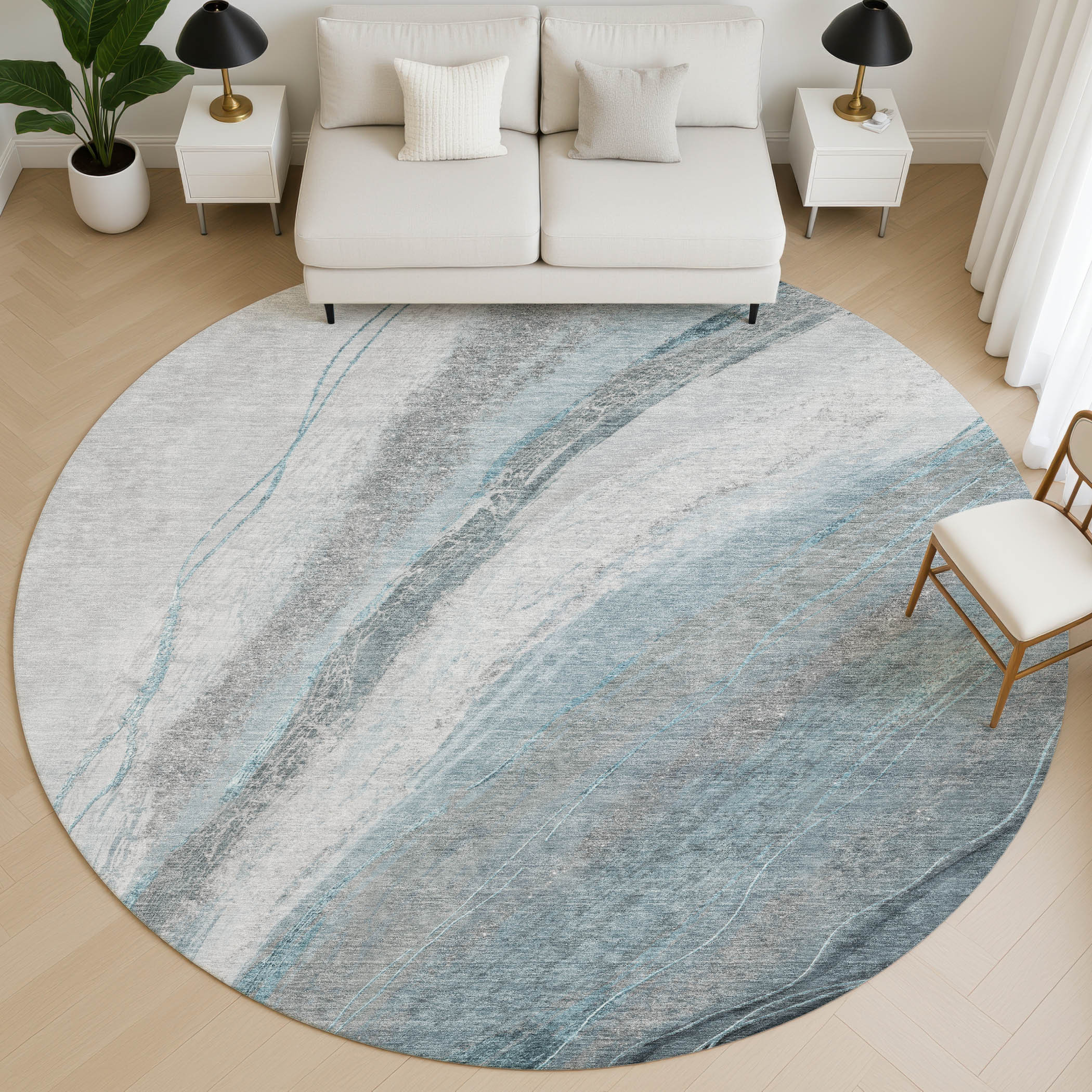 Set an inviting tone in your space with this 8-foot teal and gray abstract washable round rug with uv protection. Ideal for spaces with kids and pets, this rug is stain resistant to help repel dirt and spilled liquids. Built to last, this rug crafted from polyester fibers is known for its durability and long lasting appeal. Rugs are a great way to showcase your style, hide imperfections, warm your home and reduce noise. This larger sized, transitional styled rug is ready to create a focal point or statement piece in your room. 96.00-inch h x 96.00-inch w x 0.39-inch d.