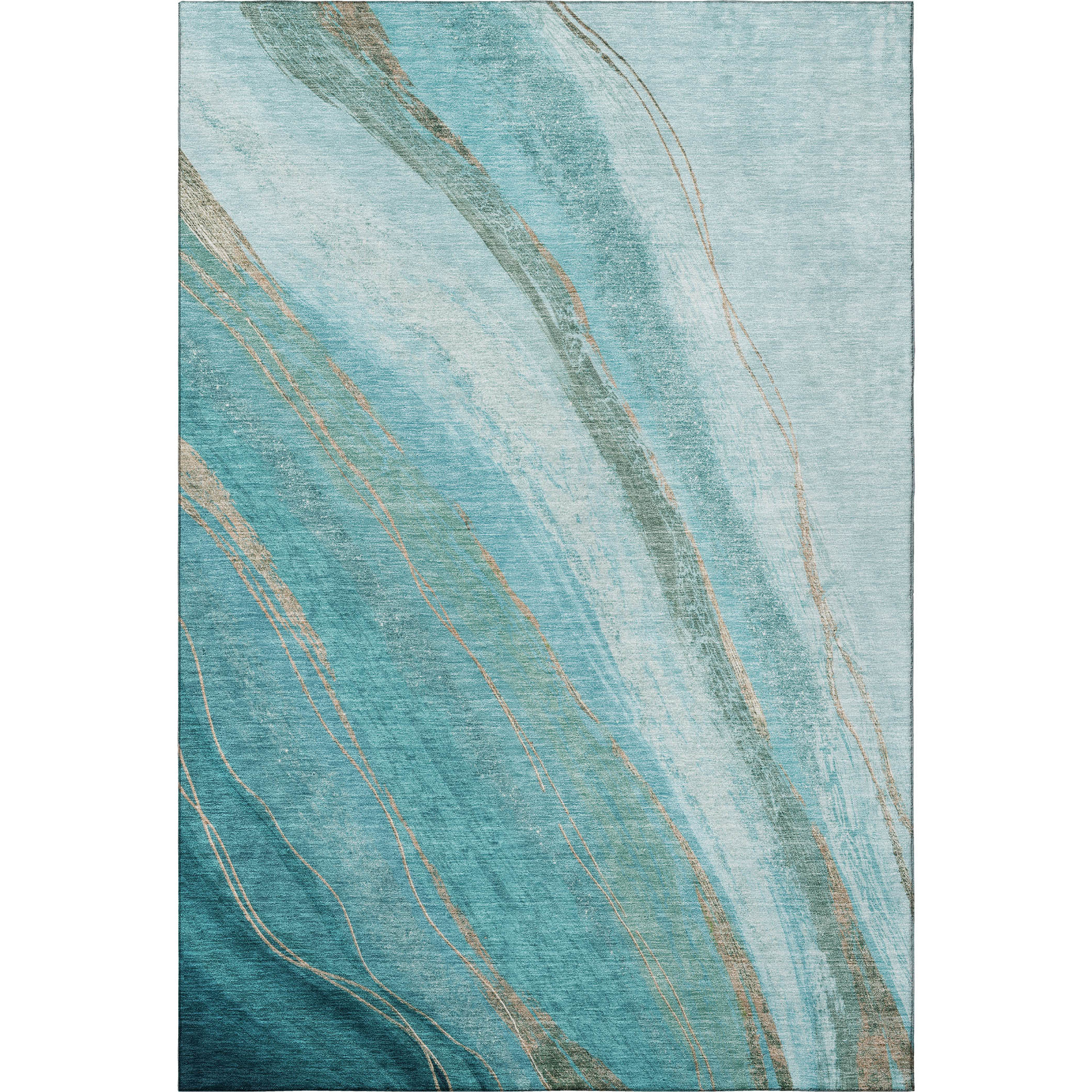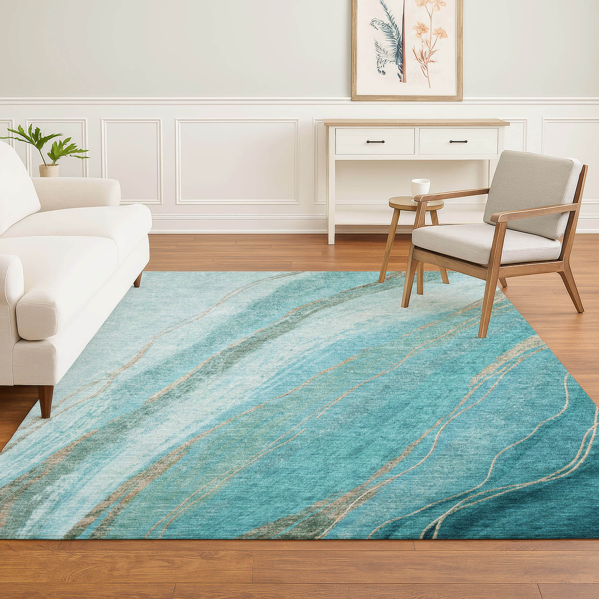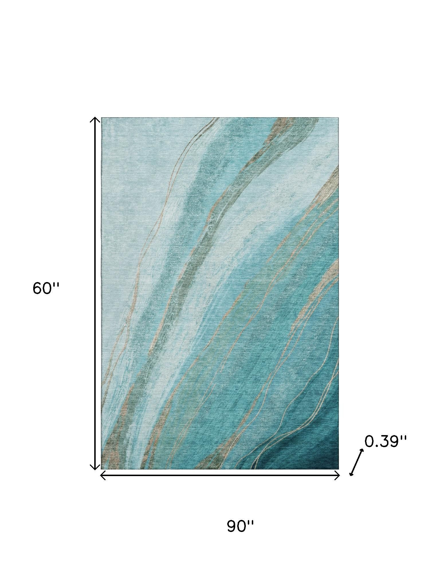 Add some artistry to your room with this 5-foot x 8-foot turquoise and teal abstract washable area rug with uv protection. Ideal for spaces with kids and pets, this rug is stain resistant to help repel dirt and spilled liquids. Built to last, this rug crafted from polyester fibers is known for its durability and long lasting appeal. Rugs are a great way to showcase your style, hide imperfections, warm your home and reduce noise. This larger sized, transitional styled rug is ready to create a focal point or statement piece in your room. 60.00-inch h x 90.00-inch w x 0.39-inch d.