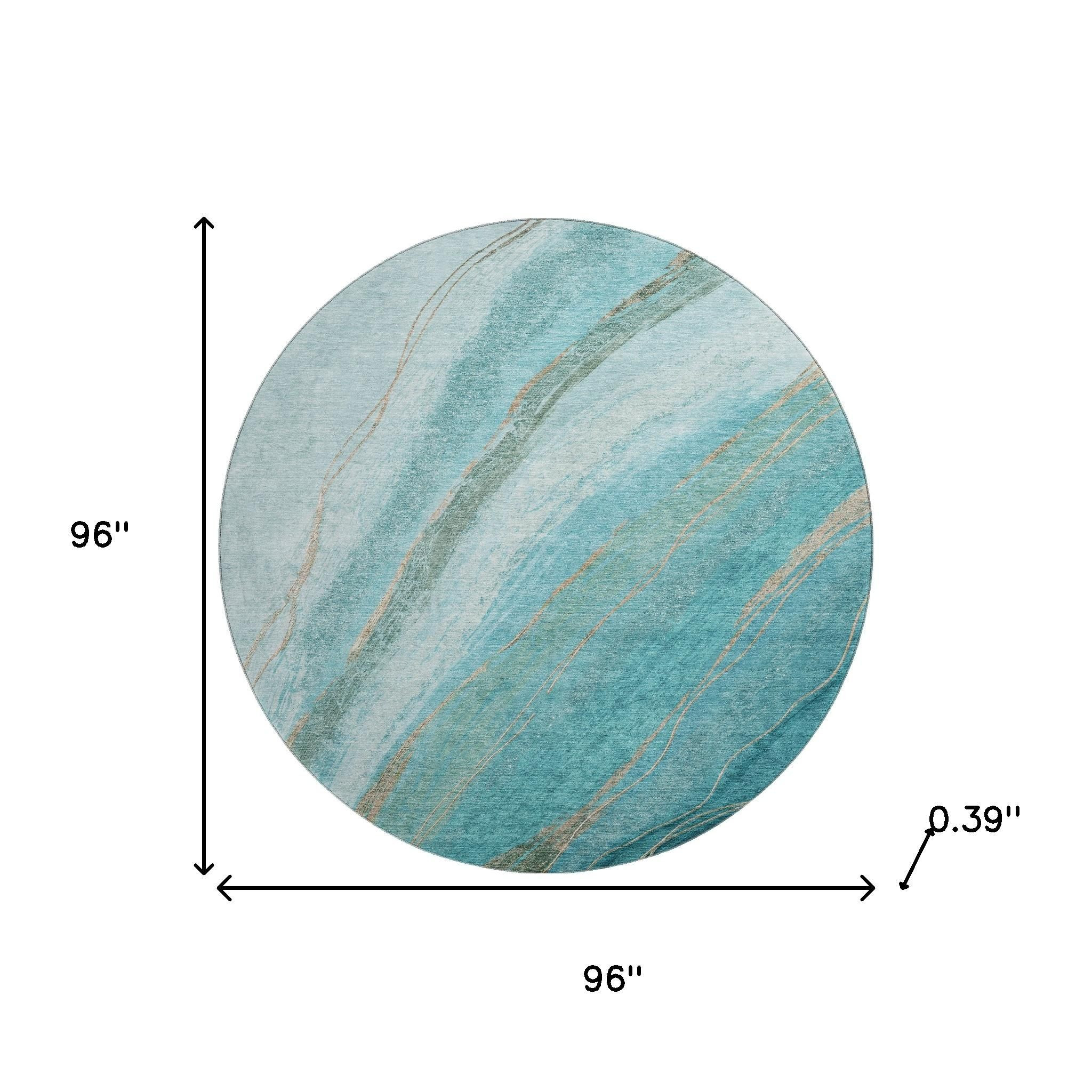 Add great coloration and comfortable texture to your space with this 8-foot turquoise and teal abstract washable round rug with uv protection. Ideal for spaces with kids and pets, this rug is stain resistant to help repel dirt and spilled liquids. Built to last, this rug crafted from polyester fibers is known for its durability and long lasting appeal. Rugs are a great way to showcase your style, hide imperfections, warm your home and reduce noise. This larger sized, transitional styled rug is ready to create a focal point or statement piece in your room. 96.00-inch h x 96.00-inch w x 0.39-inch d.