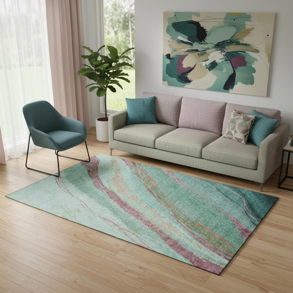 Add some artistry to your room with this 5-foot x 8-foot green and blush abstract washable area rug with uv protection. Ideal for spaces with kids and pets, this rug is stain resistant to help repel dirt and spilled liquids. Built to last, this rug crafted from polyester fibers is known for its durability and long lasting appeal. Rugs are a great way to showcase your style, hide imperfections, warm your home and reduce noise. This larger sized, transitional styled rug is ready to create a focal point or statement piece in your room. 60.00-inch h x 90.00-inch w x 0.39-inch d.