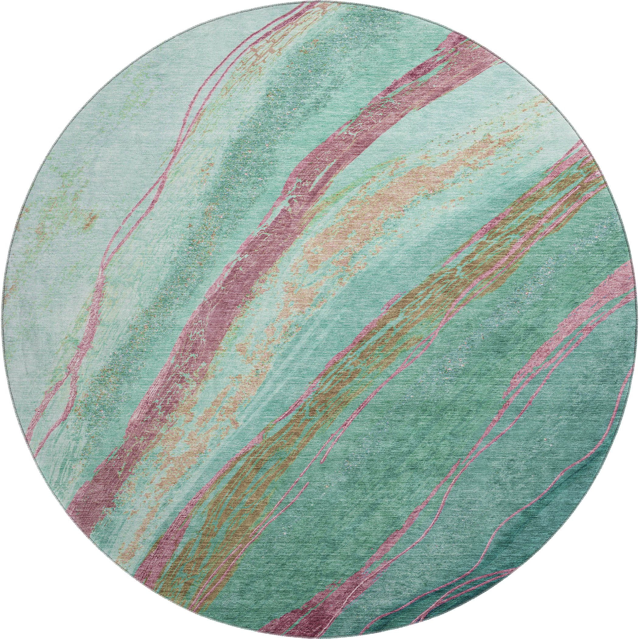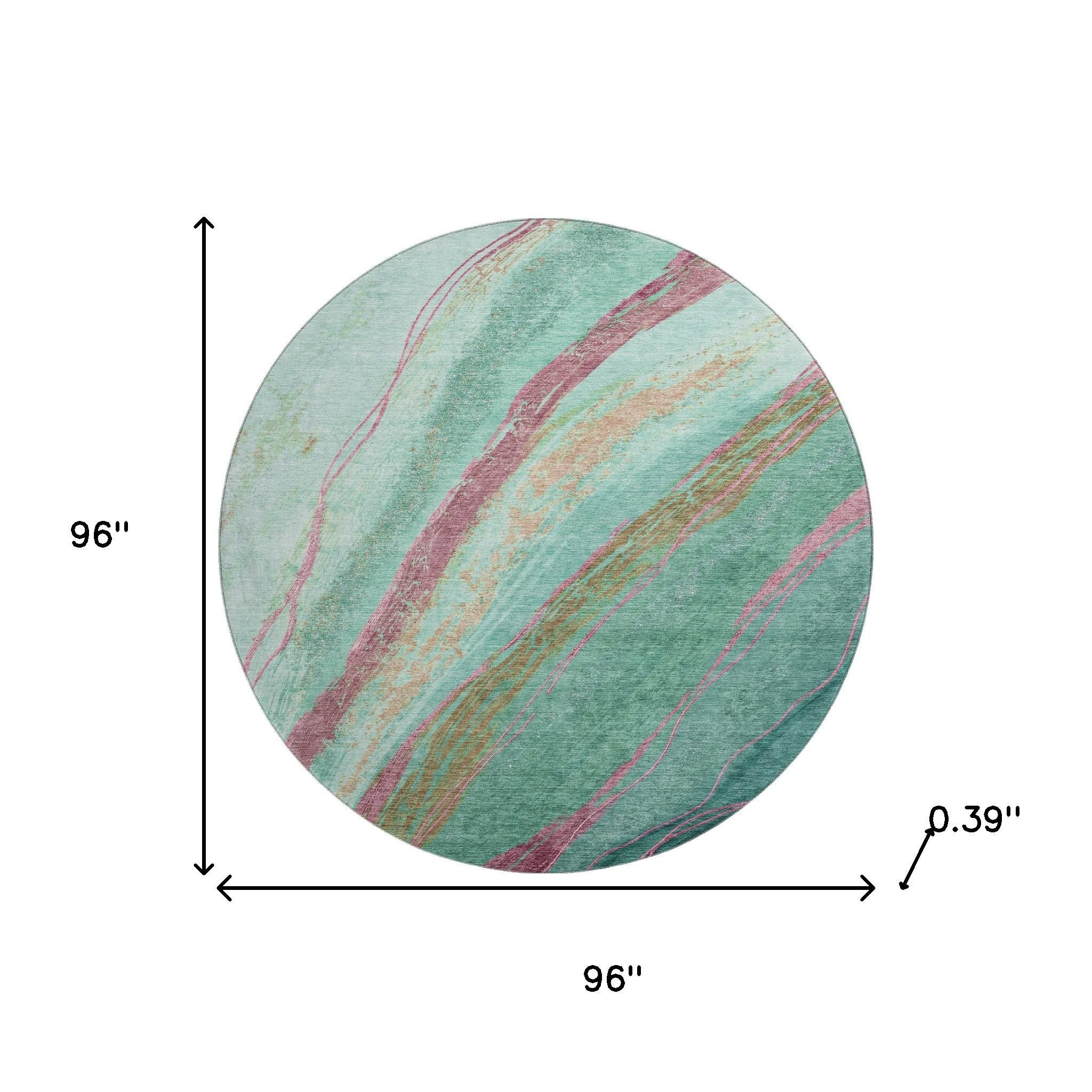 Add some artistry to your room with this 8-foot green and blush abstract washable round rug with uv protection. Ideal for spaces with kids and pets, this rug is stain resistant to help repel dirt and spilled liquids. Built to last, this rug crafted from polyester fibers is known for its durability and long lasting appeal. Rugs are a great way to showcase your style, hide imperfections, warm your home and reduce noise. This larger sized, transitional styled rug is ready to create a focal point or statement piece in your room. 96.00-inch h x 96.00-inch w x 0.39-inch d.