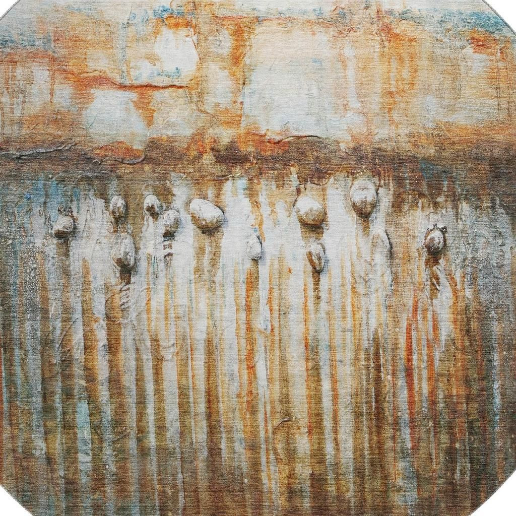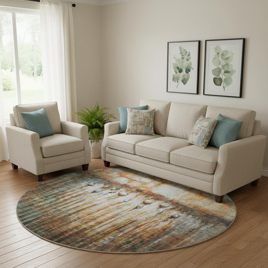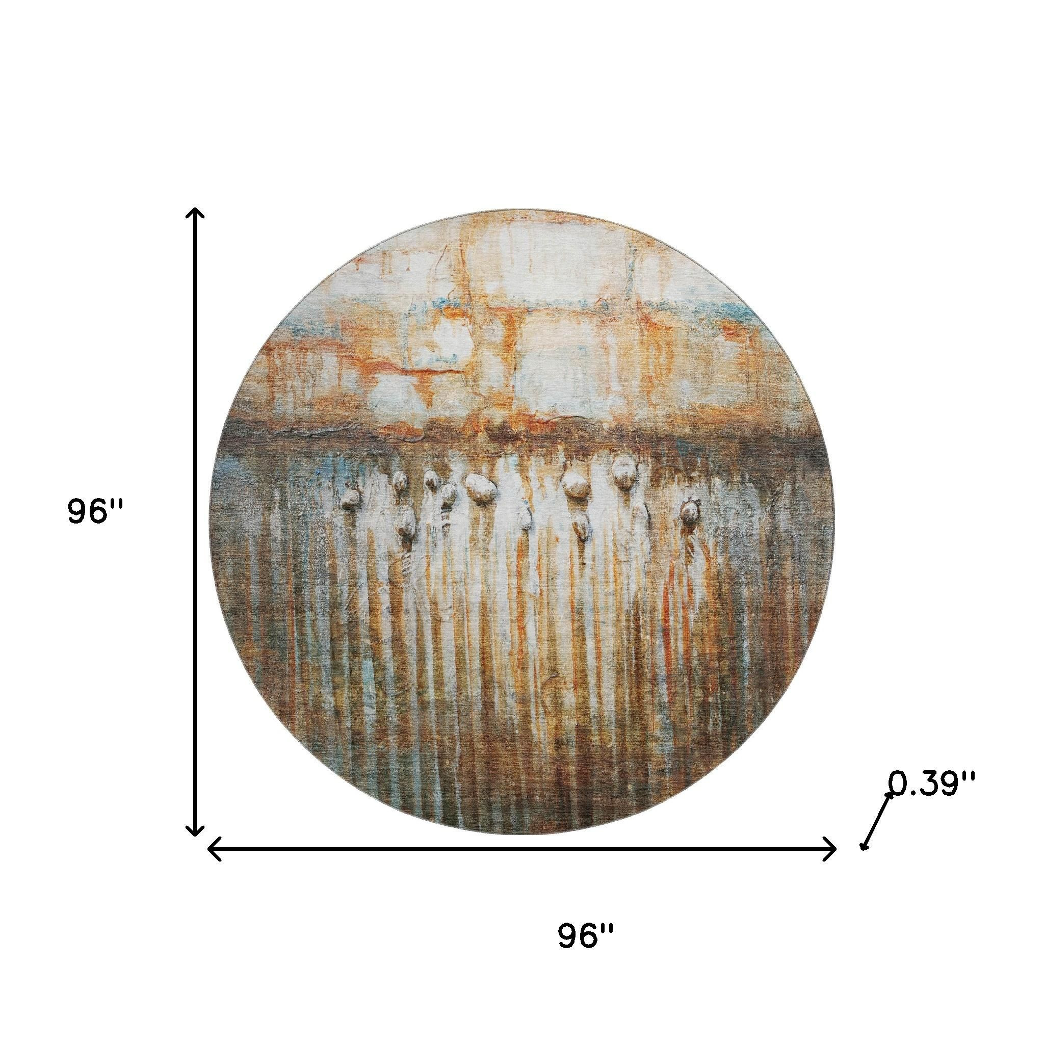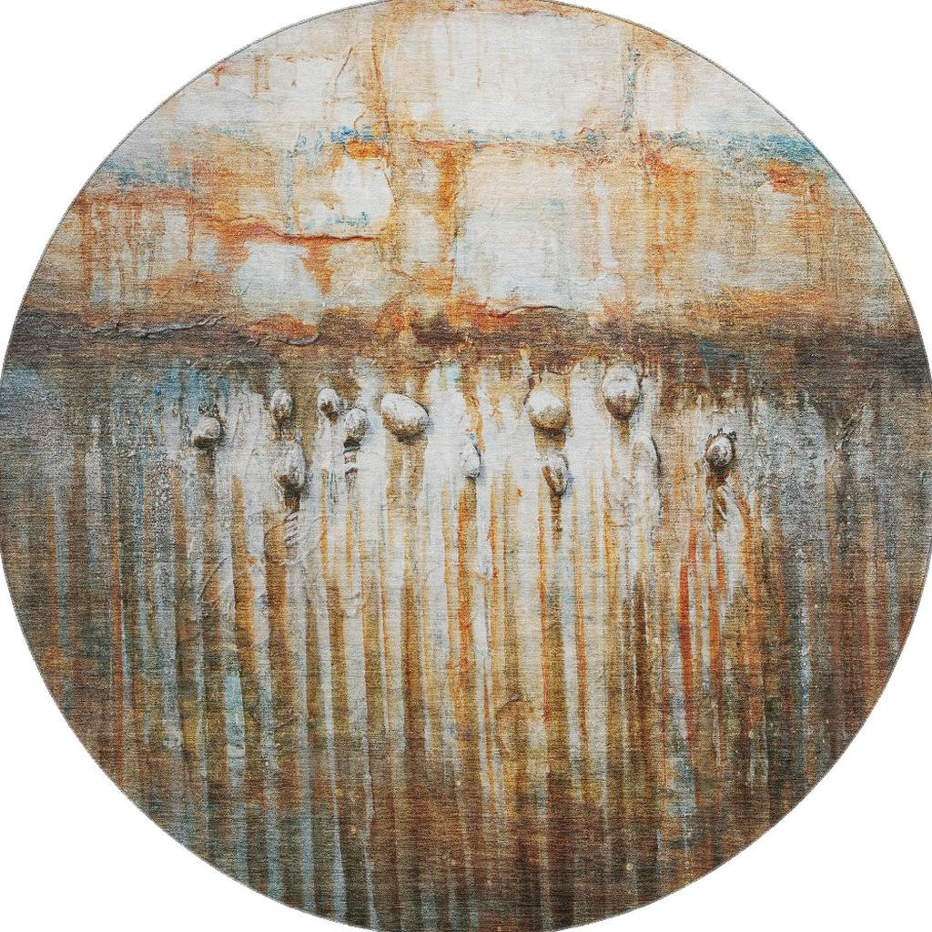 Add some artistry to your room with this 8-foot rust and gray abstract washable round rug with uv protection. Ideal for spaces with kids and pets, this rug is stain resistant to help repel dirt and spilled liquids. Built to last, this rug crafted from polyester fibers is known for its durability and long lasting appeal. Rugs are a great way to showcase your style, hide imperfections, warm your home and reduce noise. This larger sized, transitional styled rug is ready to create a focal point or statement piece in your room. 96.00-inch h x 96.00-inch w x 0.39-inch d.