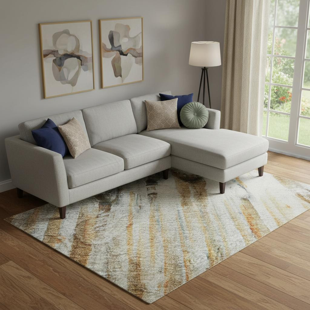 This 9-foot x 12-foot rust and gray abstract washable area rug with uv protection, is a great way to add warmth to a room. Ideal for spaces with kids and pets, this rug is stain resistant to help repel dirt and spilled liquids. Built to last, this rug crafted from polyester fibers is known for its durability and long lasting appeal. Rugs are a great way to showcase your style, hide imperfections, warm your home and reduce noise. This larger sized, transitional styled rug is ready to create a focal point or statement piece in your room. 108.00-inch h x 144.00-inch w x 0.39-inch d.