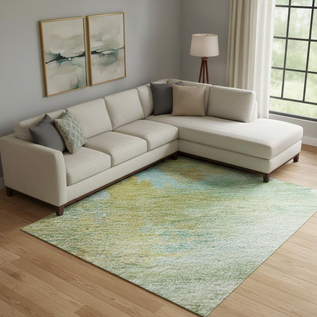 Set an inviting tone in your space with this 8-foot x 10-foot green and teal abstract washable area rug with uv protection. Ideal for spaces with kids and pets, this rug is stain resistant to help repel dirt and spilled liquids. Built to last, this rug crafted from polyester fibers is known for its durability and long lasting appeal. Rugs are a great way to showcase your style, hide imperfections, warm your home and reduce noise. This larger sized, transitional styled rug is ready to create a focal point or statement piece in your room. 96.00-inch h x 120.00-inch w x 0.39-inch d.