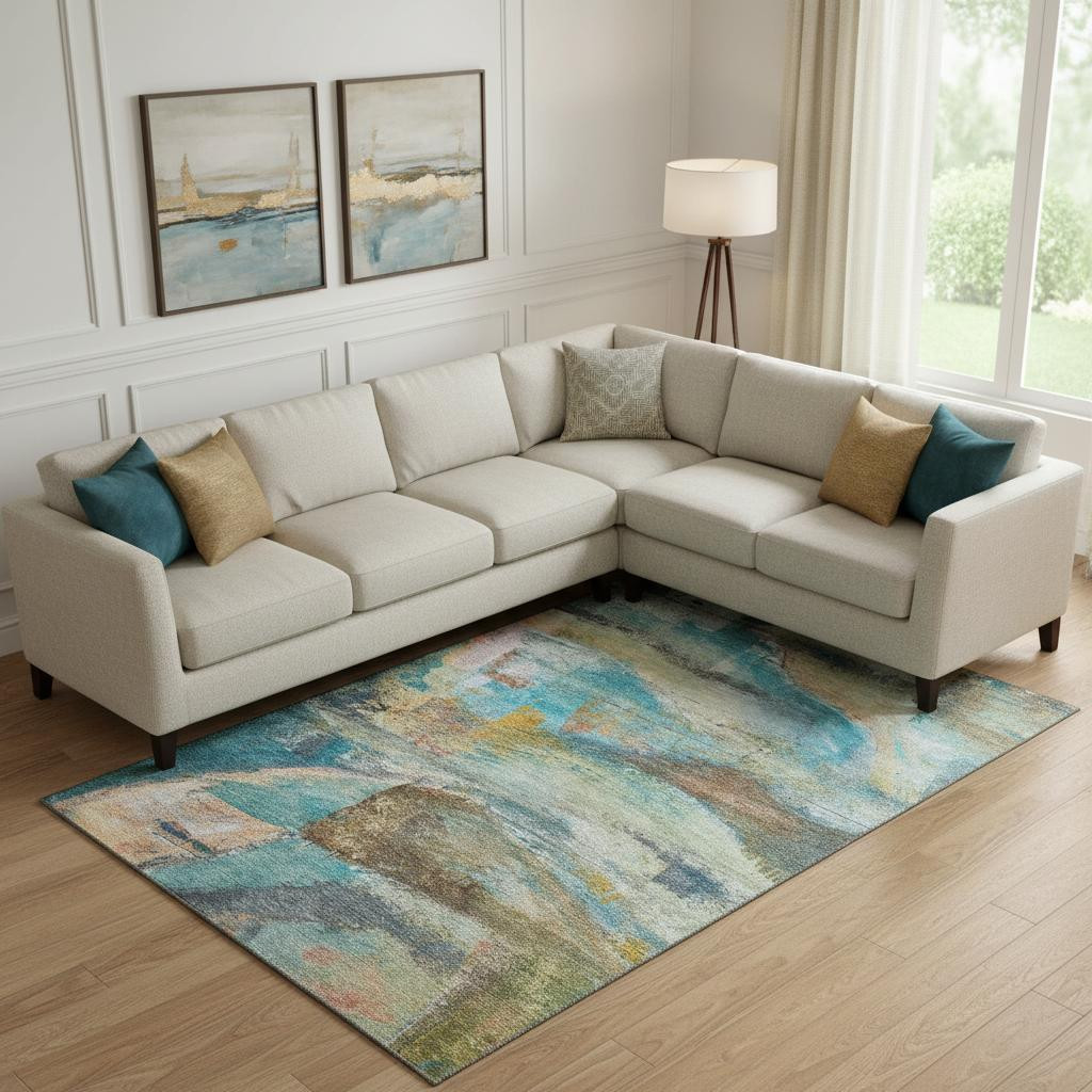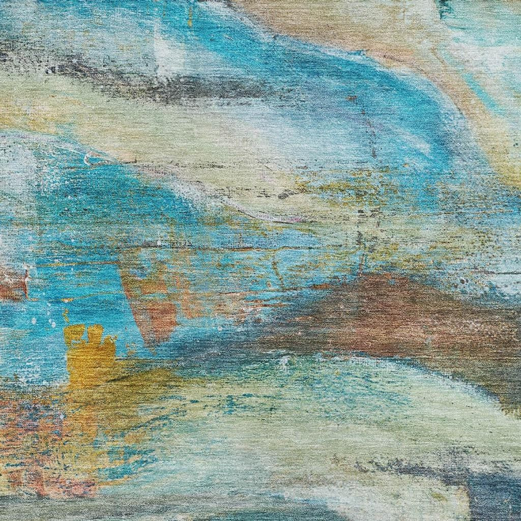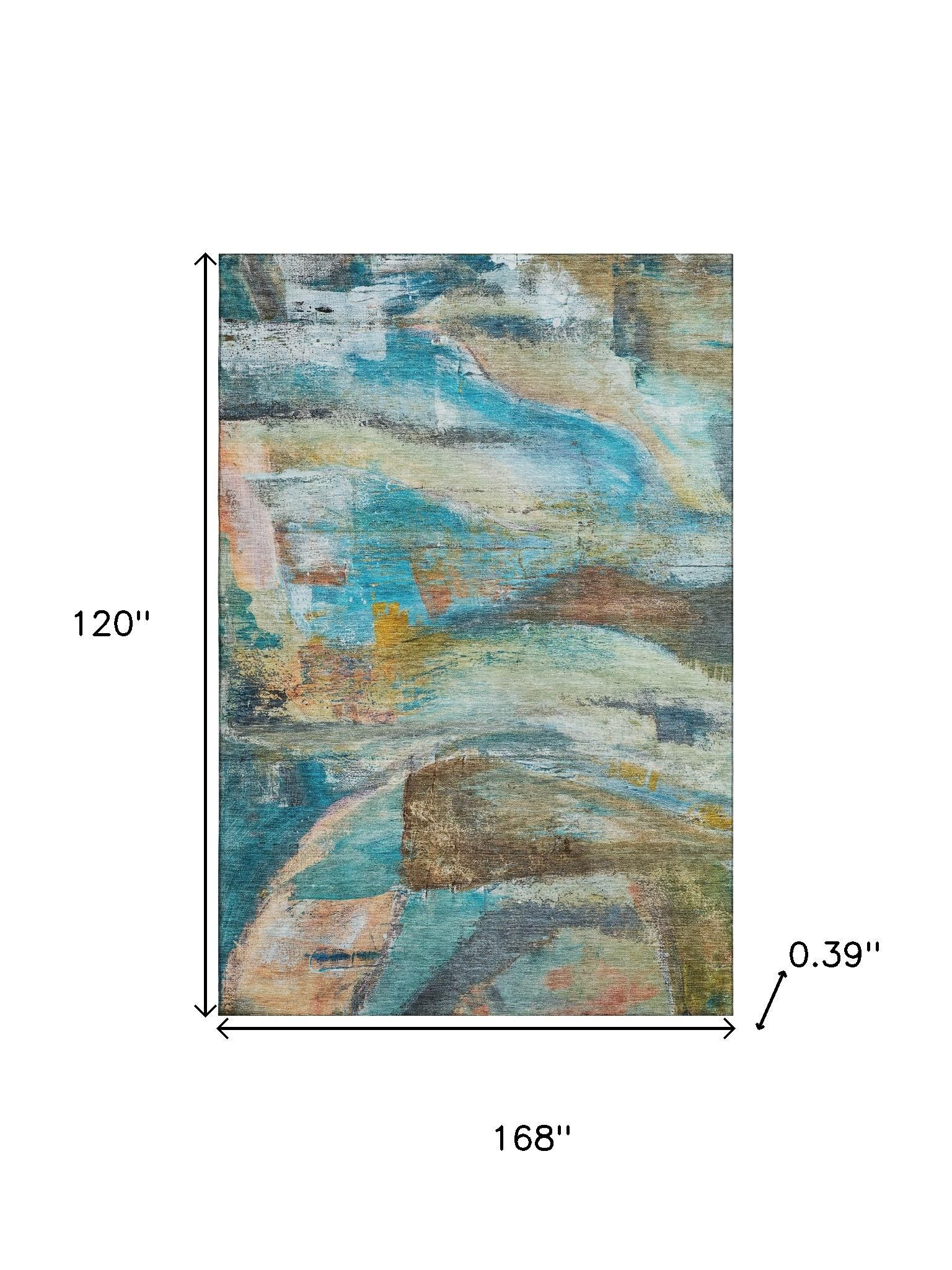 This 10-foot x 14-foot teal and beige abstract washable area rug with uv protection, is a great way to add warmth to a room. Ideal for spaces with kids and pets, this rug is stain resistant to help repel dirt and spilled liquids. Built to last, this rug crafted from polyester fibers is known for its durability and long lasting appeal. Rugs are a great way to showcase your style, hide imperfections, warm your home and reduce noise. This larger sized, transitional styled rug is ready to create a focal point or statement piece in your room. 120.00-inch h x 168.00-inch w x 0.39-inch d.