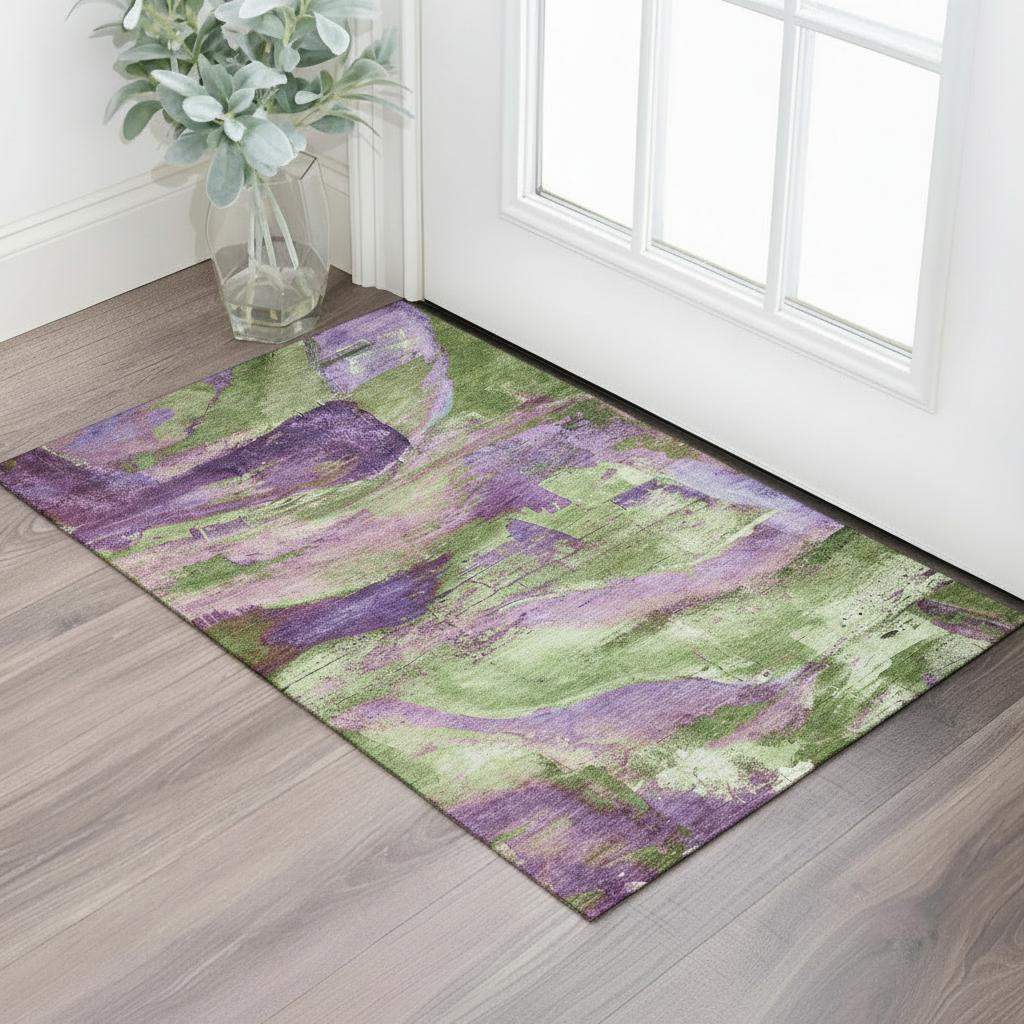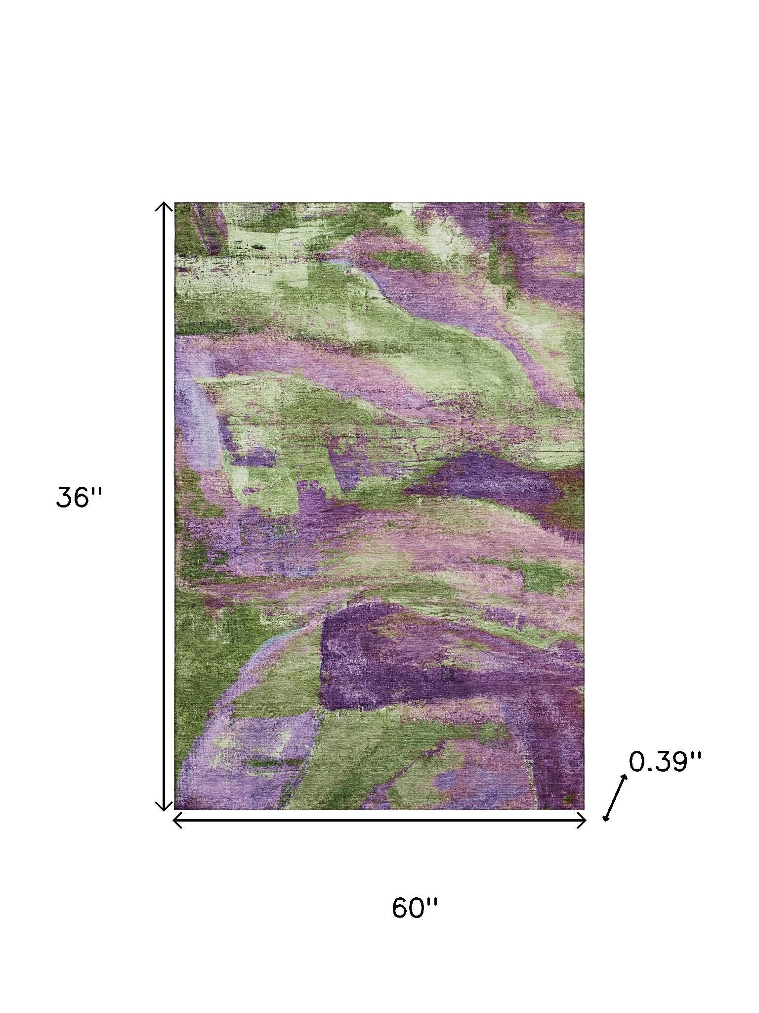 Set an inviting tone in your space with this 3-foot x 5-foot purple and green abstract washable area rug with uv protection. Ideal for spaces with kids and pets, this rug is stain resistant to help repel dirt and spilled liquids. Built to last, this rug crafted from polyester fibers is known for its durability and long lasting appeal. Rugs are a great way to showcase your style, hide imperfections, warm your home and reduce noise. This smaller sized, transitional styled rug is just what you need for your walkway, bedside, in front of door, cabinet, refrigerator, or chair. 36.00-inch h x 60.00-inch w x 0.39-inch d.