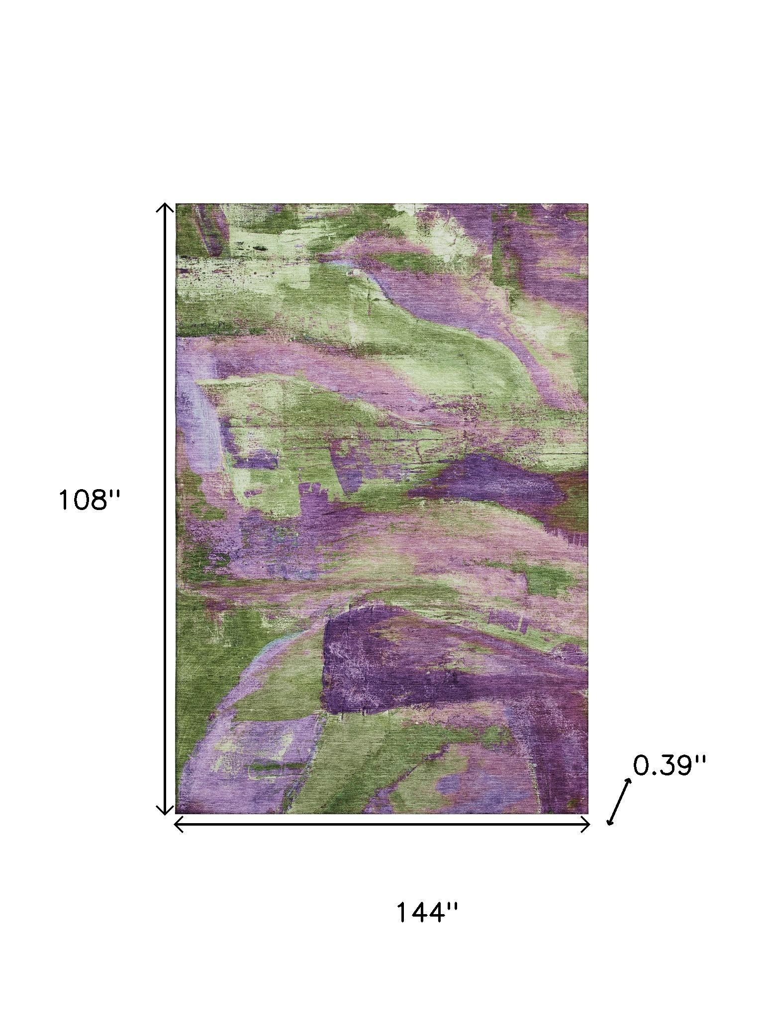 Set an inviting tone in your space with this 9-foot x 12-foot purple and green abstract washable area rug with uv protection. Ideal for spaces with kids and pets, this rug is stain resistant to help repel dirt and spilled liquids. Built to last, this rug crafted from polyester fibers is known for its durability and long lasting appeal. Rugs are a great way to showcase your style, hide imperfections, warm your home and reduce noise. This larger sized, transitional styled rug is ready to create a focal point or statement piece in your room. 108.00-inch h x 144.00-inch w x 0.39-inch d.