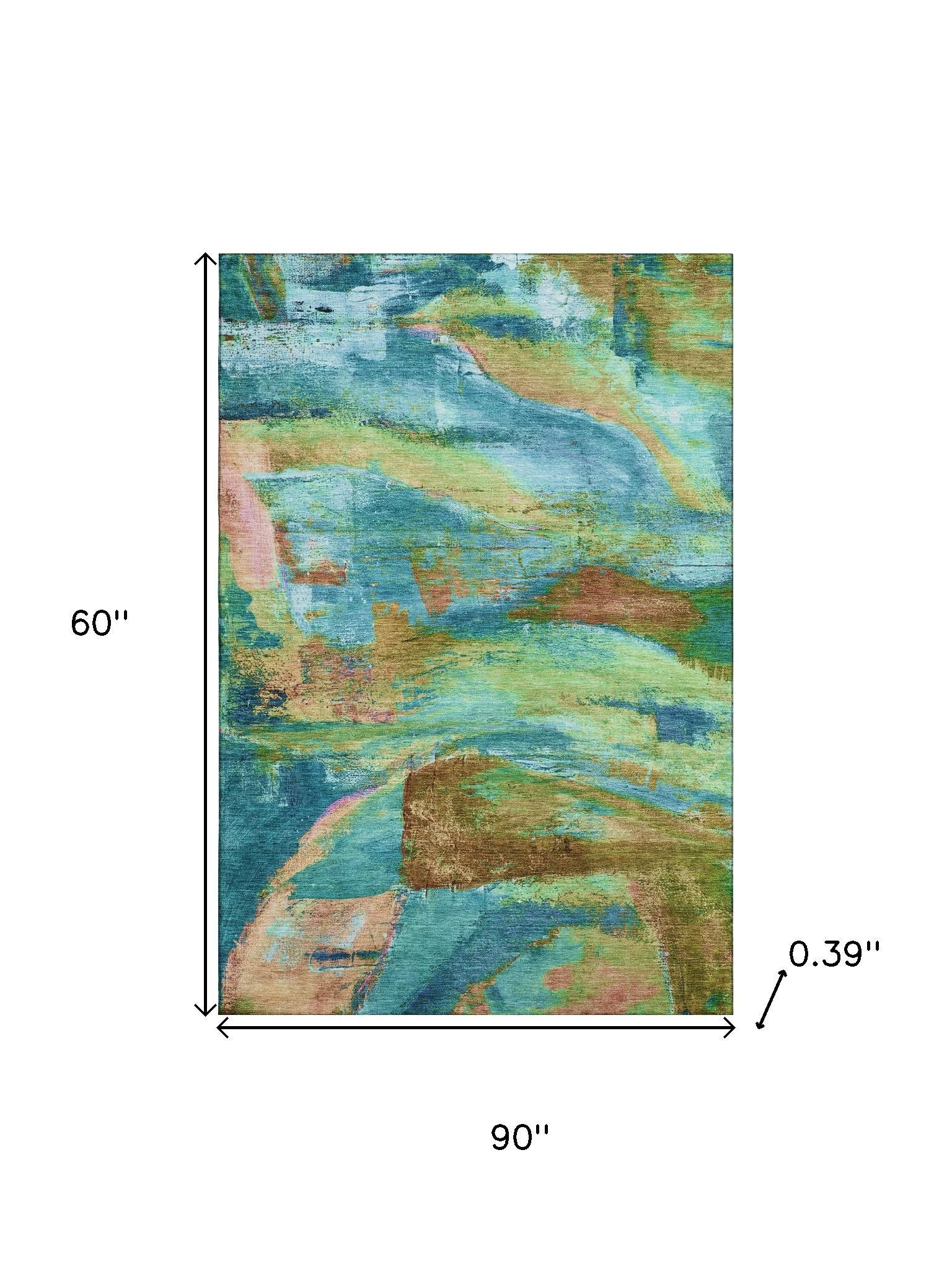 Set an inviting tone in your space with this 5-foot x 8-foot teal and blush abstract washable area rug with uv protection. Ideal for spaces with kids and pets, this rug is stain resistant to help repel dirt and spilled liquids. Built to last, this rug crafted from polyester fibers is known for its durability and long lasting appeal. Rugs are a great way to showcase your style, hide imperfections, warm your home and reduce noise. This larger sized, transitional styled rug is ready to create a focal point or statement piece in your room. 60.00-inch h x 90.00-inch w x 0.39-inch d.