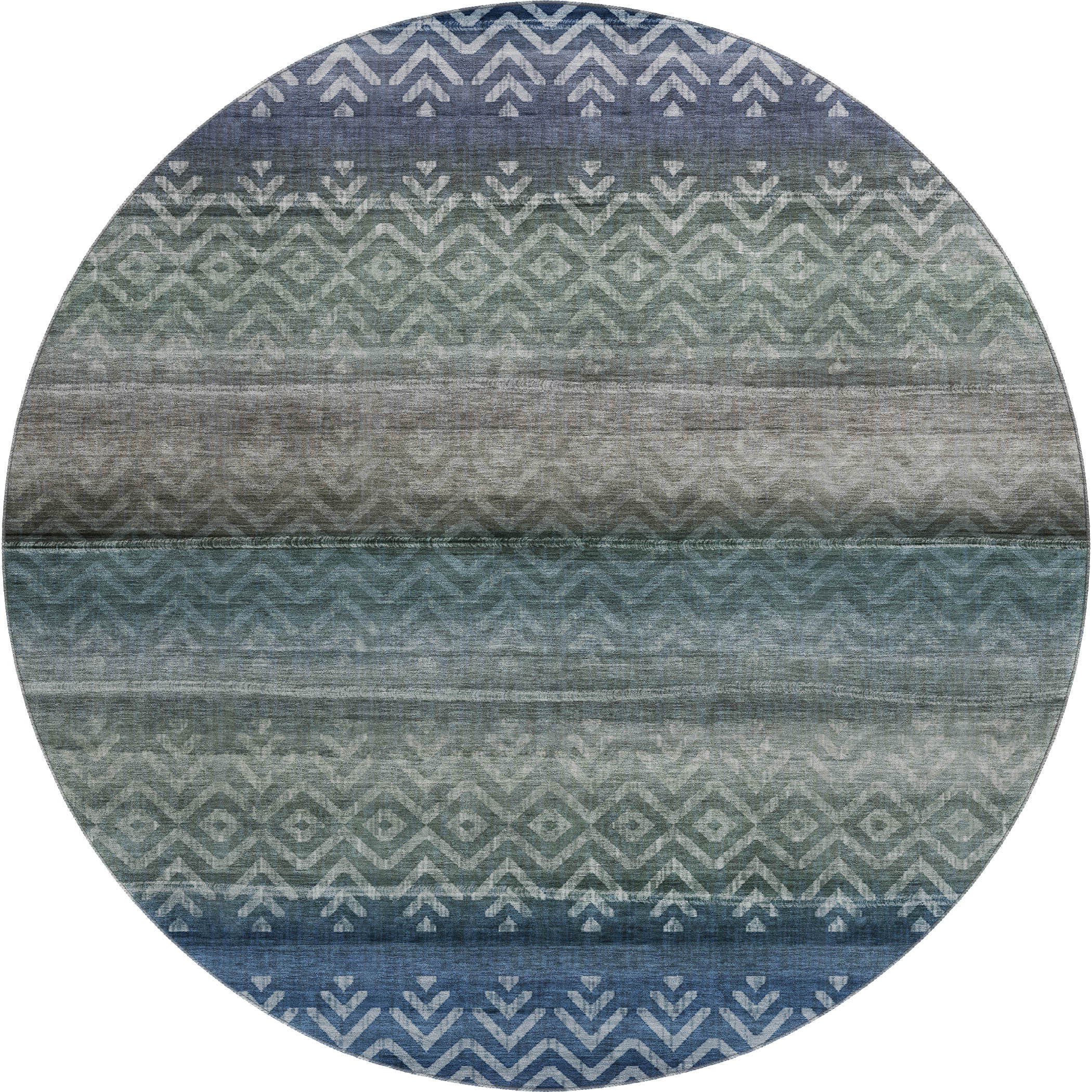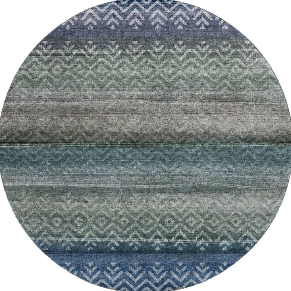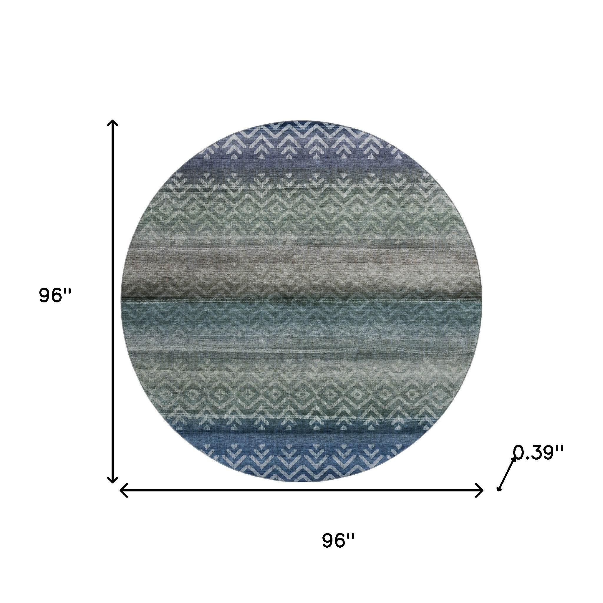 This 8-foot blue and gray geometric washable round rug with uv protection, is a great way to add warmth to a room. Ideal for spaces with kids and pets, this rug is stain resistant to help repel dirt and spilled liquids. Built to last, this rug crafted from polyester fibers is known for its durability and long lasting appeal. Rugs are a great way to showcase your style, hide imperfections, warm your home and reduce noise. This larger sized, transitional styled rug is ready to create a focal point or statement piece in your room. 96.00-inch h x 96.00-inch w x 0.39-inch d.