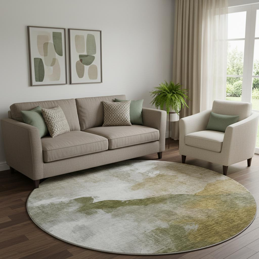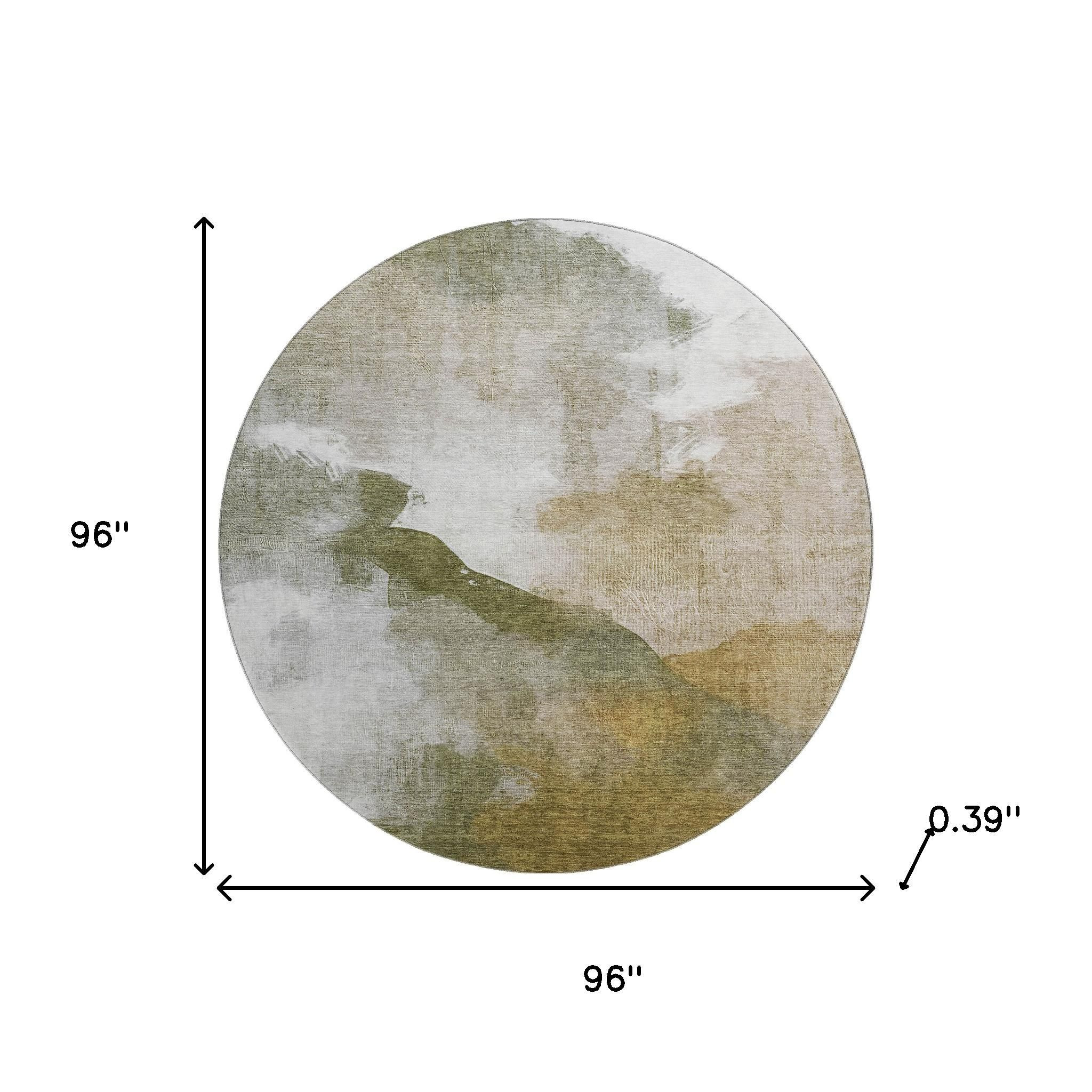Set an inviting tone in your space with this 8-foot green and ivory abstract washable round rug with uv protection. Ideal for spaces with kids and pets, this rug is stain resistant to help repel dirt and spilled liquids. Built to last, this rug crafted from polyester fibers is known for its durability and long lasting appeal. Rugs are a great way to showcase your style, hide imperfections, warm your home and reduce noise. This larger sized, transitional styled rug is ready to create a focal point or statement piece in your room. 96.00-inch h x 96.00-inch w x 0.39-inch d.