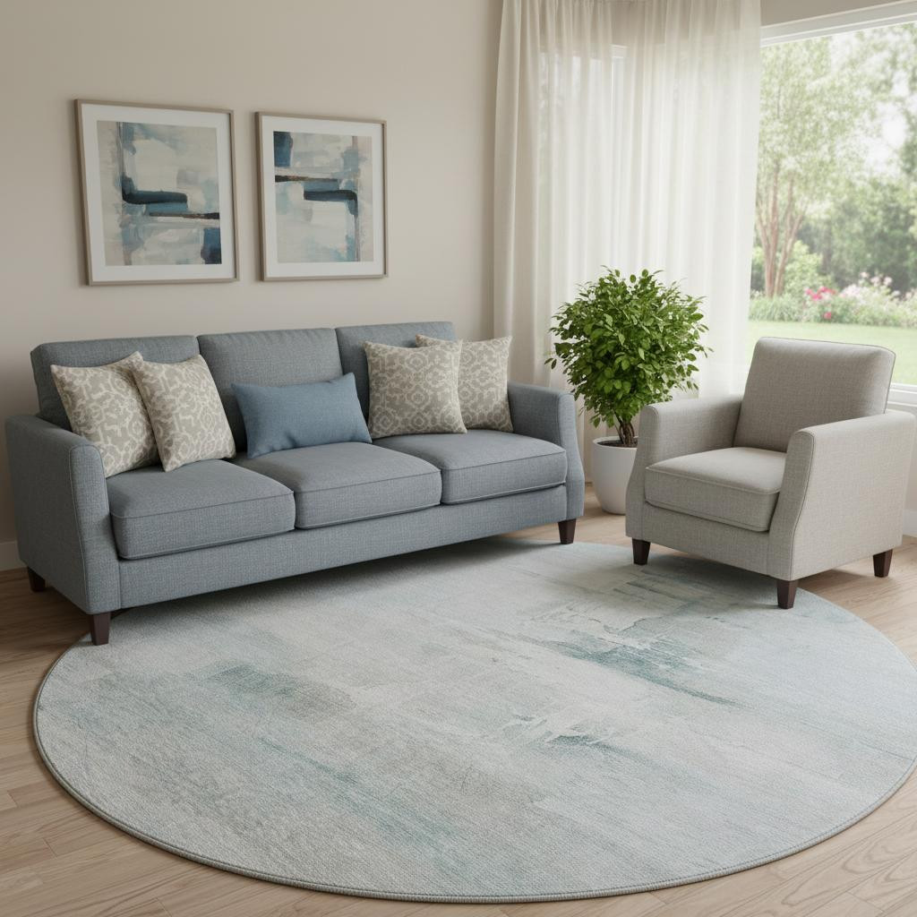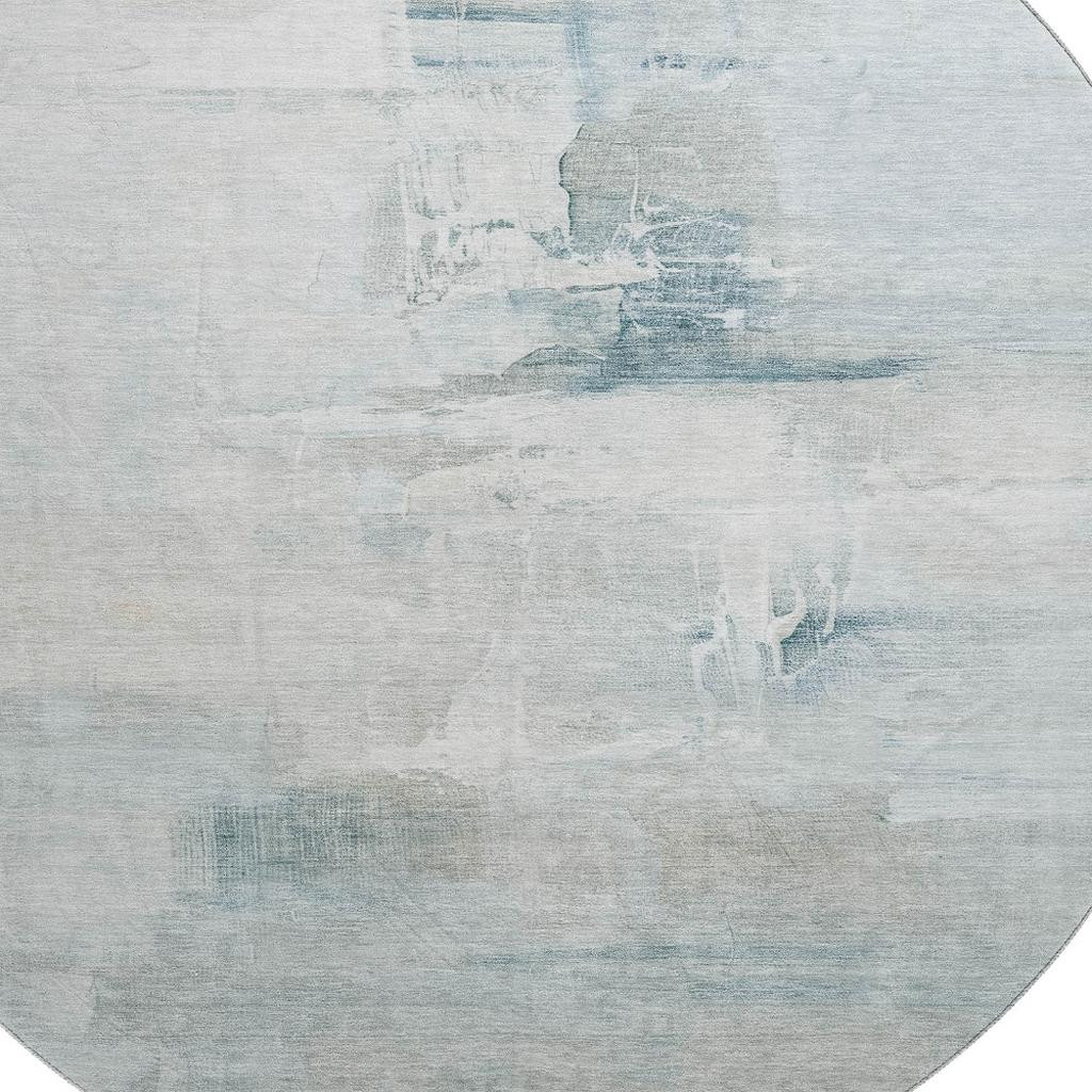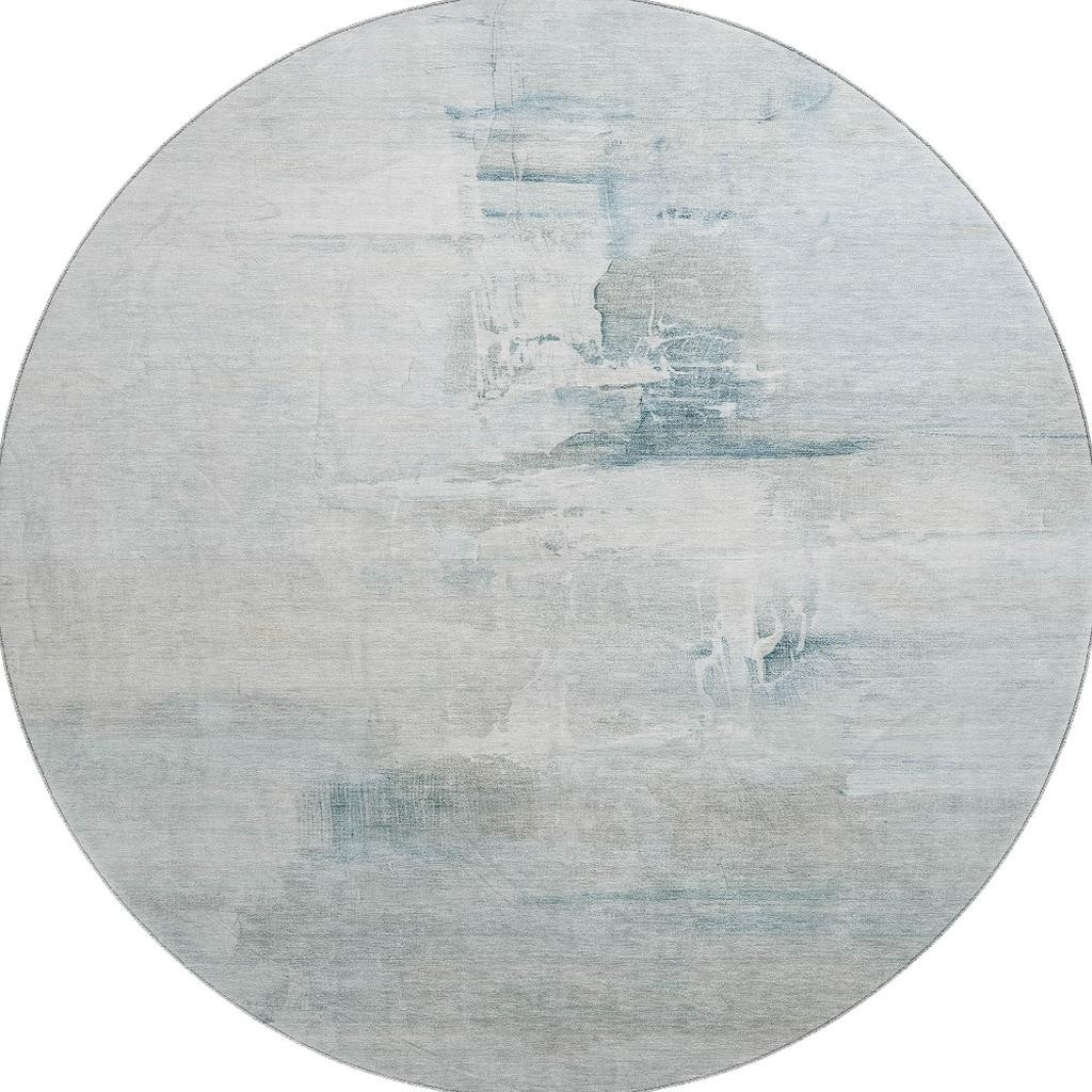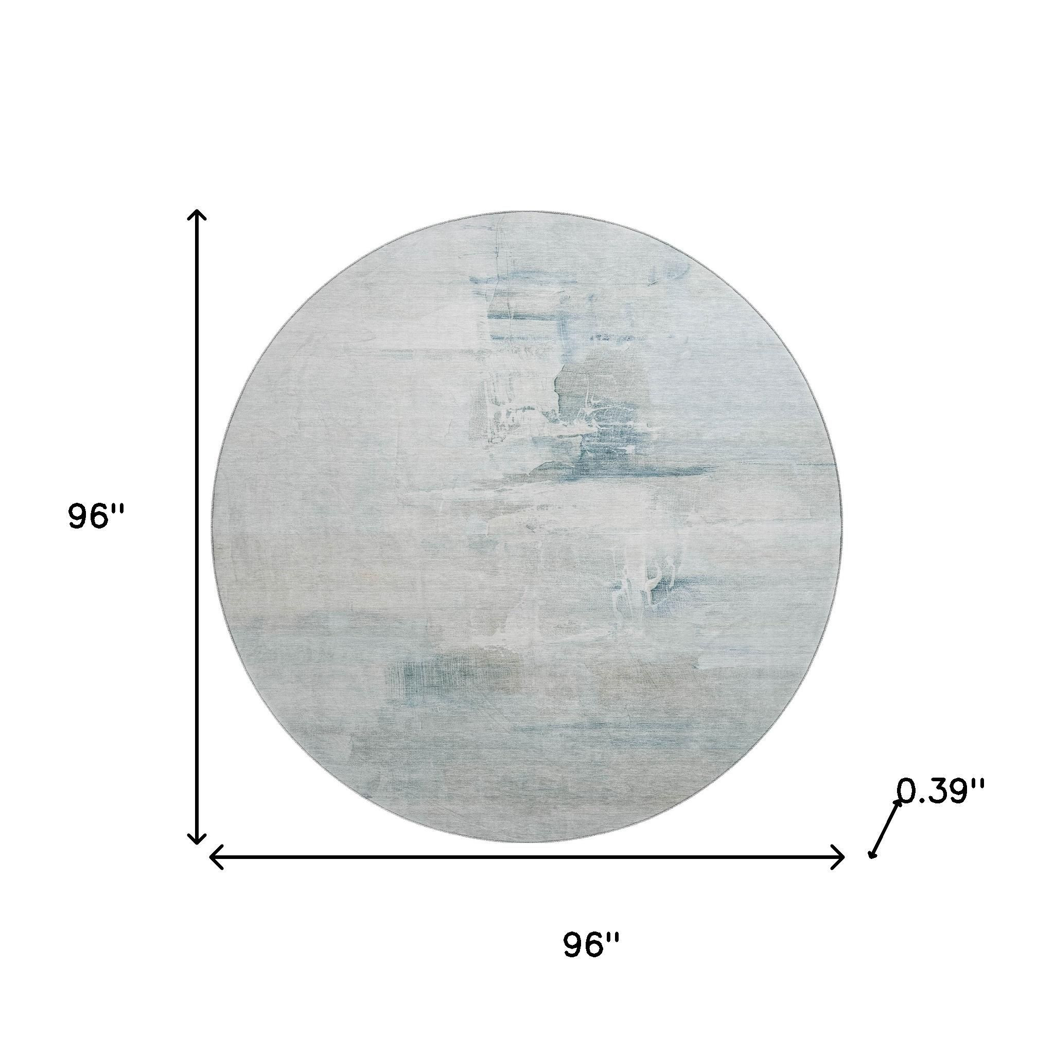 Set an inviting tone in your space with this 8-foot sky blue and ivory abstract washable round rug with uv protection. Ideal for spaces with kids and pets, this rug is stain resistant to help repel dirt and spilled liquids. Built to last, this rug crafted from polyester fibers is known for its durability and long lasting appeal. Rugs are a great way to showcase your style, hide imperfections, warm your home and reduce noise. This larger sized, transitional styled rug is ready to create a focal point or statement piece in your room. 96.00-inch h x 96.00-inch w x 0.39-inch d.