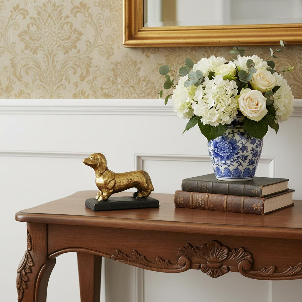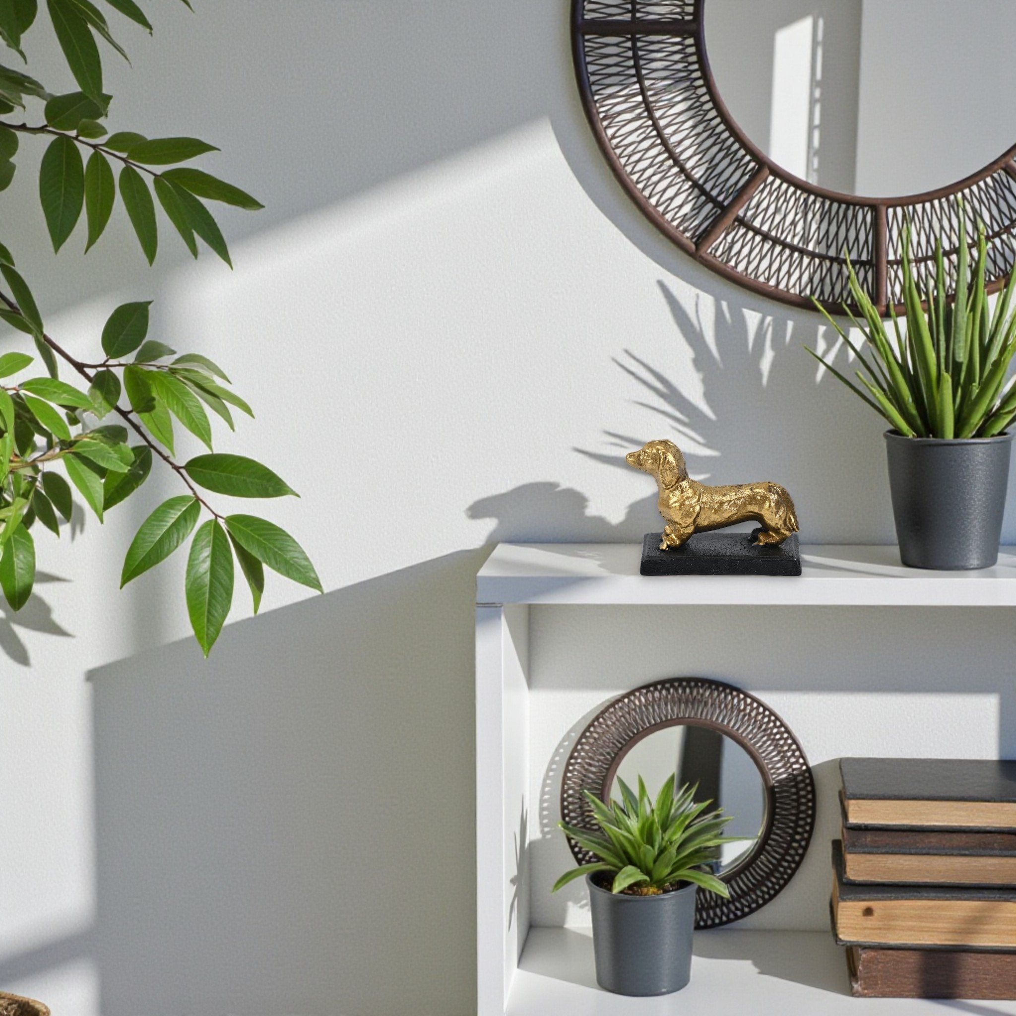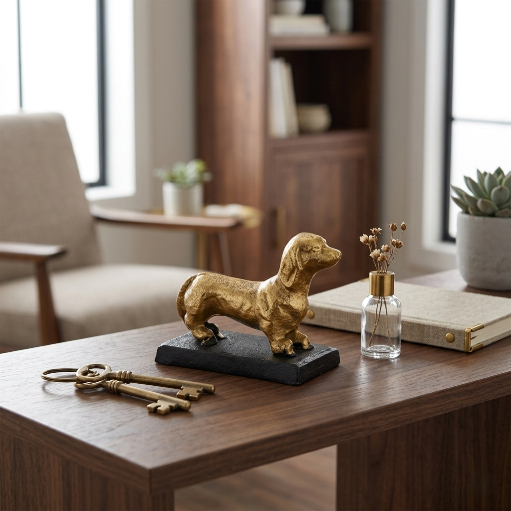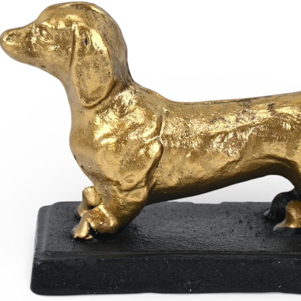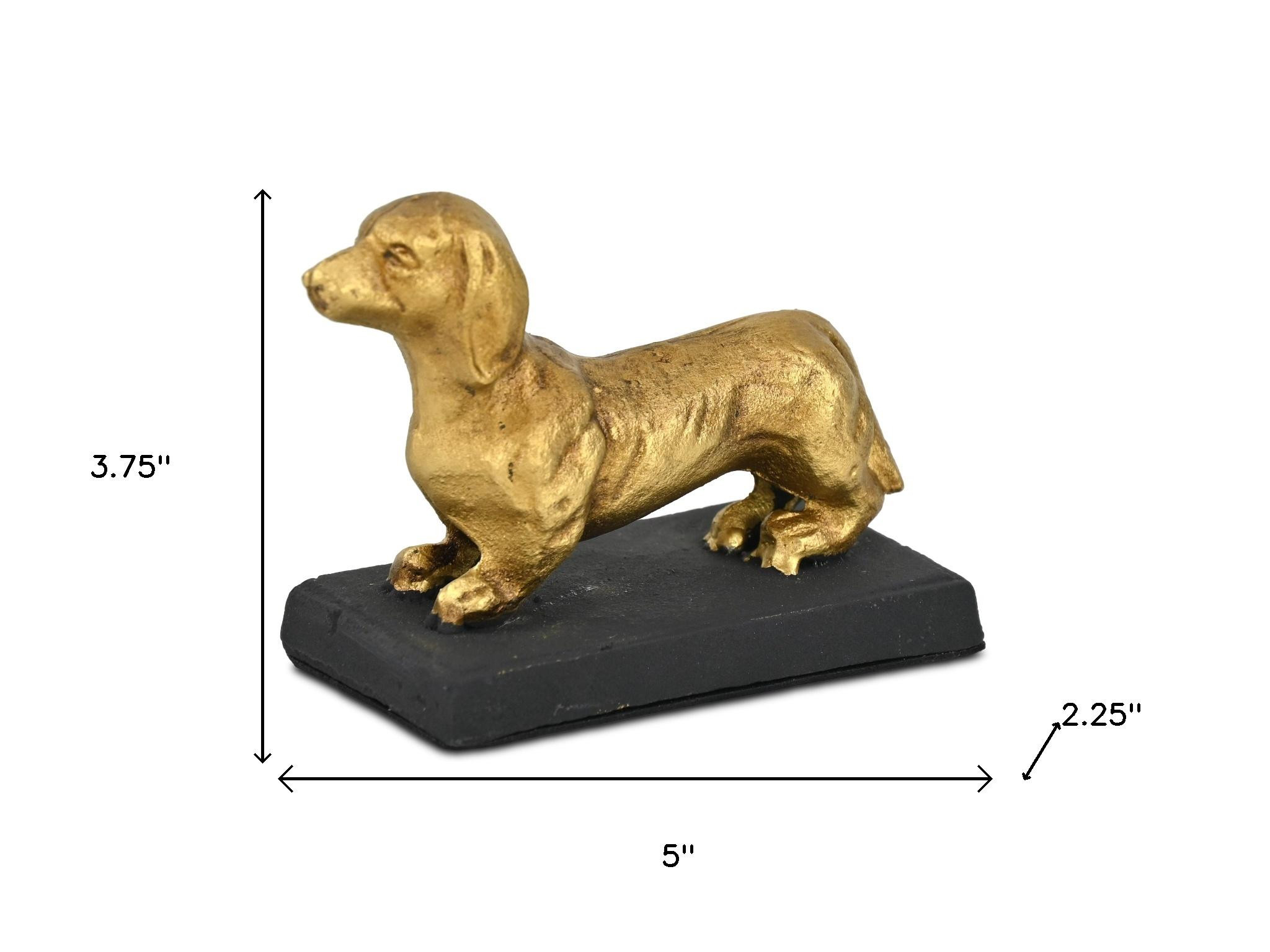 Unique and decorative, this 4-inch gold cast iron dog hand painted figurine will leave a lasting impression. This adorable dog inspired sculpture will hold a special place in your heart. Great to use on its own or mix with other decorations for the perfect look. 3.75-inch h x 5.00-inch w x 2.25-inch d.
