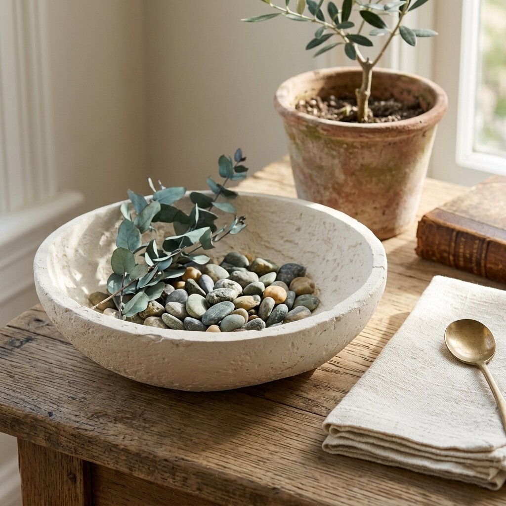 This 3-inch beige cement hand painted decorative bowl will add a beautiful decorative accent to your decor. It's a perfect addition for those who love an up-to-the-minute look and feel. The unique handmade craftsmanship ensures that each piece is distinct and full of character. With its elegant design, this bowl enhances any space while showcasing artistic flair. Its sturdy cement construction provides durability, making it a lasting addition to your collection. Display it on a shelf or table to create a stunning focal point in your home. 3.00-inch h x 11.50-inch w x 11.50-inch d.