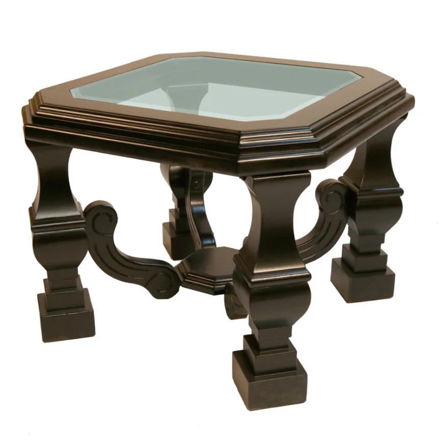 Show off your exquisite taste with this 24-inch espresso brown and clear wood and glass square end table. The dark espresso brown coloration of the high quality scrollwork carved solid wood base marries nicely with the clear glass top. The purposefully distressed finish gives this table an authentically rustic feel. A great accent on either side of the sofa or bed, this adorable end or side table is just what you need. This versatile table is a great accent for most any room. 24.00-inch h x 30.00-inch w x 28.00-inch d.