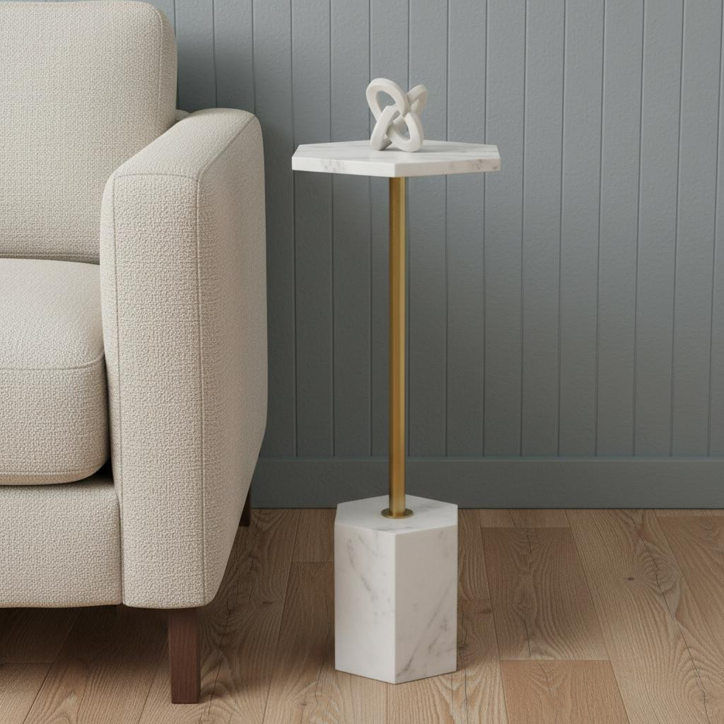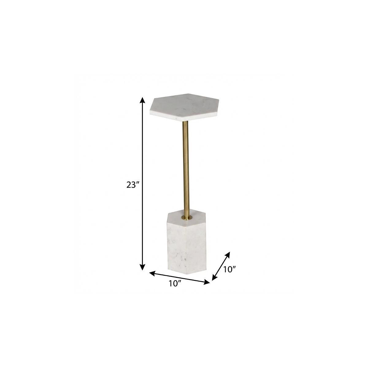 Show off your exquisite taste with this 23-inch white and gold marble and iron hexagonal pedestal end table. Made of iron and marble, the white coloration throughout gives this piece an updated and refreshing look. A great accent on either side of the sofa or bed, this adorable end or side table is just what you need. You can match it with other pieces to get the ideal look for your place. 23.00-inch h x 10.00-inch w x 10.00-inch d.