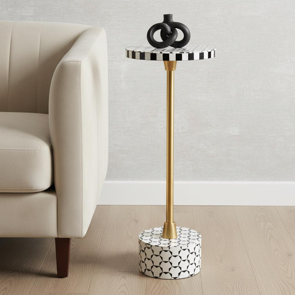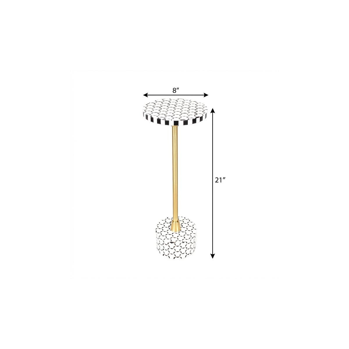 Optimize your space and add some charm to your room with the 21-inch black white and gold faux marble and iron oval pedestal end table. Quality construction from the gold iron base combines with black and white faux marble of the top to give this table a fresh and updated look. A great accent on either side of the sofa or bed, this adorable end or side table is just what you need. You can match it with other pieces to get the ideal look for your place. 21.00-inch h x 8.00-inch w x 8.00-inch d.