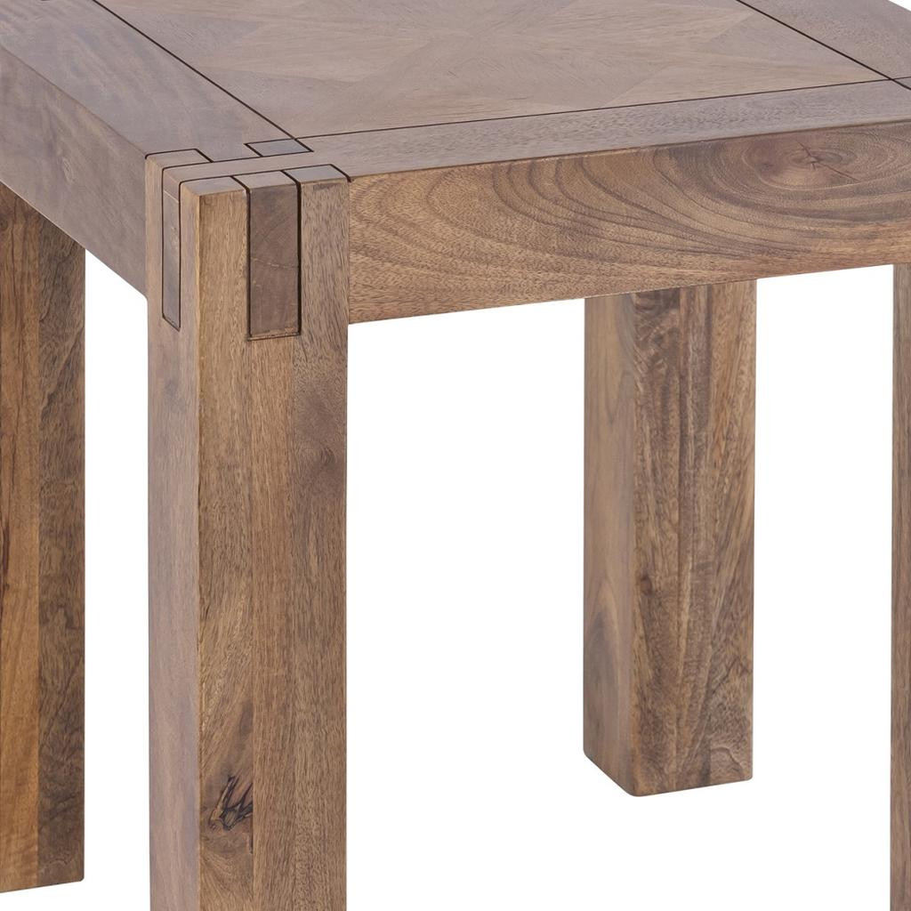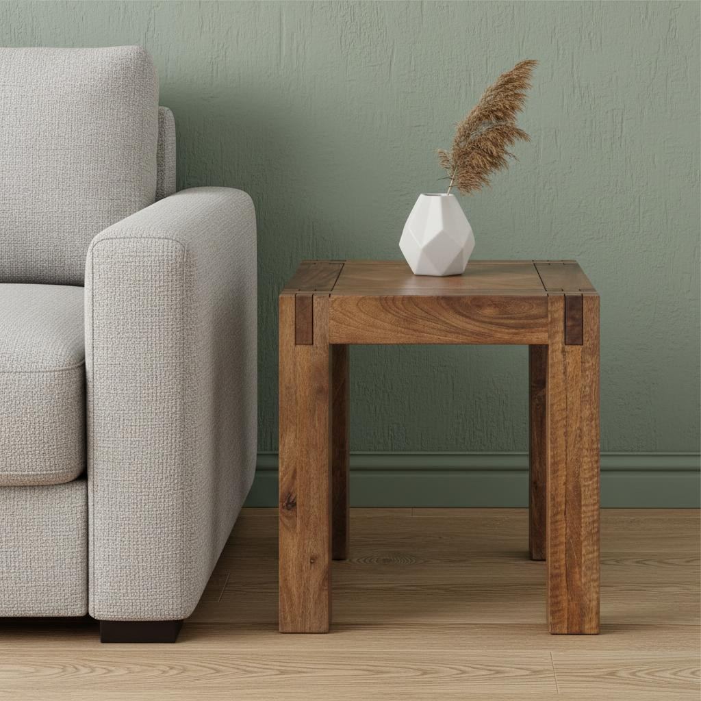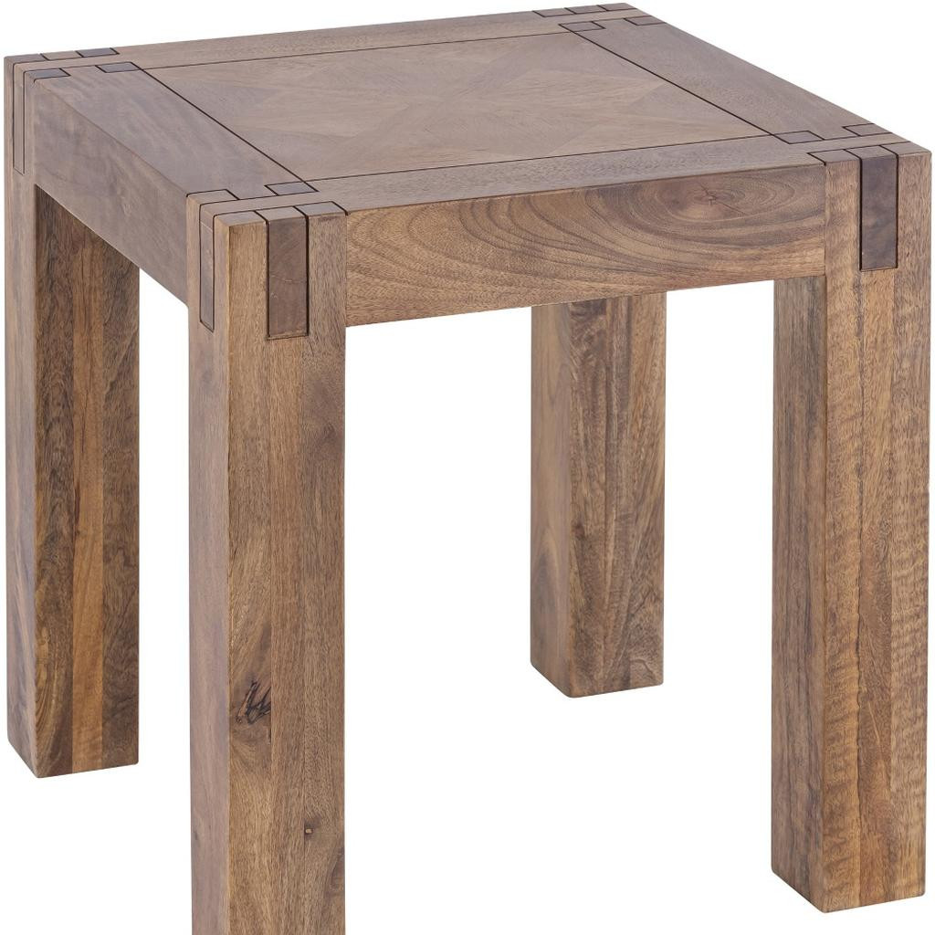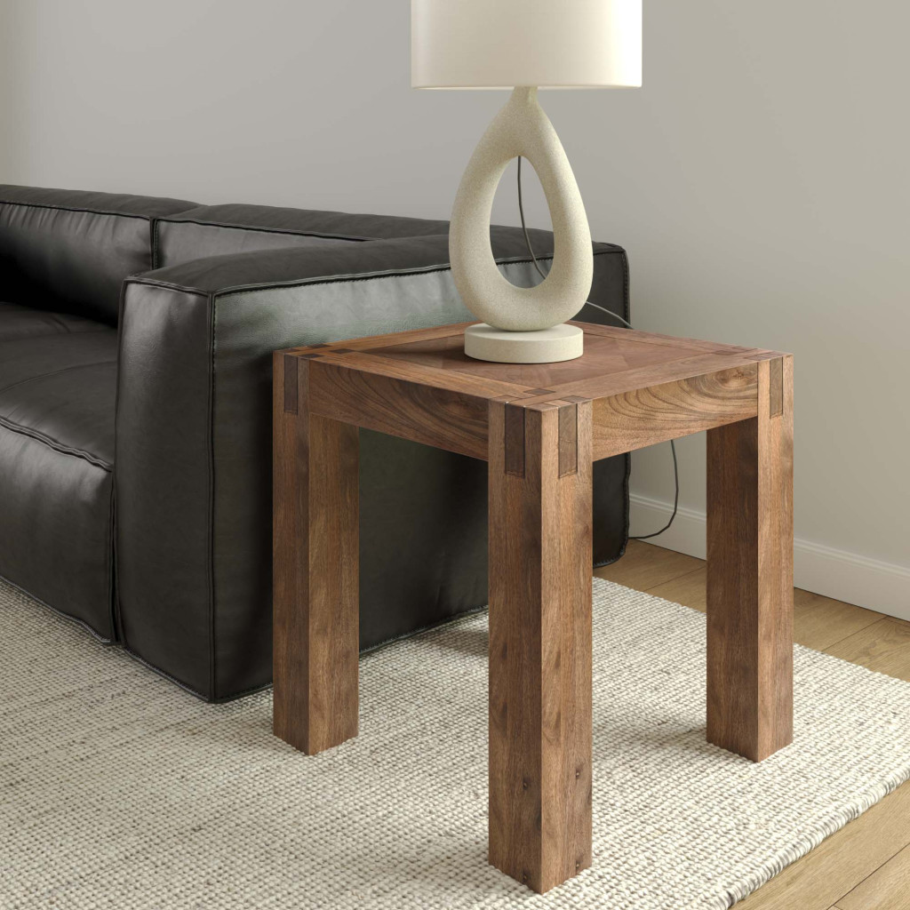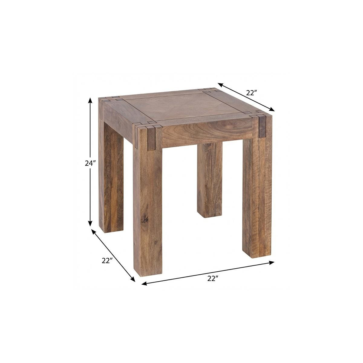 Distinctive in style the 24-inch brown solid wood square end table radiates a versatile charm. Made of solid wood, the brown coloration throughout gives this piece an updated and refreshing look. Side tables are a great way to flank your sofa, use as an accent next to your favorite chair, or can even be used bedside. This versatile table is a great accent for most any room. 24.00-inch h x 22.00-inch w x 22.00-inch d.
