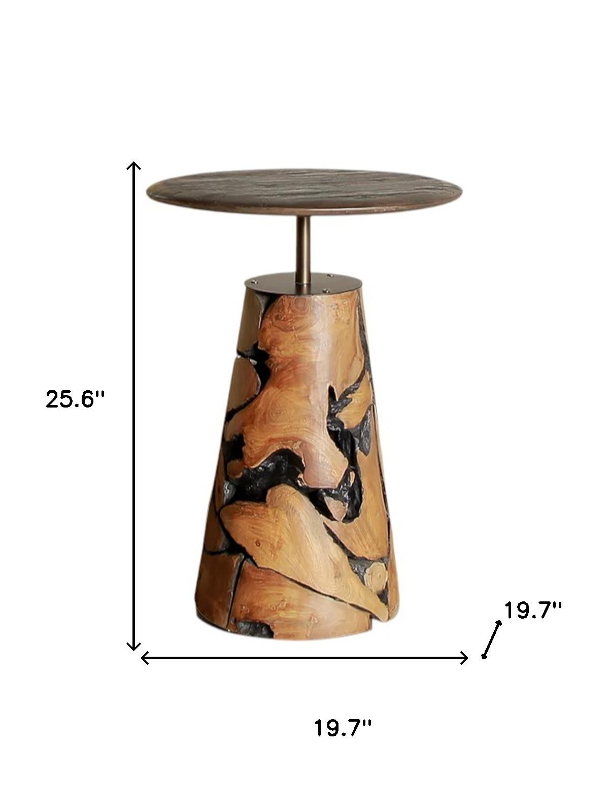Show off your exquisite taste with this 26-inch natural distressed reclaimed wood round pedestal end table. This unique and stylish table is made from reclaimed wood and features a tree trunk slab style pedestal base and a round top surface. The purposefully distressed finish gives this table an authentically rustic and artisanal feel. An ideal location for placing your snacks and drinks, and a place to keep your lamp, frames, or other accessories. This versatile hand crafted unique, one of a kind table is a great accent for most any room. 25.60-inch h x 19.70-inch w x 19.70-inch d.