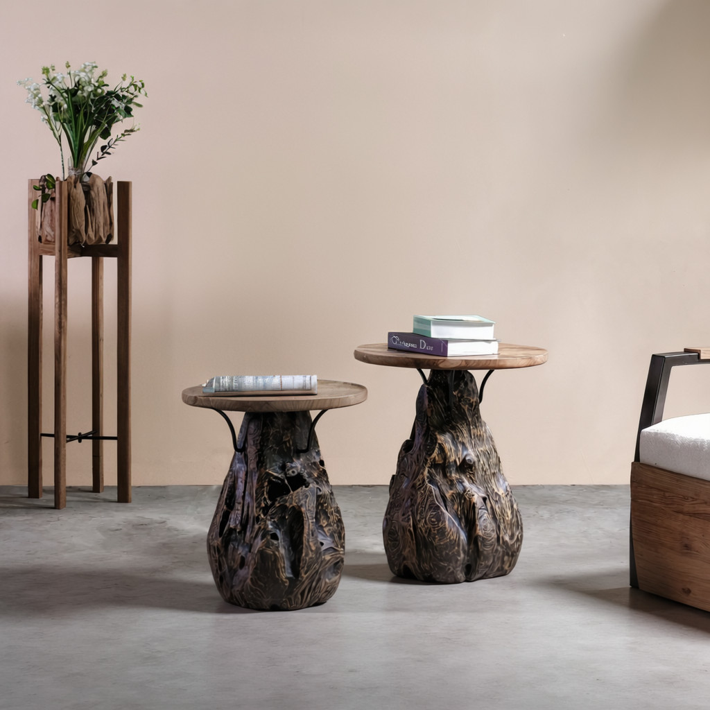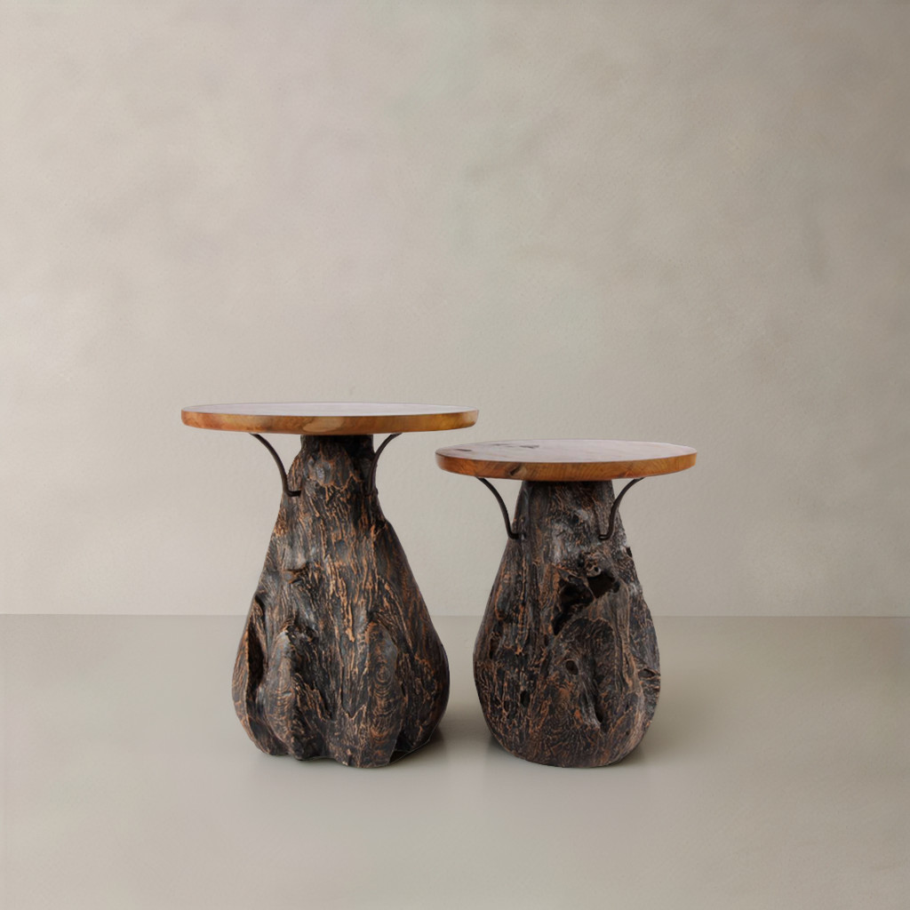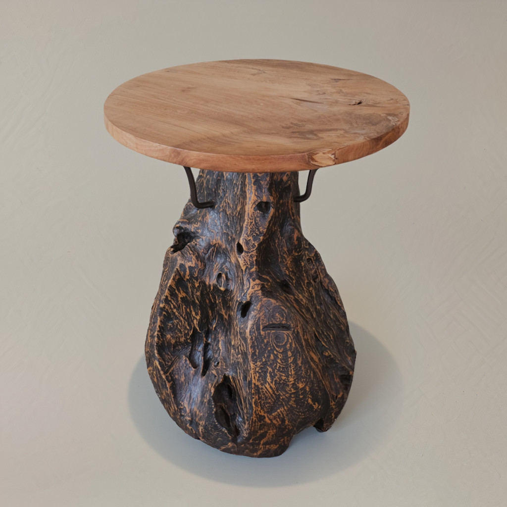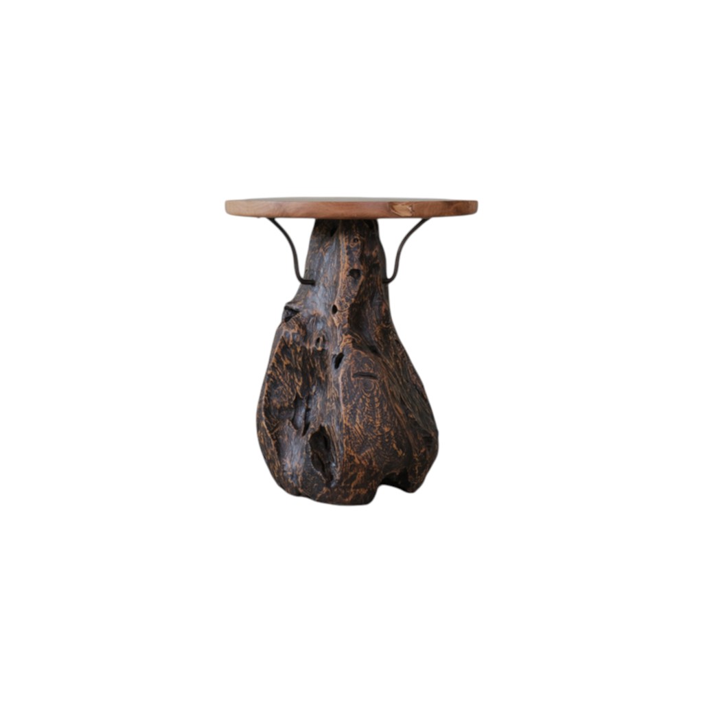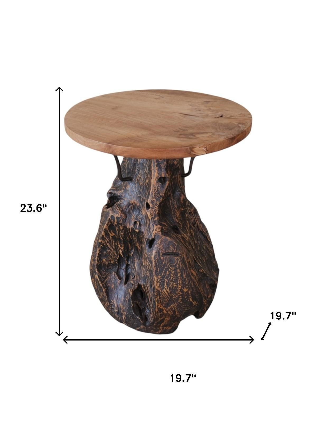 Optimize your space and add some charm to your room with the 24-inch natural and smoky black distressed reclaimed wood round pedestal end table. The top of this reclaimed wood table is natural colored and features a live edge, while the base is crafted from super unique gnarled up reclaimed teak root in a dark smoky black ebony finish. The purposefully distressed finish gives this table an authentically rustic feel. Side tables are a great way to flank your sofa, use as an accent next to your favorite chair, or can even be used bedside. This versatile table is a great accent for most any room. 23.60-inch h x 19.70-inch w x 19.70-inch d.