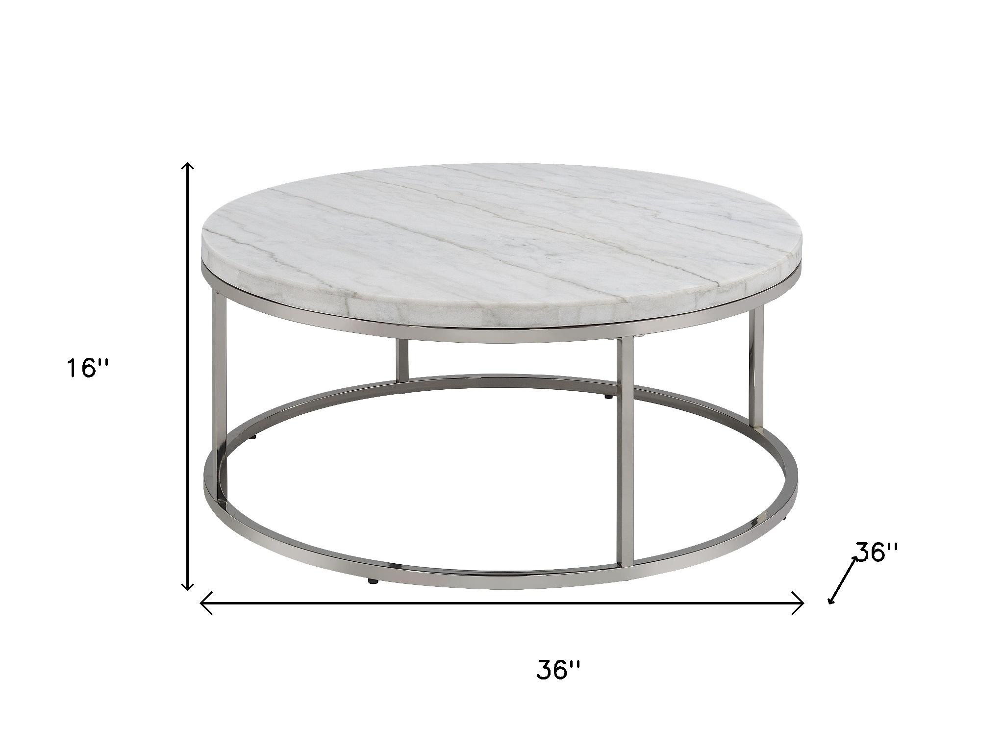 This stylish 36-inch natural and nickel genuine marble and steel round frame coffee table is sure to inspire compliments no matter where it sits. The nickel coloration of the high quality steel base marries nicely with the natural genuine marble top surface. If you're looking for something that can fit into a living area, bedroom, or office, this coffee table is for you. 16.00-inch h x 36.00-inch w x 36.00-inch d.