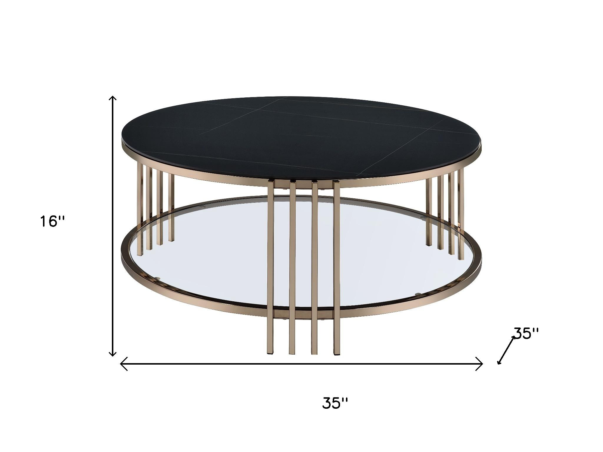 Make a statement with the 35-inch black and champagne sintered stone and steel round coffee table and infuse a dash of character and personality into your space. The black sintered stone top of this table is a nice visual contrast to the high quality, champagne steel of the base. It has an attractive design that will definitely breathe some fresh air into your interior. 16.00-inch h x 35.00-inch w x 35.00-inch d.