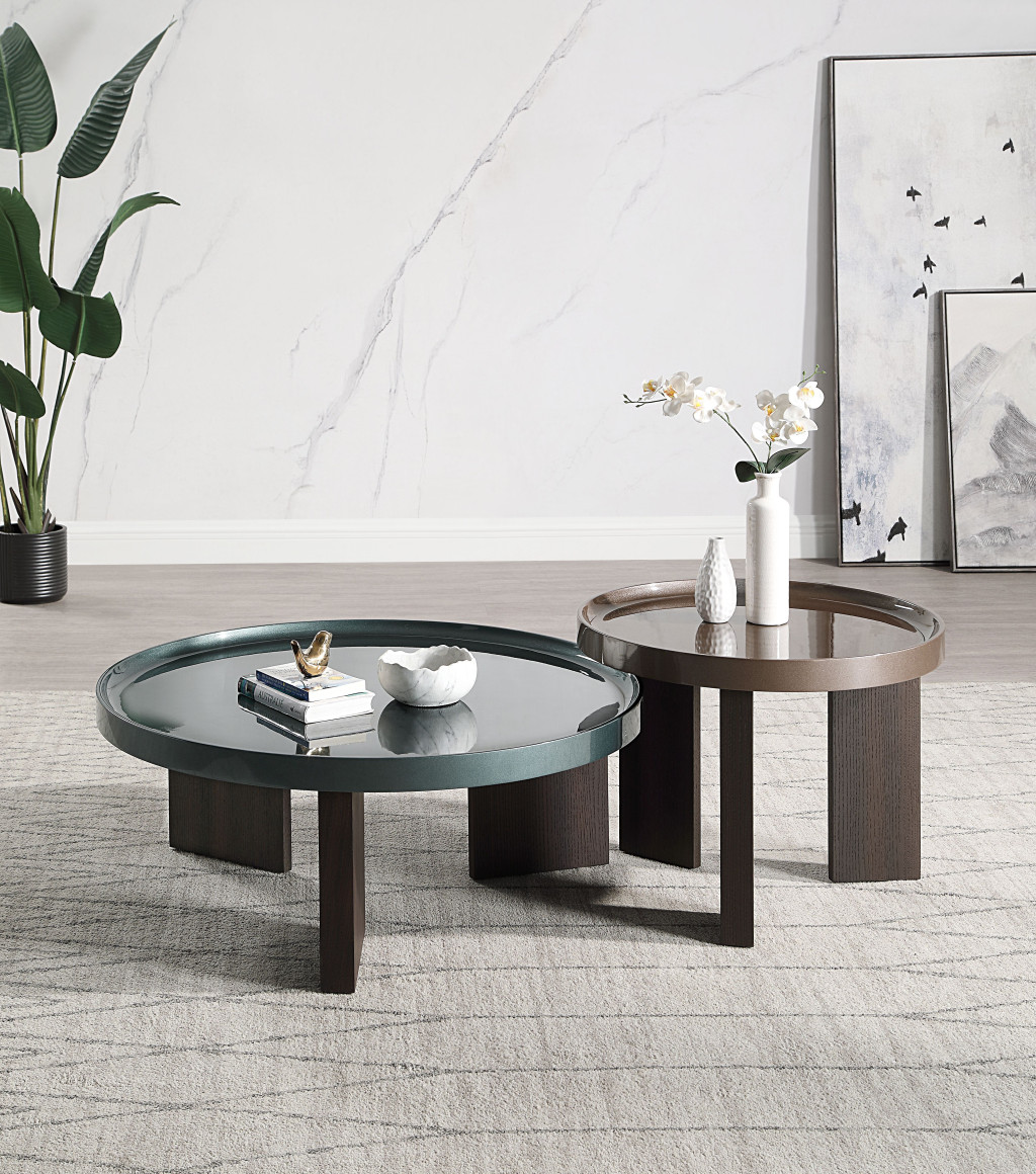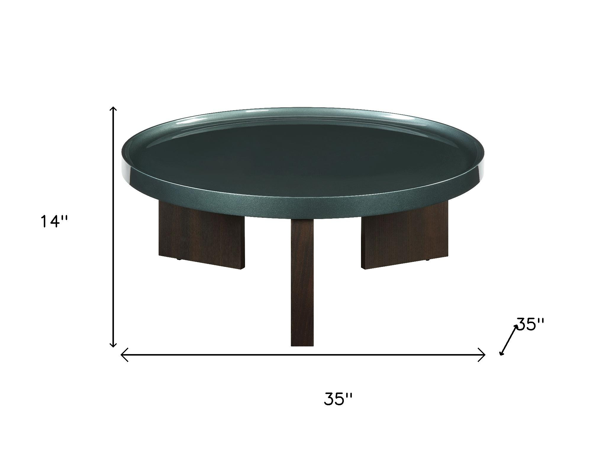 This stylish 35-inch dark green and oak wood round coffee table is not only practical, but good looking and built to last. A oak solid and manufactured wood frame is finished off with a dark green manufactured wood top that is the epitome of quality construction and design. It has an attractive design that will definitely breathe some fresh air into your interior. 14.00-inch h x 35.00-inch w x 35.00-inch d.
