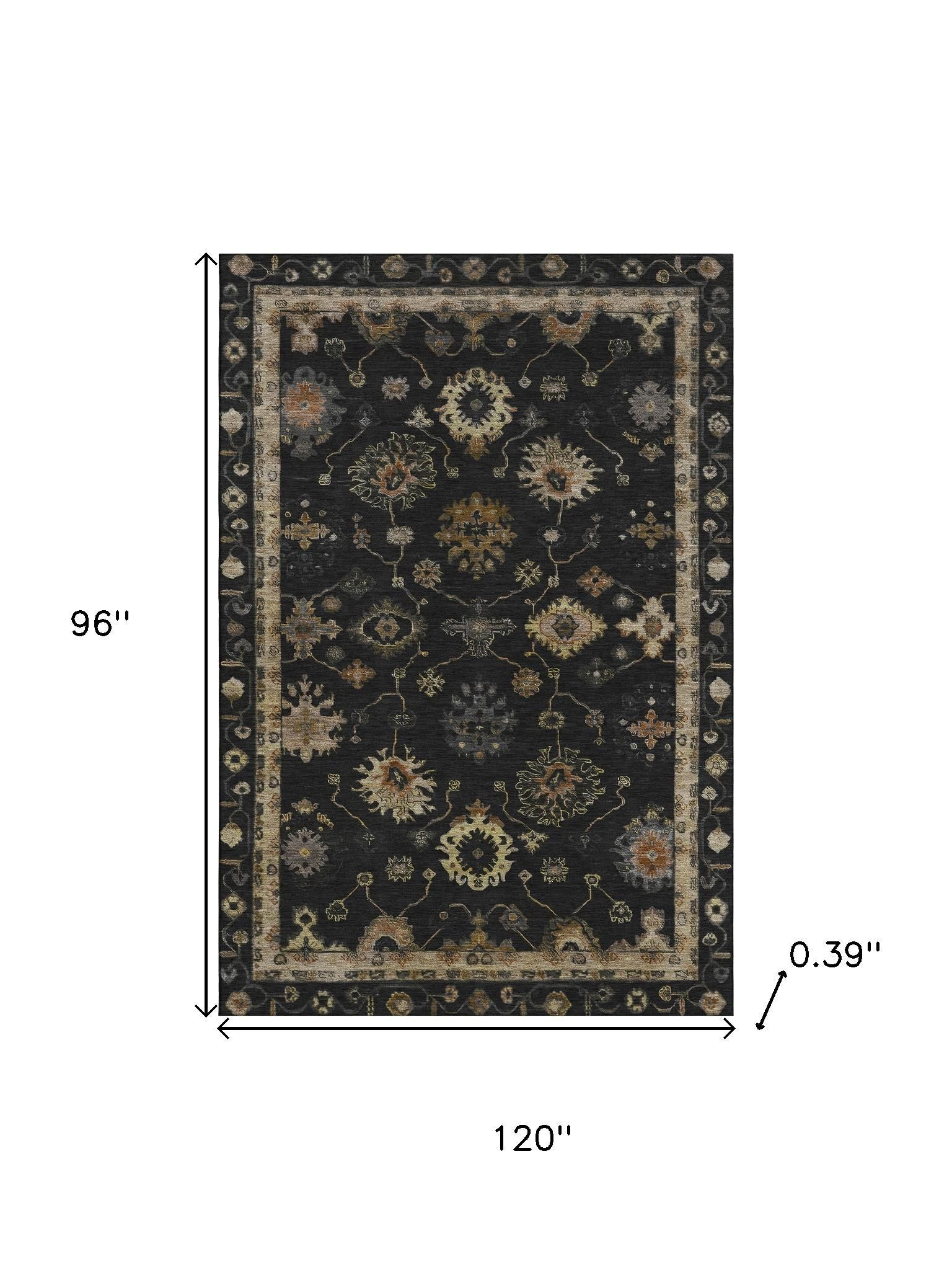 Add great coloration and comfortable texture to your space with this 8-foot x 10-foot black and gold oriental washable area rug with uv protection. Ideal for spaces with kids and pets, this rug is stain resistant to help repel dirt and spilled liquids. Built to last, this rug crafted from polyester fibers is known for its durability and long lasting appeal. Rugs are a great way to showcase your style, hide imperfections, warm your home and reduce noise. This larger sized, traditional styled rug is ready to create a focal point or statement piece in your room. 96.00-inch h x 120.00-inch w x 0.39-inch d.