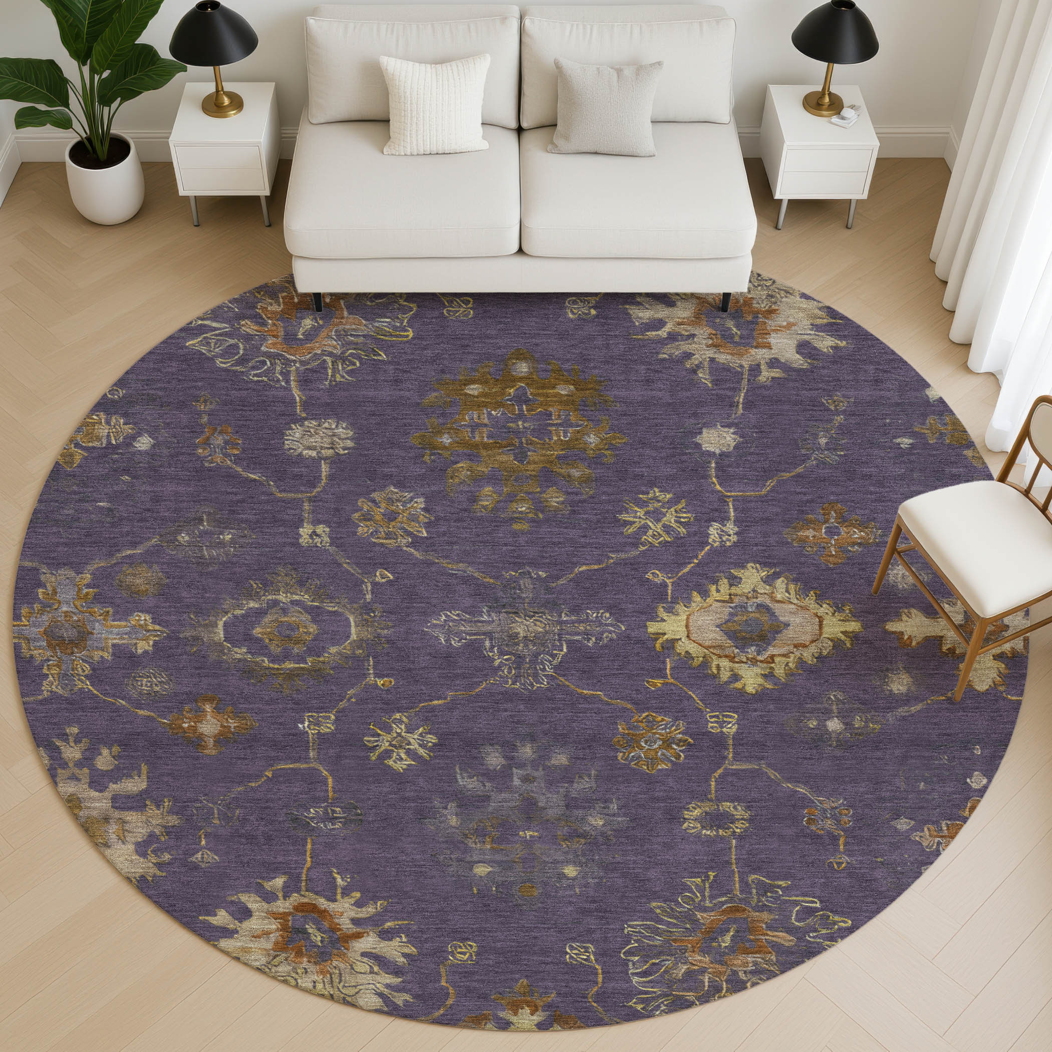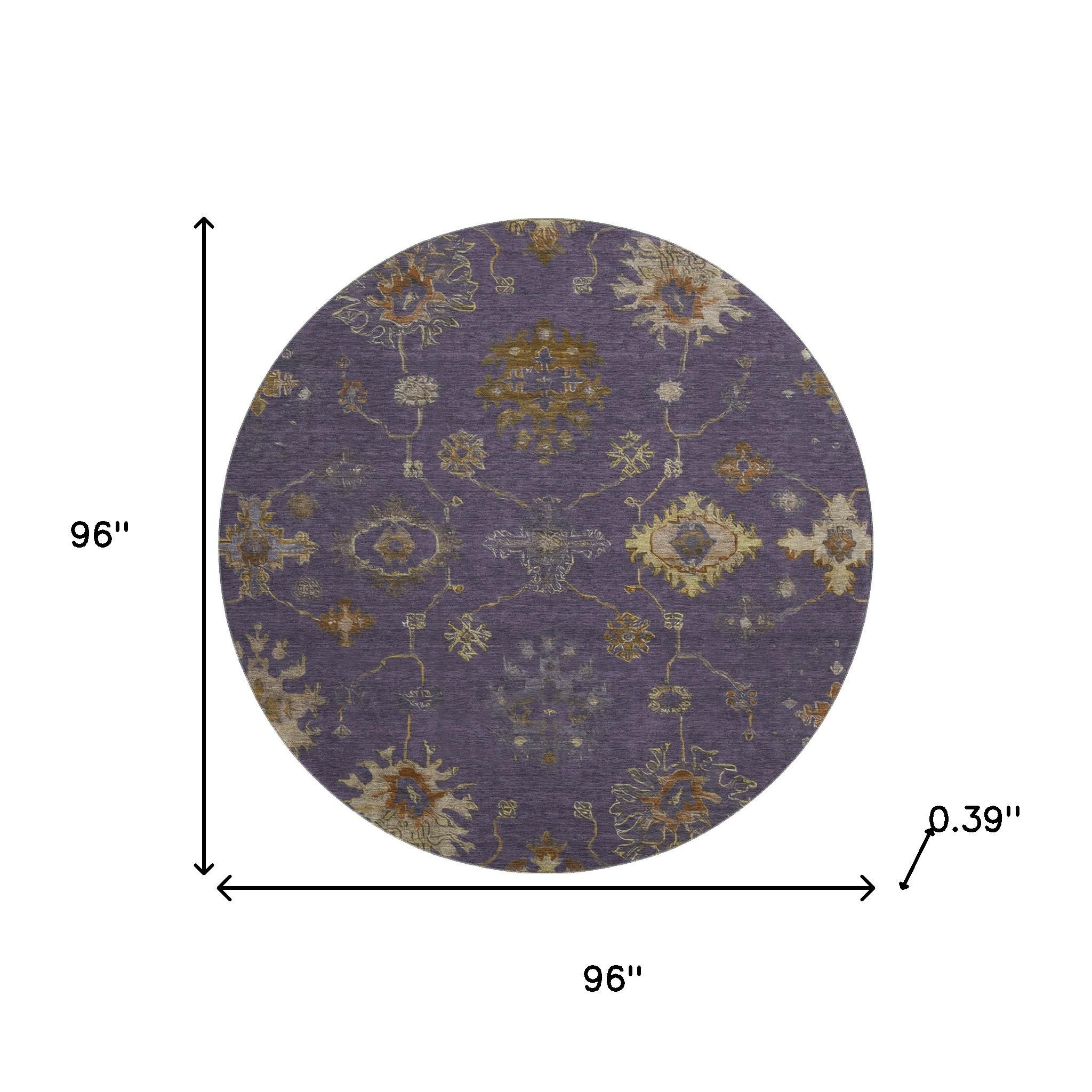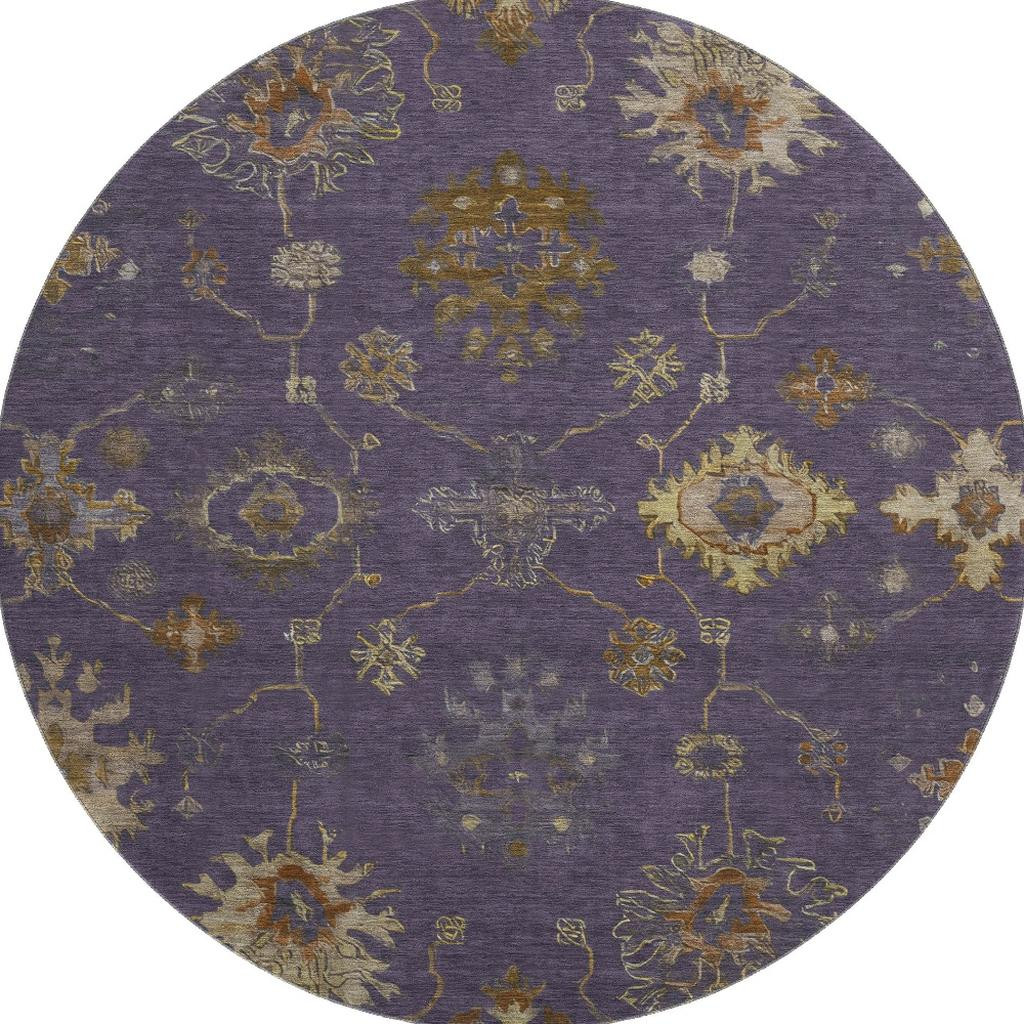 Add some artistry to your room with this 8-foot eggplant and beige oriental washable round rug with uv protection. Ideal for spaces with kids and pets, this rug is stain resistant to help repel dirt and spilled liquids. Built to last, this rug crafted from polyester fibers is known for its durability and long lasting appeal. Rugs are a great way to showcase your style, hide imperfections, warm your home and reduce noise. This larger sized, traditional styled rug is ready to create a focal point or statement piece in your room. 96.00-inch h x 96.00-inch w x 0.39-inch d.