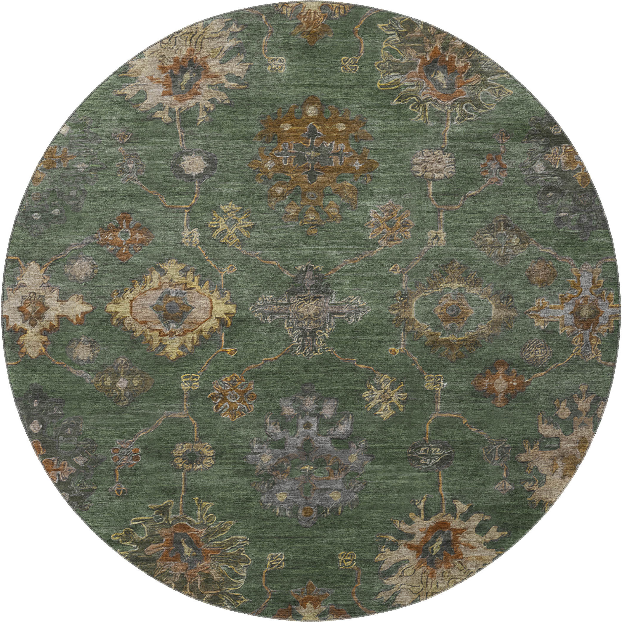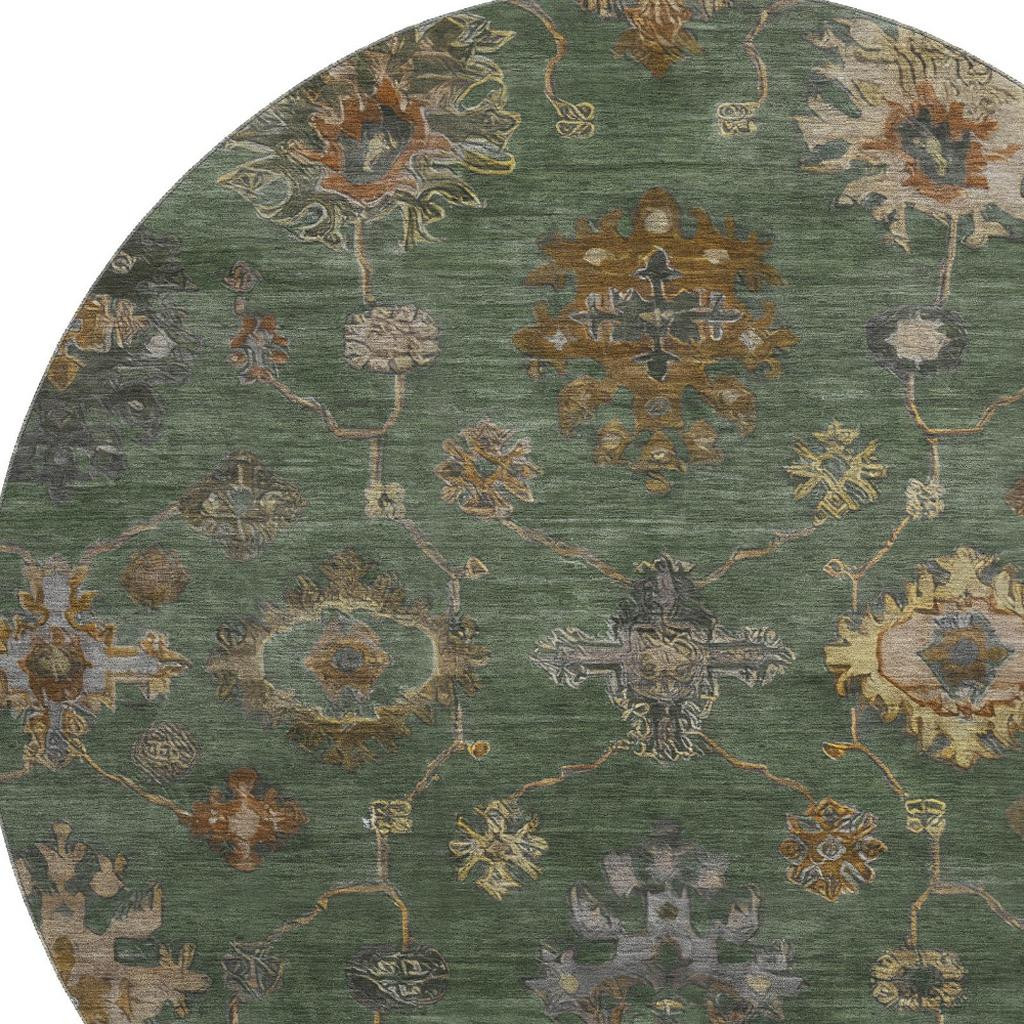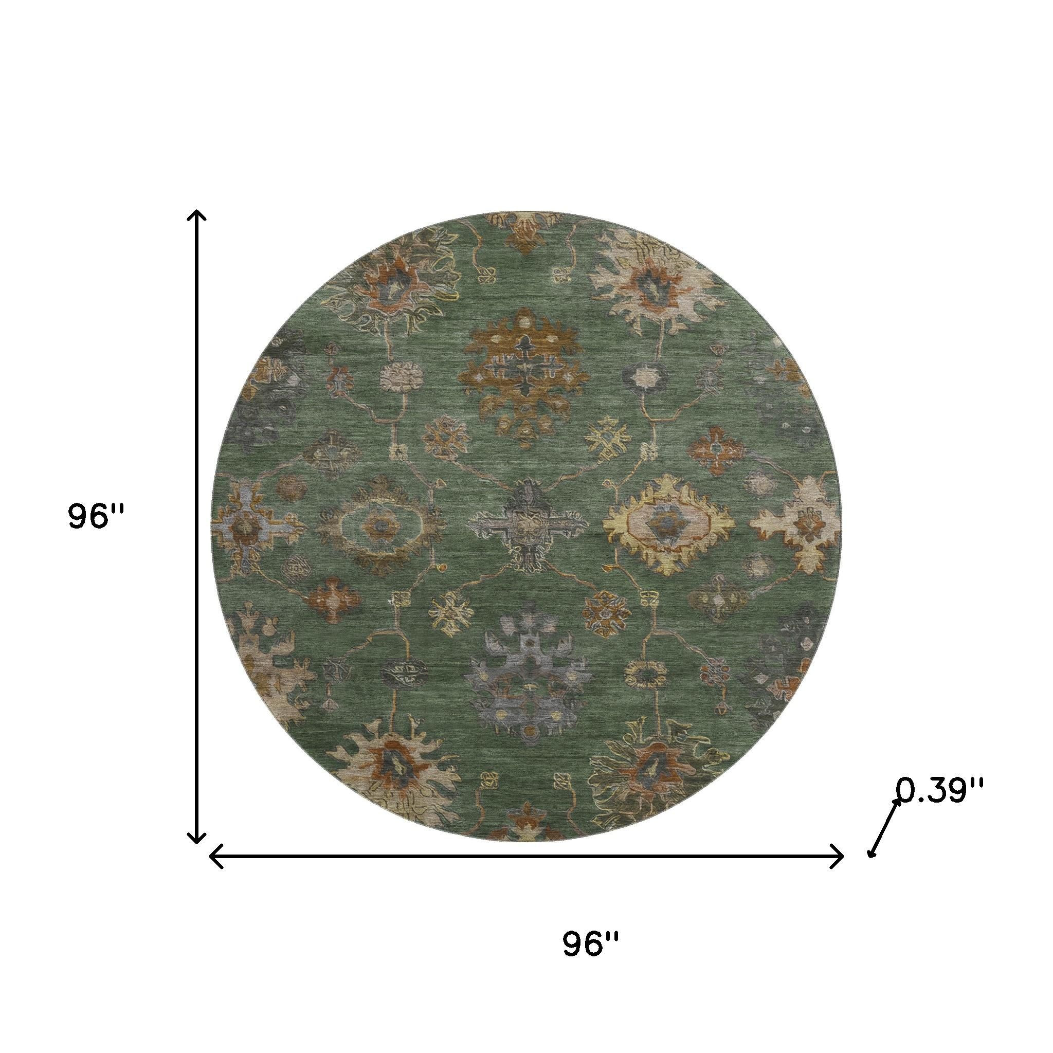 This 8-foot fern green and gold oriental washable round rug with uv protection, is a great way to add warmth to a room. Ideal for spaces with kids and pets, this rug is stain resistant to help repel dirt and spilled liquids. Built to last, this rug crafted from polyester fibers is known for its durability and long lasting appeal. Rugs are a great way to showcase your style, hide imperfections, warm your home and reduce noise. This larger sized, traditional styled rug is ready to create a focal point or statement piece in your room. 96.00-inch h x 96.00-inch w x 0.39-inch d.