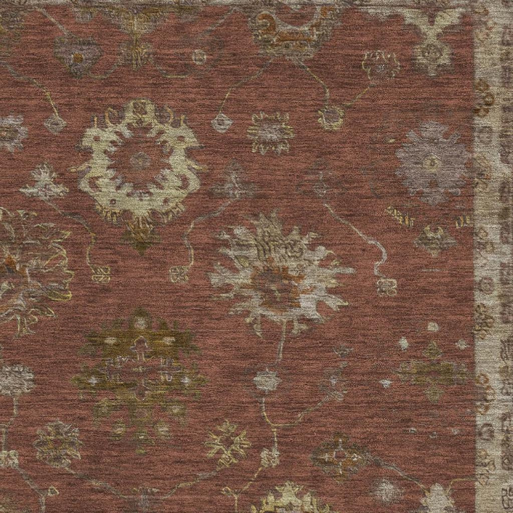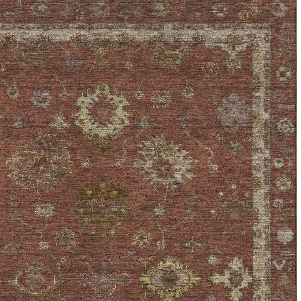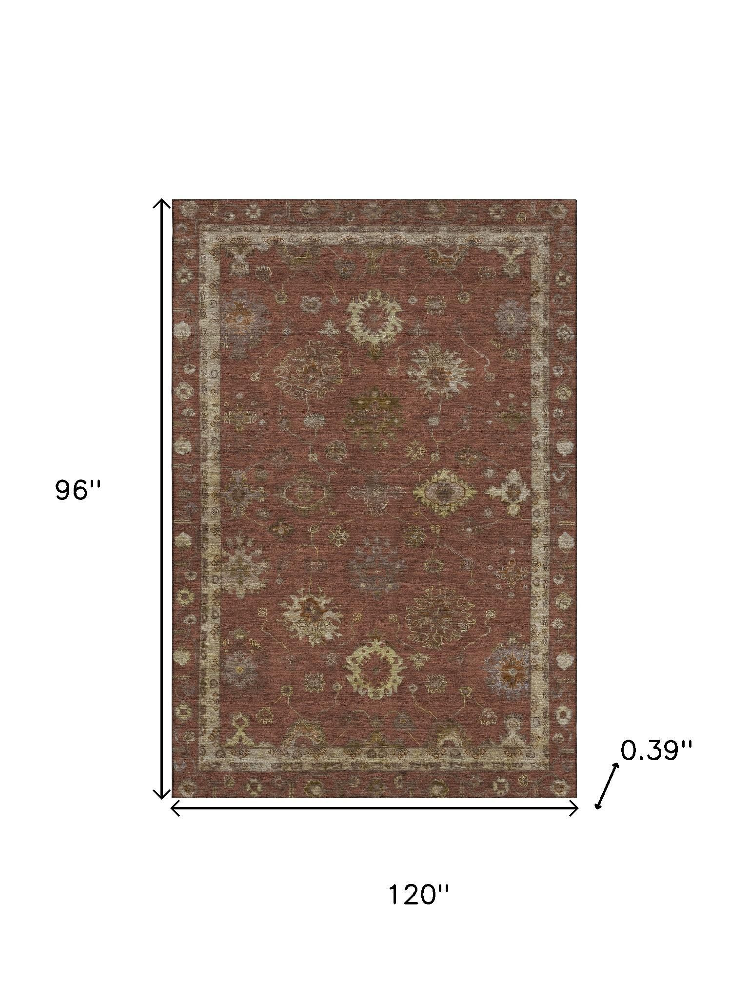 This 8-foot x 10-foot rust and beige oriental washable area rug with uv protection, is a great way to add warmth to a room. Ideal for spaces with kids and pets, this rug is stain resistant to help repel dirt and spilled liquids. Built to last, this rug crafted from polyester fibers is known for its durability and long lasting appeal. Rugs are a great way to showcase your style, hide imperfections, warm your home and reduce noise. This larger sized, traditional styled rug is ready to create a focal point or statement piece in your room. 96.00-inch h x 120.00-inch w x 0.39-inch d.