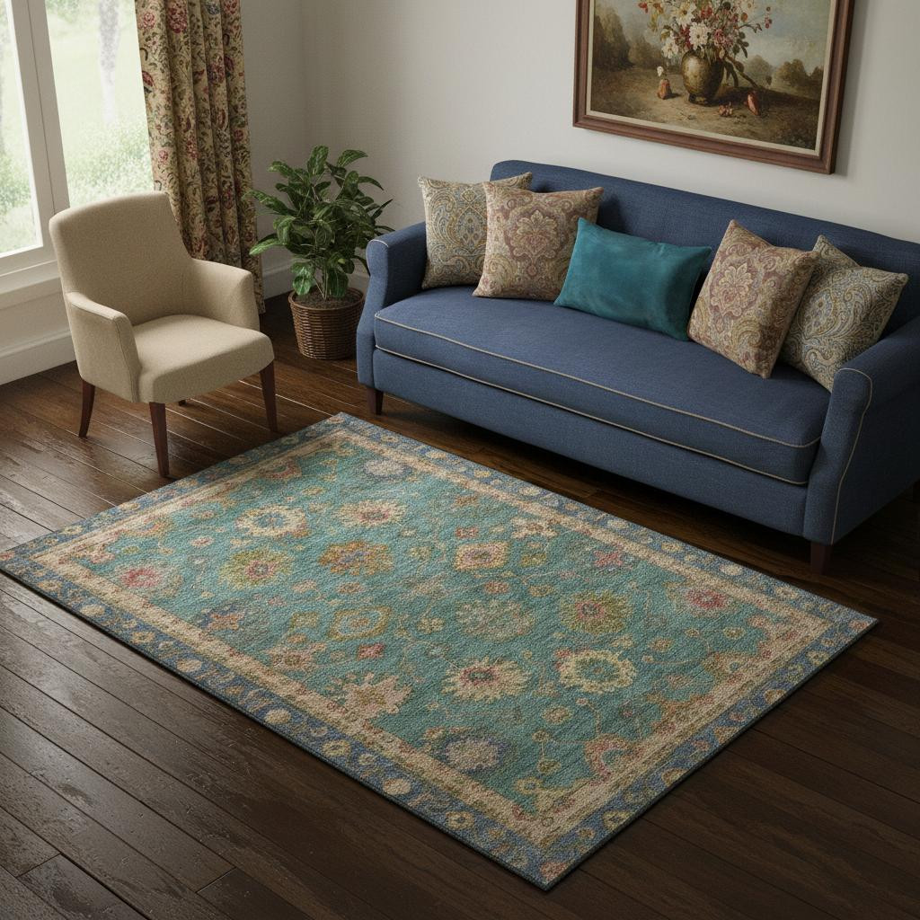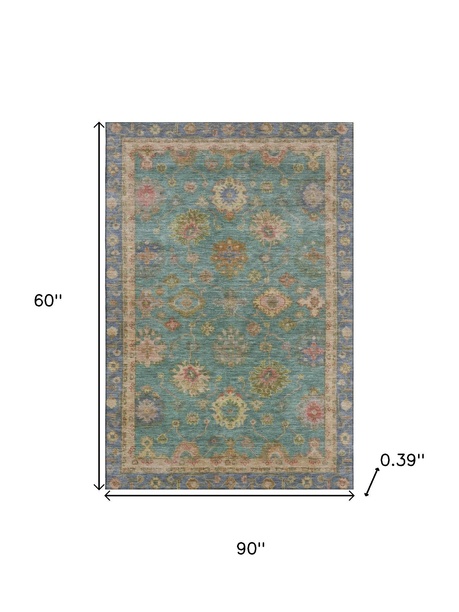 Add great coloration and comfortable texture to your space with this 5-foot x 8-foot teal and blush oriental washable area rug with uv protection. Ideal for spaces with kids and pets, this rug is stain resistant to help repel dirt and spilled liquids. Built to last, this rug crafted from polyester fibers is known for its durability and long lasting appeal. Rugs are a great way to showcase your style, hide imperfections, warm your home and reduce noise. This larger sized, traditional styled rug is ready to create a focal point or statement piece in your room. 60.00-inch h x 90.00-inch w x 0.39-inch d.