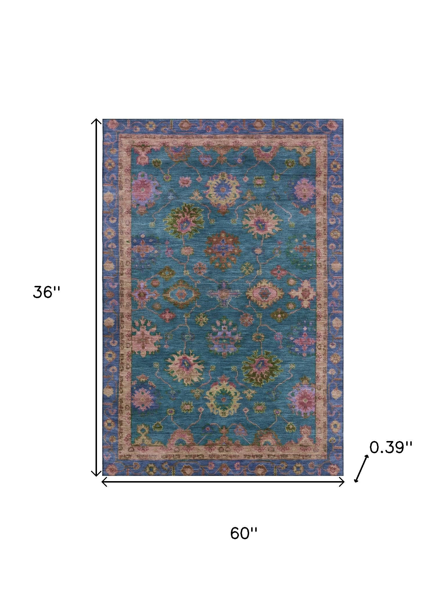 Add great coloration and comfortable texture to your space with this 3-foot x 5-foot teal and blush oriental washable area rug with uv protection. Ideal for spaces with kids and pets, this rug is stain resistant to help repel dirt and spilled liquids. Built to last, this rug crafted from polyester fibers is known for its durability and long lasting appeal. Rugs are a great way to showcase your style, hide imperfections, warm your home and reduce noise. This smaller sized, traditional styled rug is just what you need for your walkway, bedside, in front of door, cabinet, refrigerator, or chair. 36.00-inch h x 60.00-inch w x 0.39-inch d.