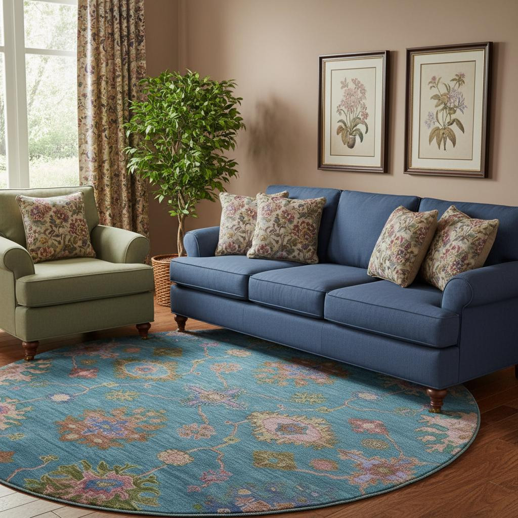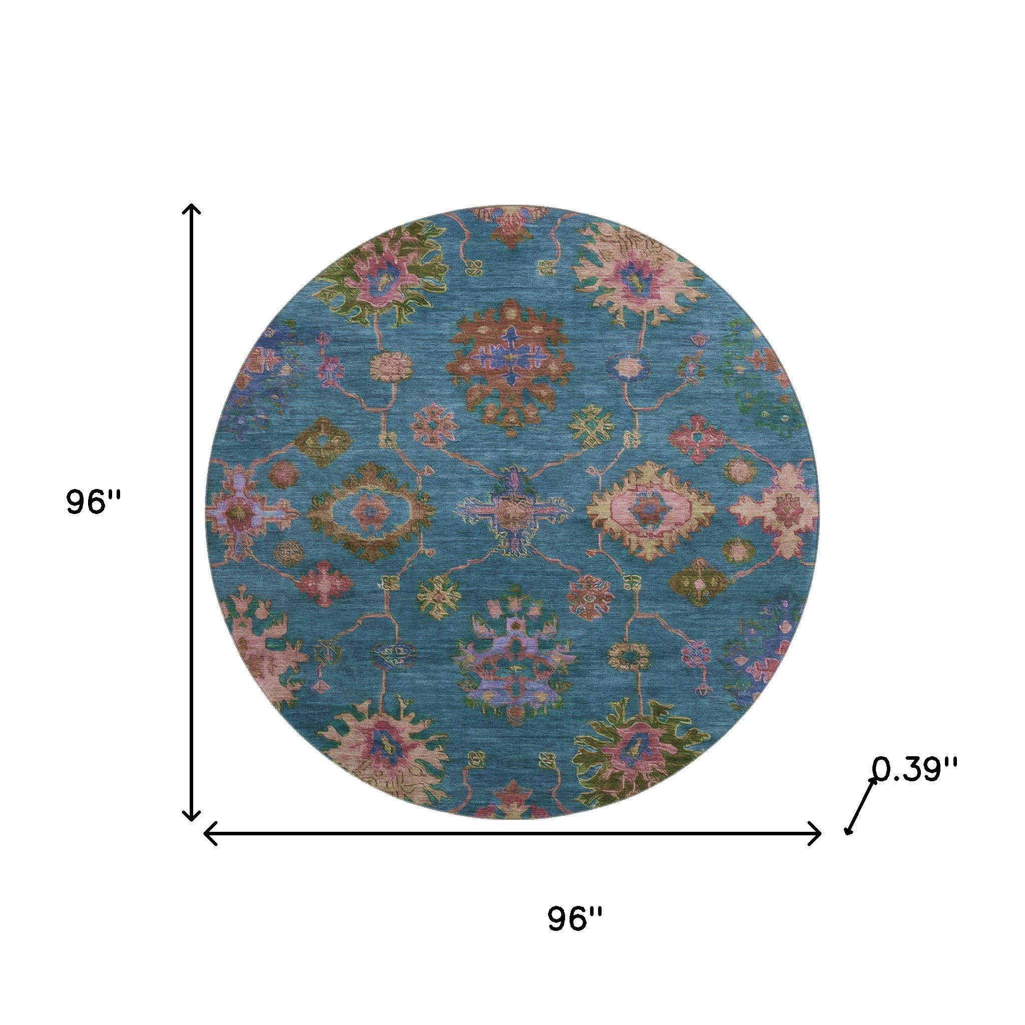 This 8-foot teal and blush oriental washable round rug with uv protection, is a great way to add warmth to a room. Ideal for spaces with kids and pets, this rug is stain resistant to help repel dirt and spilled liquids. Built to last, this rug crafted from polyester fibers is known for its durability and long lasting appeal. Rugs are a great way to showcase your style, hide imperfections, warm your home and reduce noise. This larger sized, traditional styled rug is ready to create a focal point or statement piece in your room. 96.00-inch h x 96.00-inch w x 0.39-inch d.