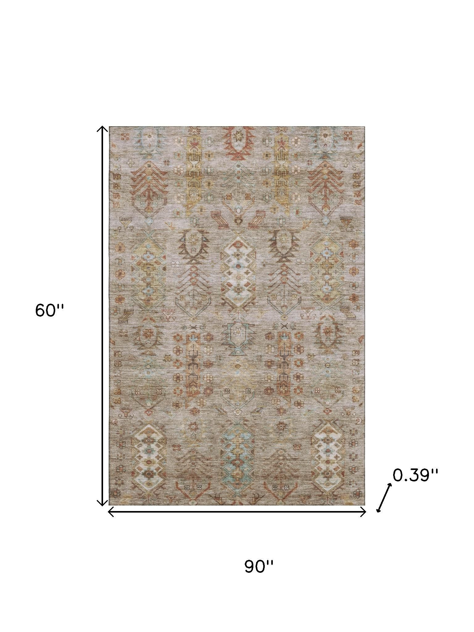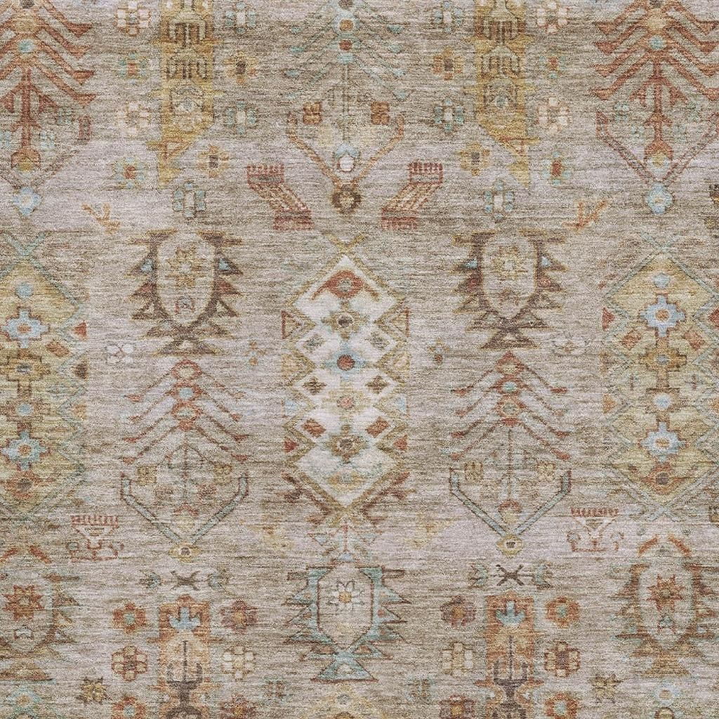 Add some artistry to your room with this 5-foot x 8-foot beige and brown southwestern washable area rug with uv protection. Ideal for spaces with kids and pets, this rug is stain resistant to help repel dirt and spilled liquids. Built to last, this rug crafted from polyester fibers is known for its durability and long lasting appeal. Rugs are a great way to showcase your style, hide imperfections, warm your home and reduce noise. This larger sized, traditional styled rug is ready to create a focal point or statement piece in your room. 60.00-inch h x 90.00-inch w x 0.39-inch d.