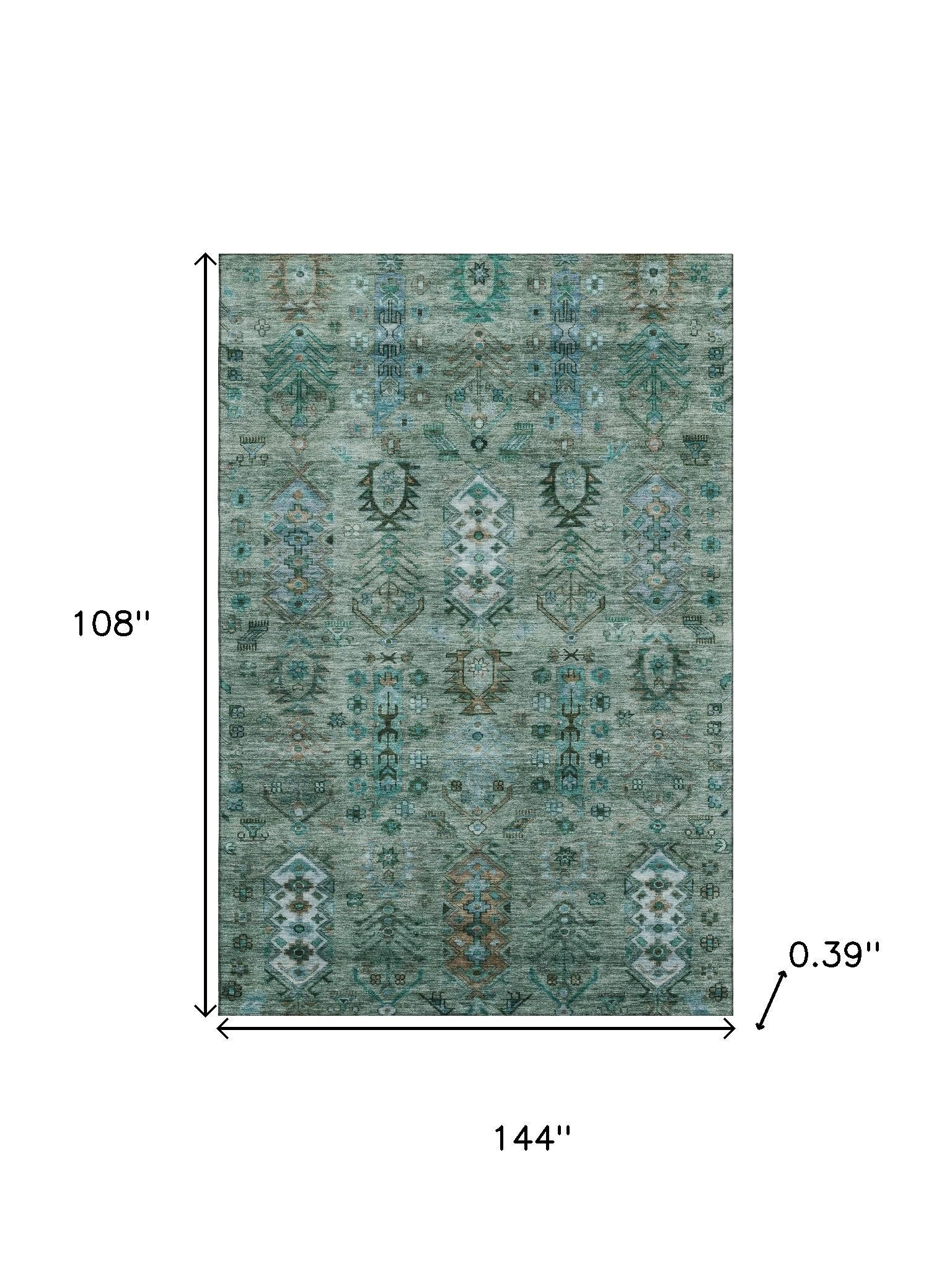Add great coloration and comfortable texture to your space with this 9-foot x 12-foot green and teal southwestern washable area rug with uv protection. Ideal for spaces with kids and pets, this rug is stain resistant to help repel dirt and spilled liquids. Built to last, this rug crafted from polyester fibers is known for its durability and long lasting appeal. Rugs are a great way to showcase your style, hide imperfections, warm your home and reduce noise. This larger sized, traditional styled rug is ready to create a focal point or statement piece in your room. 108.00-inch h x 144.00-inch w x 0.39-inch d.