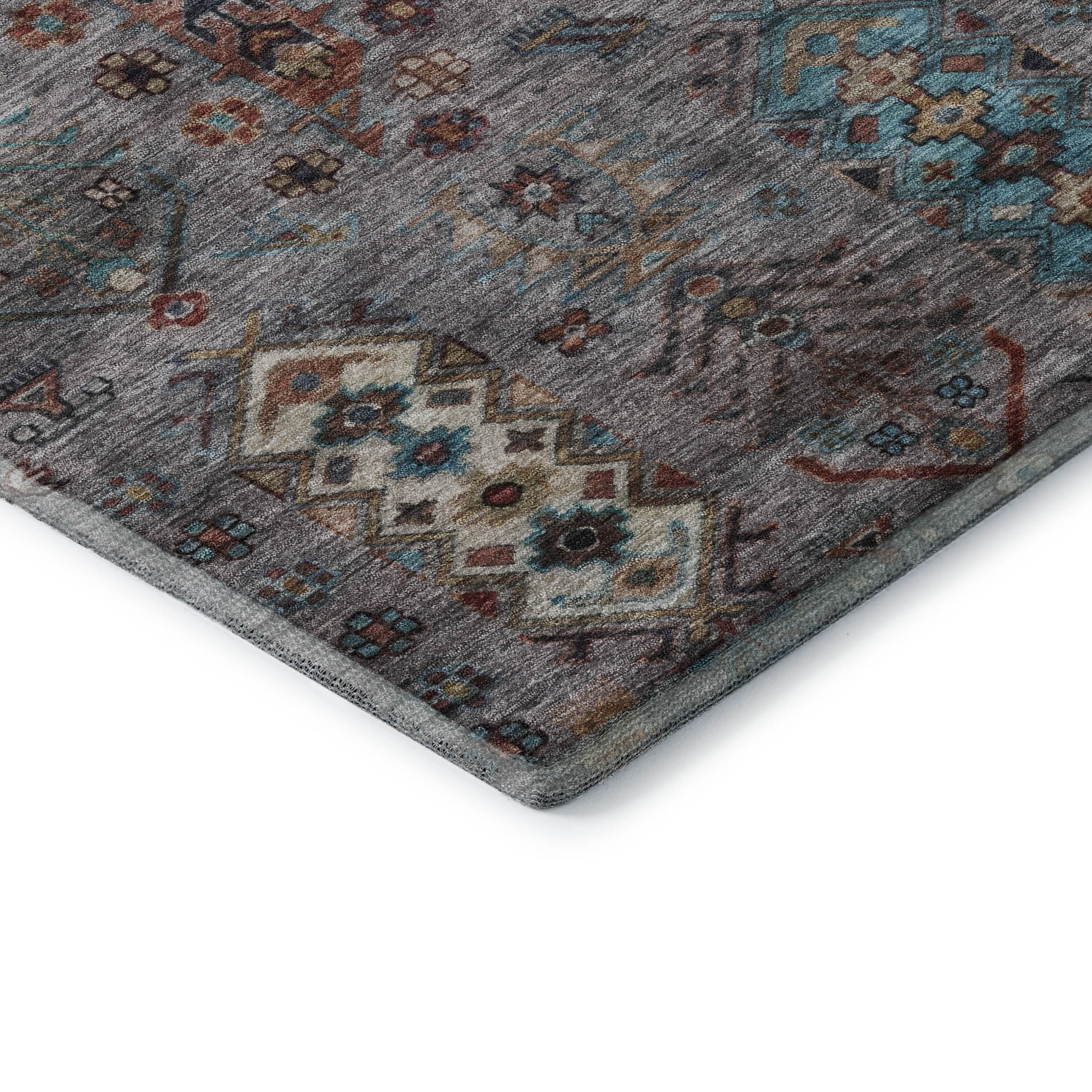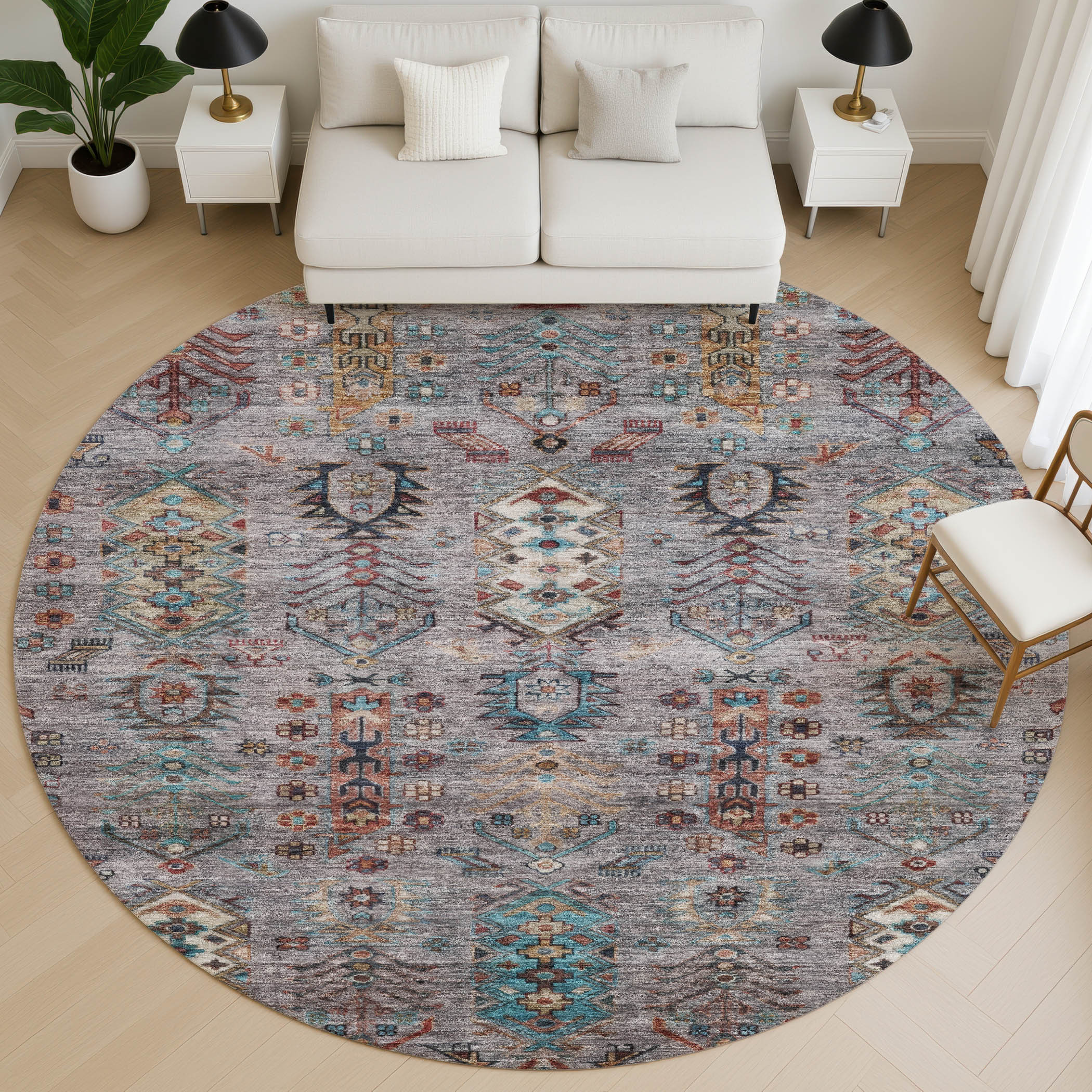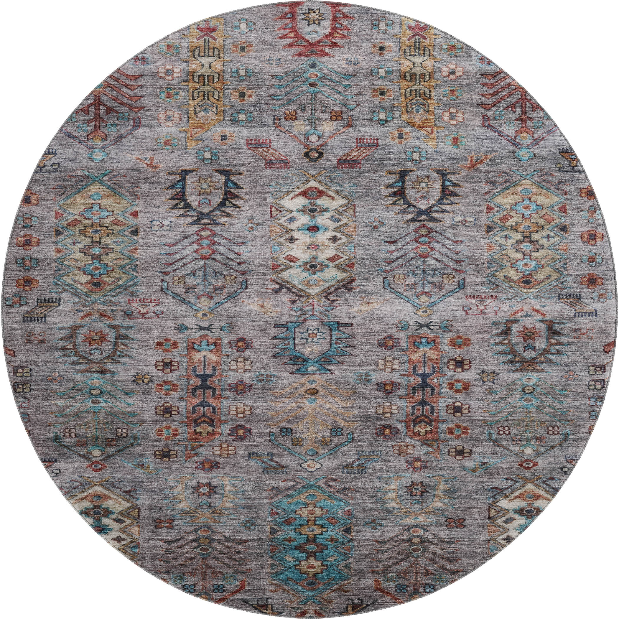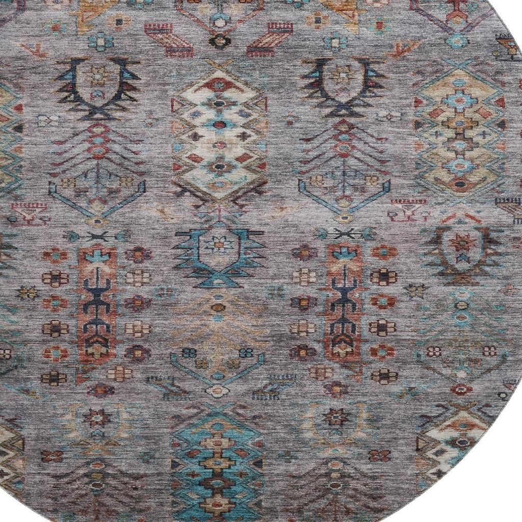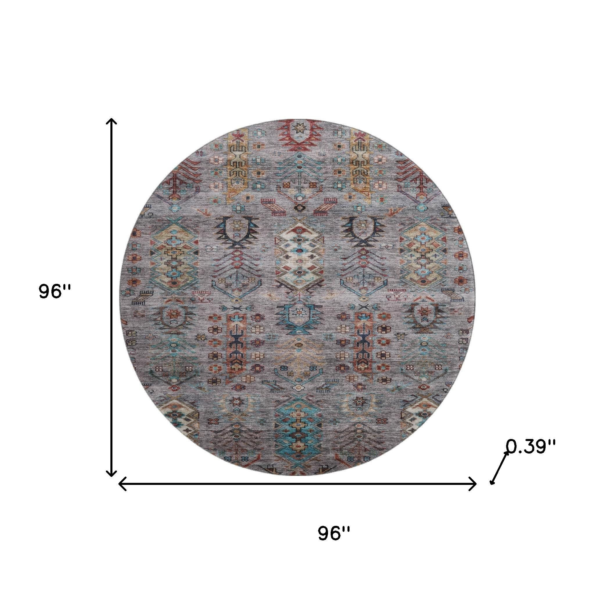 This 8-foot gray and teal southwestern washable round rug with uv protection, is a great way to add warmth to a room. Ideal for spaces with kids and pets, this rug is stain resistant to help repel dirt and spilled liquids. Built to last, this rug crafted from polyester fibers is known for its durability and long lasting appeal. Rugs are a great way to showcase your style, hide imperfections, warm your home and reduce noise. This larger sized, traditional styled rug is ready to create a focal point or statement piece in your room. 96.00-inch h x 96.00-inch w x 0.39-inch d.
