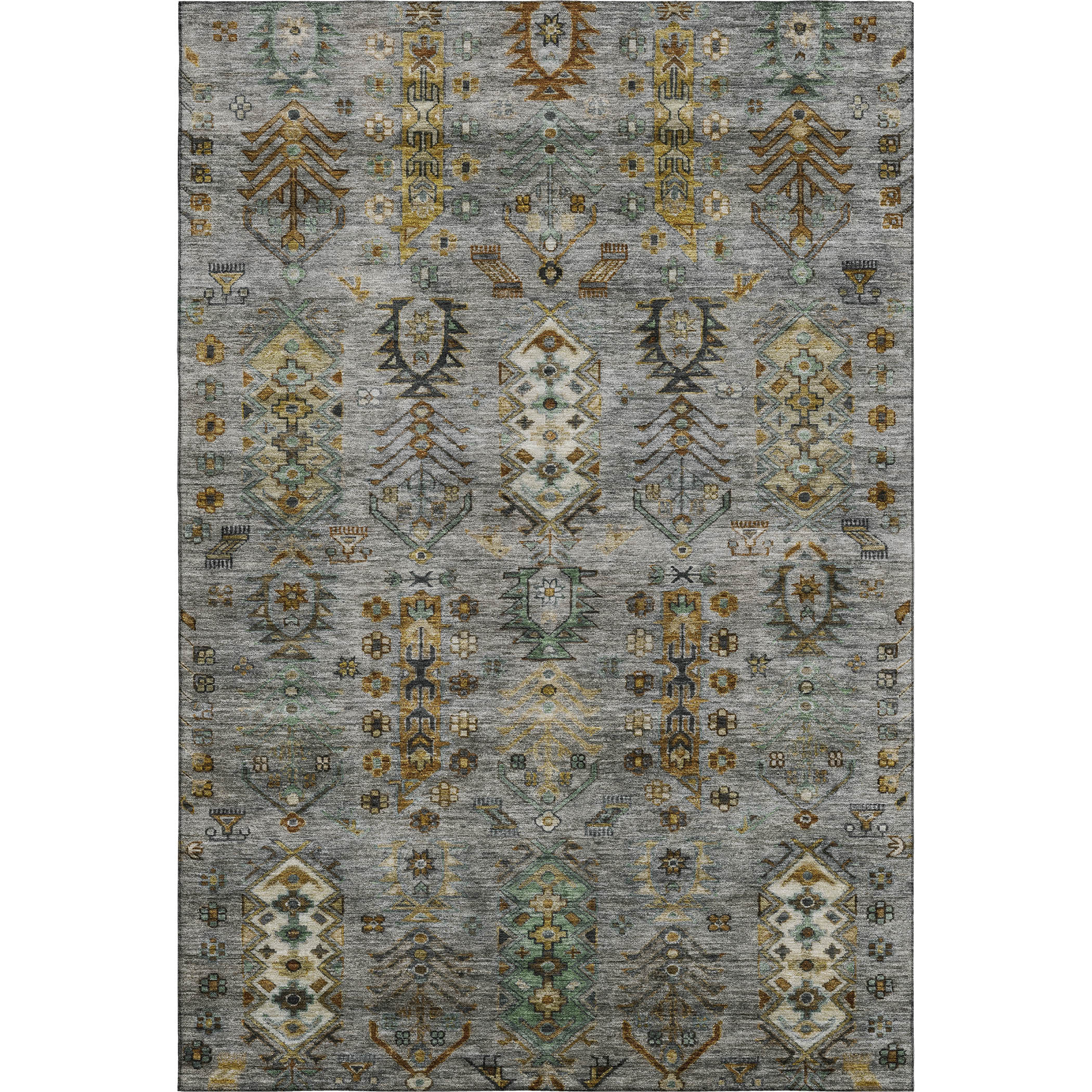 Add great coloration and comfortable texture to your space with this 3-foot x 5-foot pewter and gold southwestern washable area rug with uv protection. Ideal for spaces with kids and pets, this rug is stain resistant to help repel dirt and spilled liquids. Built to last, this rug crafted from polyester fibers is known for its durability and long lasting appeal. Rugs are a great way to showcase your style, hide imperfections, warm your home and reduce noise. This smaller sized, traditional styled rug is just what you need for your walkway, bedside, in front of door, cabinet, refrigerator, or chair. 36.00-inch h x 60.00-inch w x 0.39-inch d.