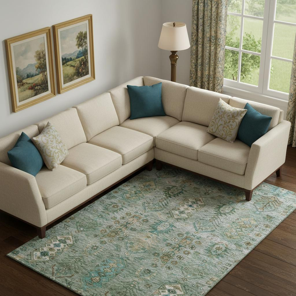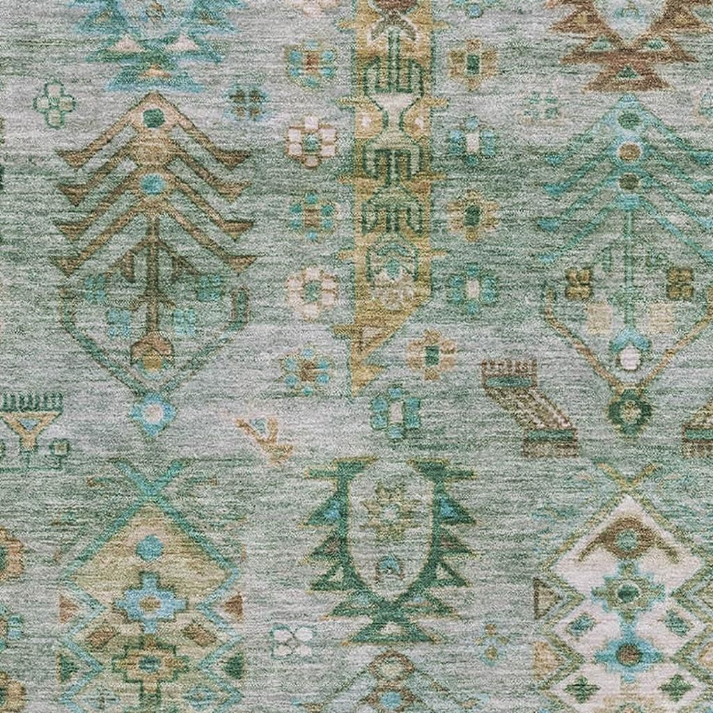 Add some artistry to your room with this 9-foot x 12-foot sage and copper southwestern washable area rug with uv protection. Ideal for spaces with kids and pets, this rug is stain resistant to help repel dirt and spilled liquids. Built to last, this rug crafted from polyester fibers is known for its durability and long lasting appeal. Rugs are a great way to showcase your style, hide imperfections, warm your home and reduce noise. This larger sized, traditional styled rug is ready to create a focal point or statement piece in your room. 108.00-inch h x 144.00-inch w x 0.39-inch d.