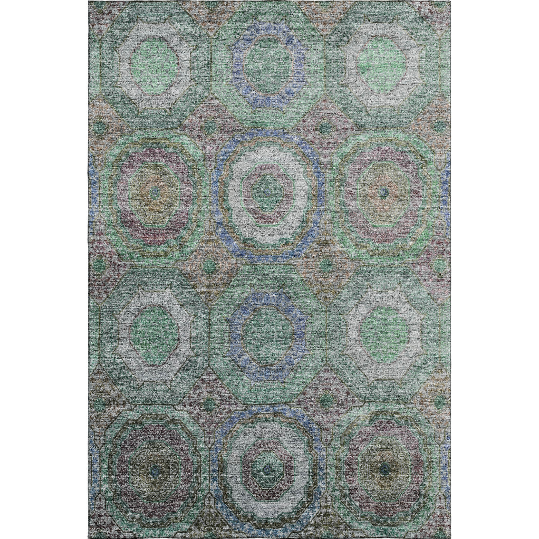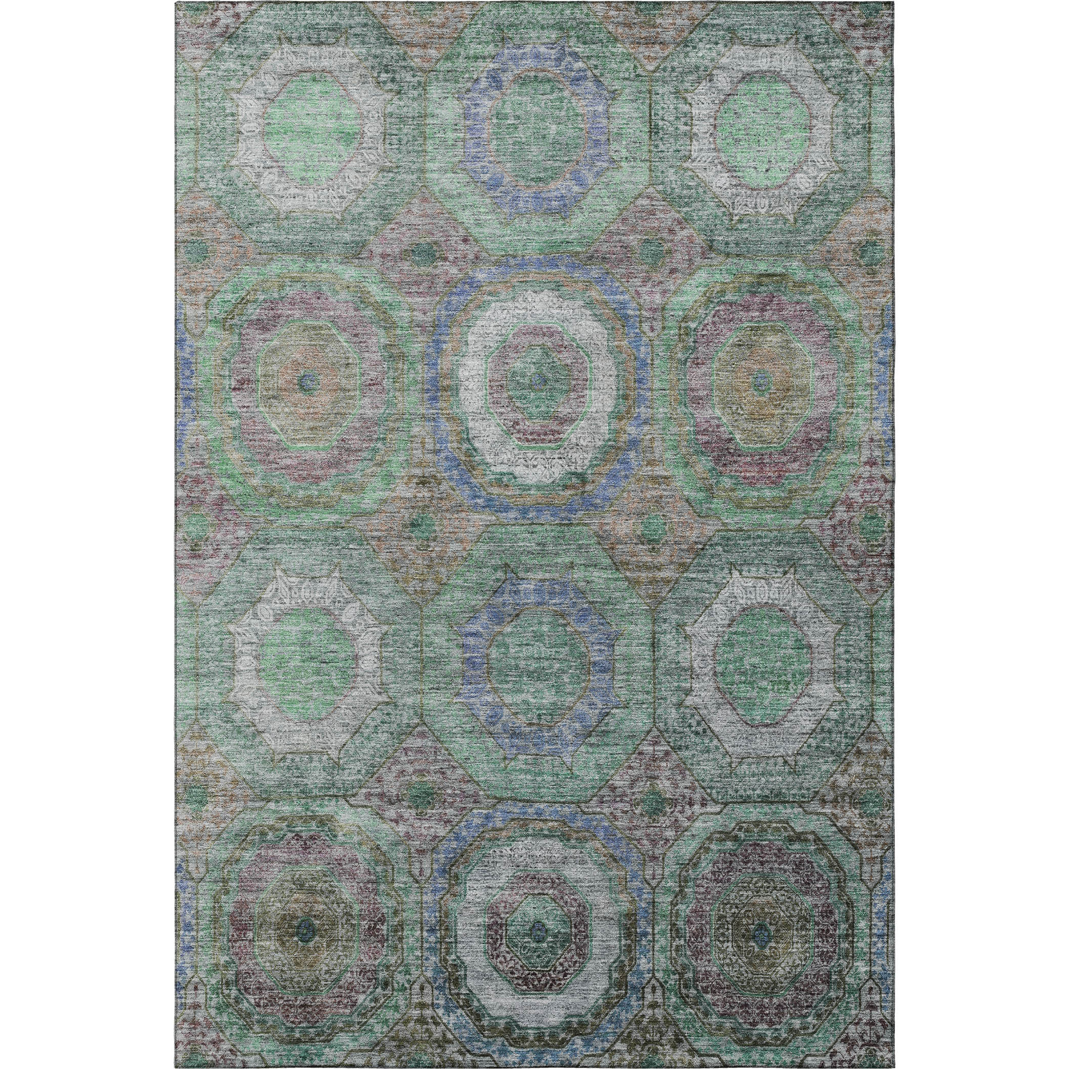 Set an inviting tone in your space with this 10-foot x 14-foot green and gray geometric washable area rug with uv protection. Ideal for spaces with kids and pets, this rug is stain resistant to help repel dirt and spilled liquids. Built to last, this rug crafted from polyester fibers is known for its durability and long lasting appeal. Rugs are a great way to showcase your style, hide imperfections, warm your home and reduce noise. This larger sized, transitional styled rug is ready to create a focal point or statement piece in your room. 120.00-inch h x 168.00-inch w x 0.39-inch d.