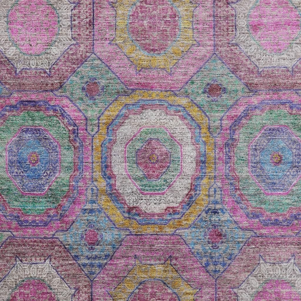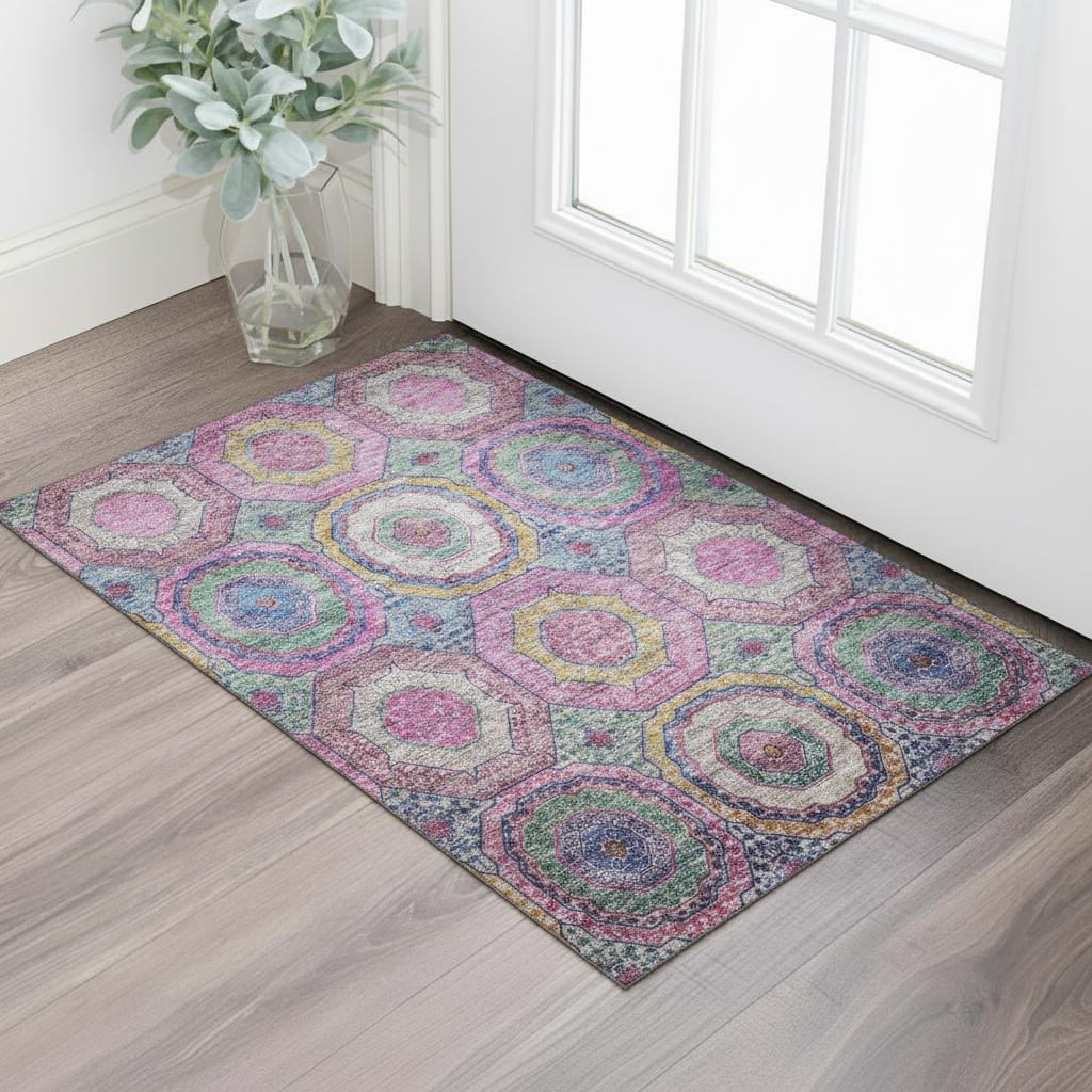 This 3-foot x 5-foot pink and blue geometric washable area rug with uv protection, is a great way to add warmth to a room. Ideal for spaces with kids and pets, this rug is stain resistant to help repel dirt and spilled liquids. Built to last, this rug crafted from polyester fibers is known for its durability and long lasting appeal. Rugs are a great way to showcase your style, hide imperfections, warm your home and reduce noise. This smaller sized, transitional styled rug is just what you need for your walkway, bedside, in front of door, cabinet, refrigerator, or chair. 36.00-inch h x 60.00-inch w x 0.39-inch d.