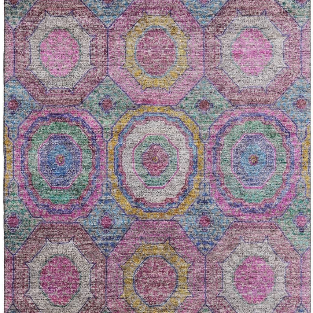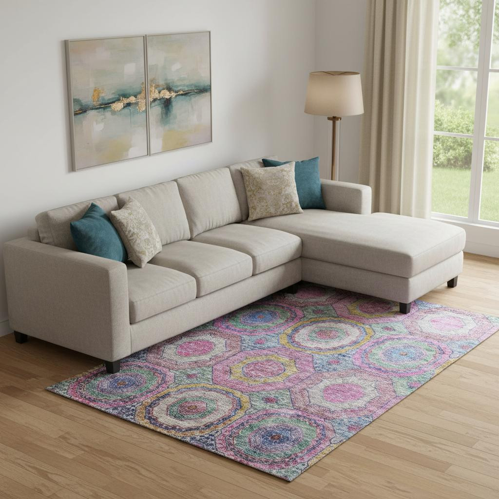 Set an inviting tone in your space with this 8-foot x 10-foot pink and blue geometric washable area rug with uv protection. Ideal for spaces with kids and pets, this rug is stain resistant to help repel dirt and spilled liquids. Built to last, this rug crafted from polyester fibers is known for its durability and long lasting appeal. Rugs are a great way to showcase your style, hide imperfections, warm your home and reduce noise. This larger sized, transitional styled rug is ready to create a focal point or statement piece in your room. 96.00-inch h x 120.00-inch w x 0.39-inch d.