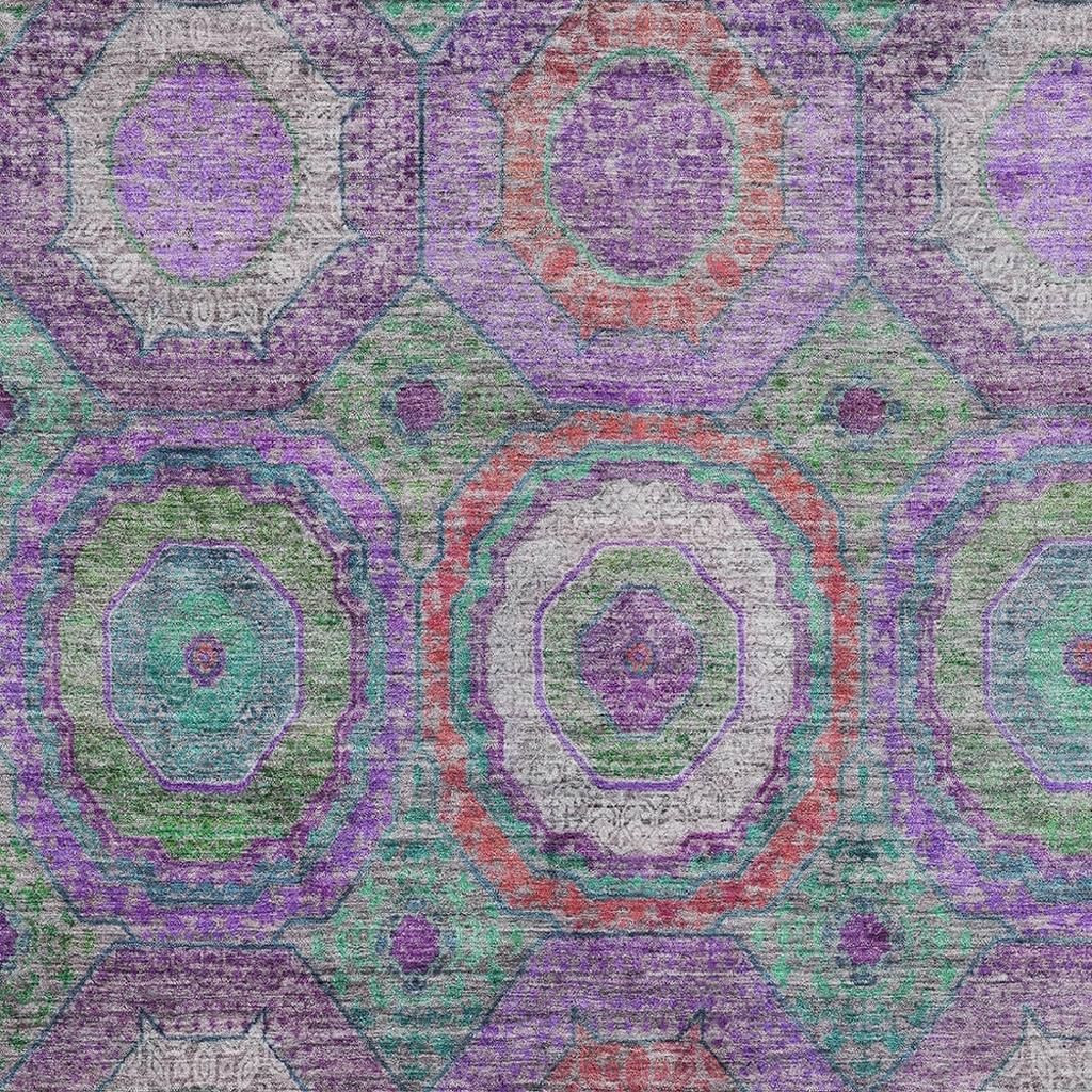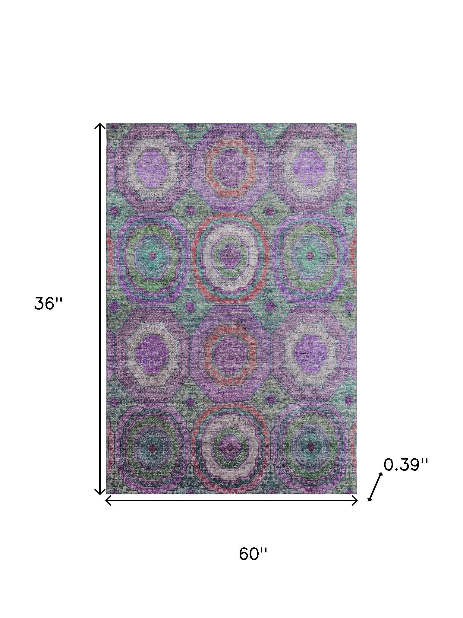 Set an inviting tone in your space with this 3-foot x 5-foot purple and lime green geometric washable area rug with uv protection. Ideal for spaces with kids and pets, this rug is stain resistant to help repel dirt and spilled liquids. Built to last, this rug crafted from polyester fibers is known for its durability and long lasting appeal. Rugs are a great way to showcase your style, hide imperfections, warm your home and reduce noise. This smaller sized, transitional styled rug is just what you need for your walkway, bedside, in front of door, cabinet, refrigerator, or chair. 36.00-inch h x 60.00-inch w x 0.39-inch d.