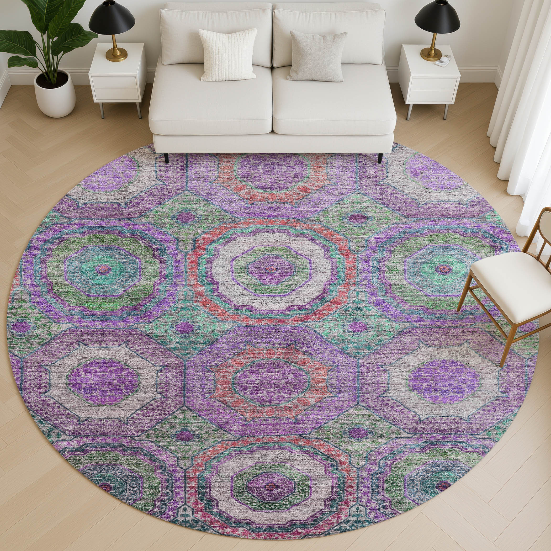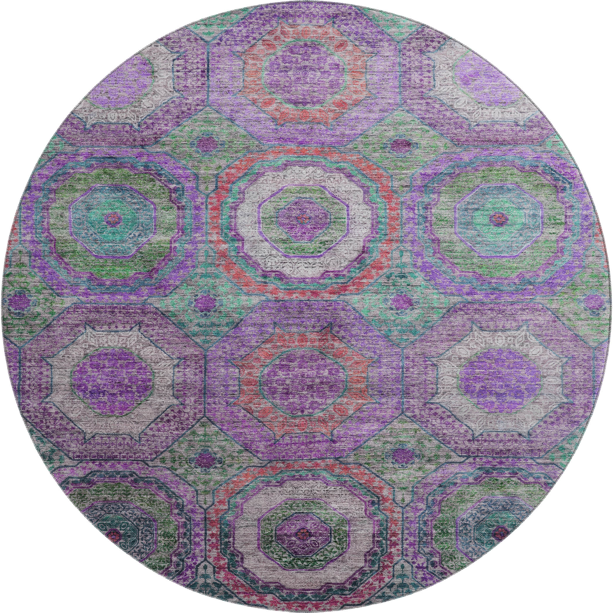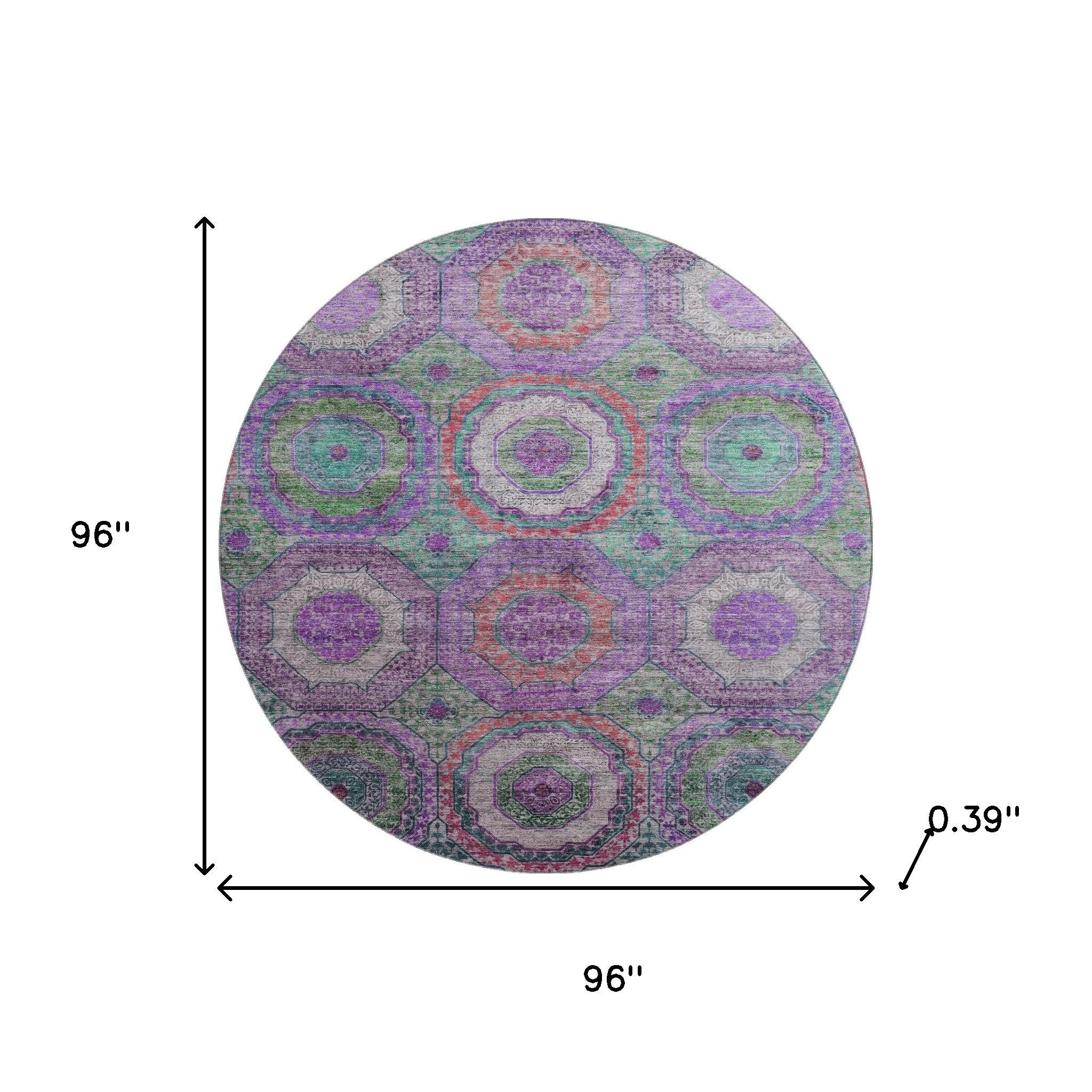 Add great coloration and comfortable texture to your space with this 8-foot purple and lime green geometric washable round rug with uv protection. Ideal for spaces with kids and pets, this rug is stain resistant to help repel dirt and spilled liquids. Built to last, this rug crafted from polyester fibers is known for its durability and long lasting appeal. Rugs are a great way to showcase your style, hide imperfections, warm your home and reduce noise. This larger sized, transitional styled rug is ready to create a focal point or statement piece in your room. 96.00-inch h x 96.00-inch w x 0.39-inch d.