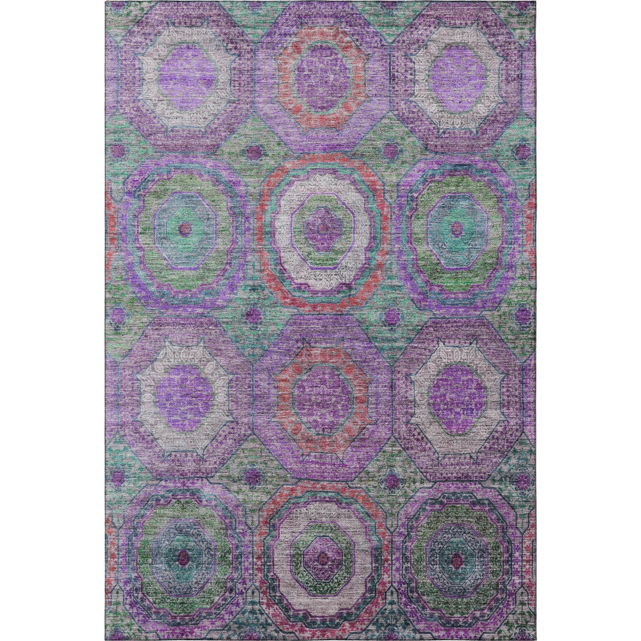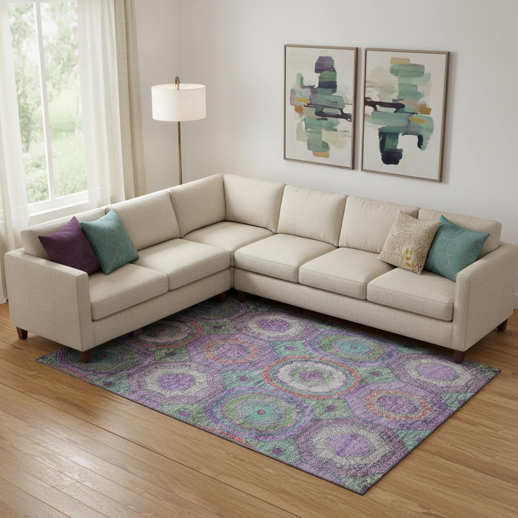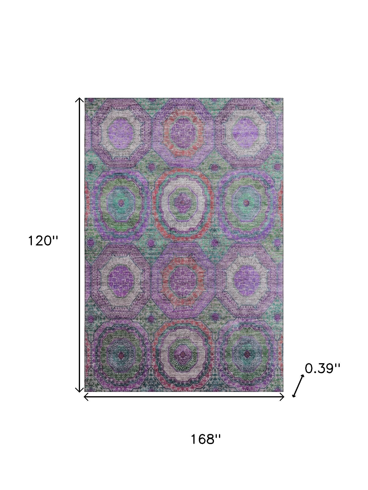Set an inviting tone in your space with this 10-foot x 14-foot purple and lime green geometric washable area rug with uv protection. Ideal for spaces with kids and pets, this rug is stain resistant to help repel dirt and spilled liquids. Built to last, this rug crafted from polyester fibers is known for its durability and long lasting appeal. Rugs are a great way to showcase your style, hide imperfections, warm your home and reduce noise. This larger sized, transitional styled rug is ready to create a focal point or statement piece in your room. 120.00-inch h x 168.00-inch w x 0.39-inch d.