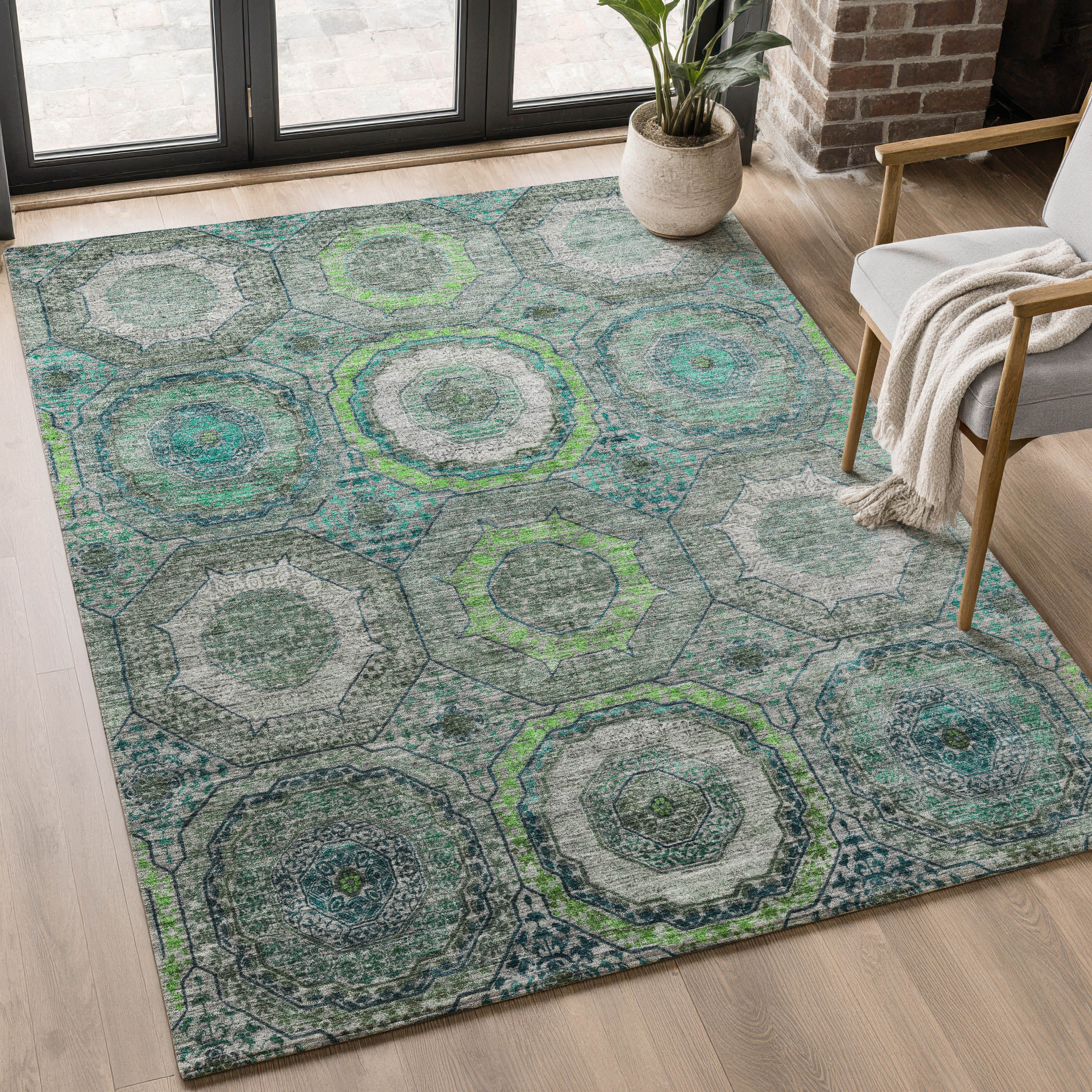 Add some artistry to your room with this 5-foot x 8-foot teal and lime green geometric washable area rug with uv protection. Ideal for spaces with kids and pets, this rug is stain resistant to help repel dirt and spilled liquids. Built to last, this rug crafted from polyester fibers is known for its durability and long lasting appeal. Rugs are a great way to showcase your style, hide imperfections, warm your home and reduce noise. This larger sized, transitional styled rug is ready to create a focal point or statement piece in your room. 60.00-inch h x 90.00-inch w x 0.39-inch d.