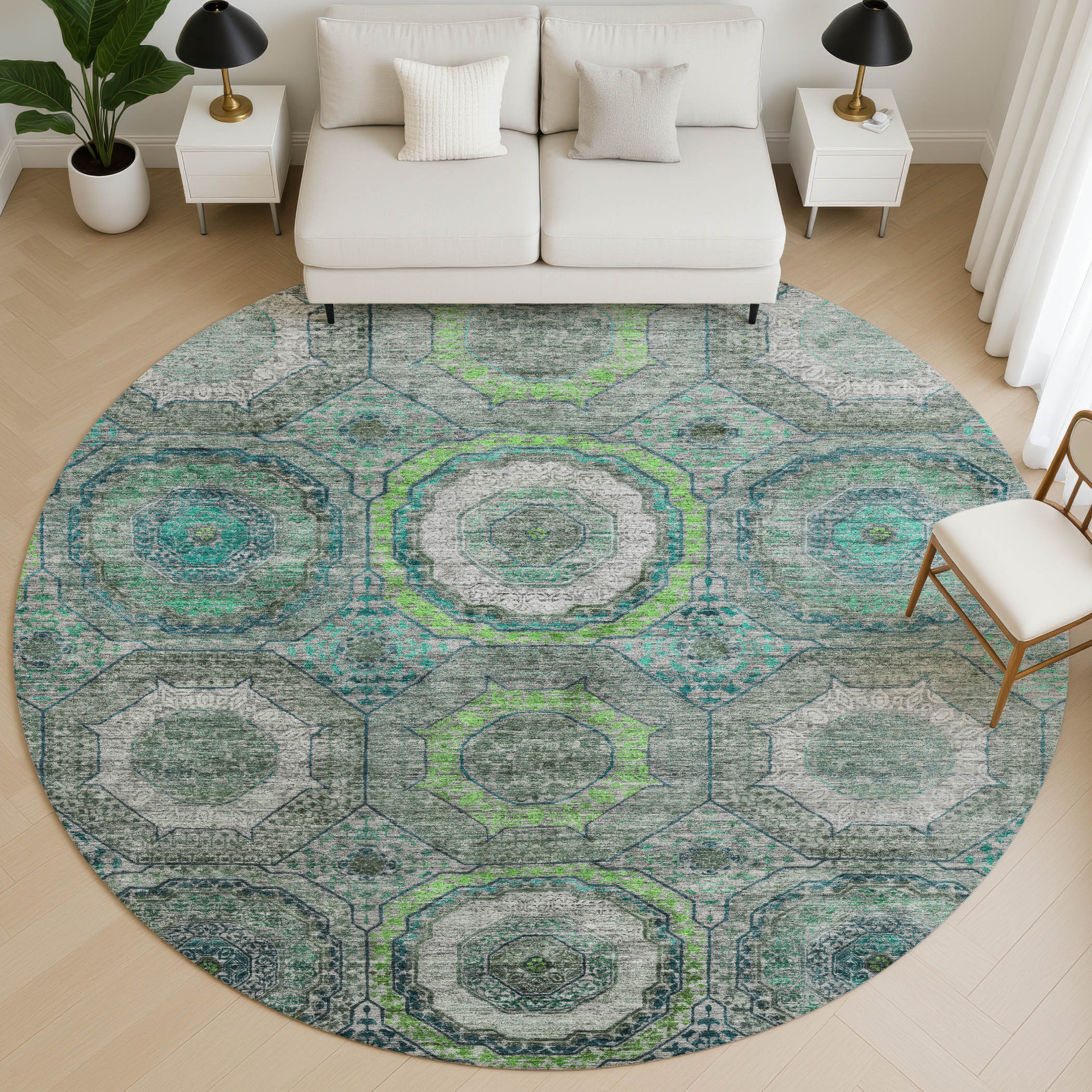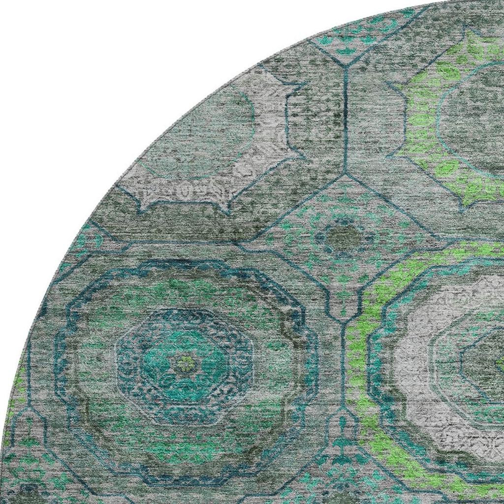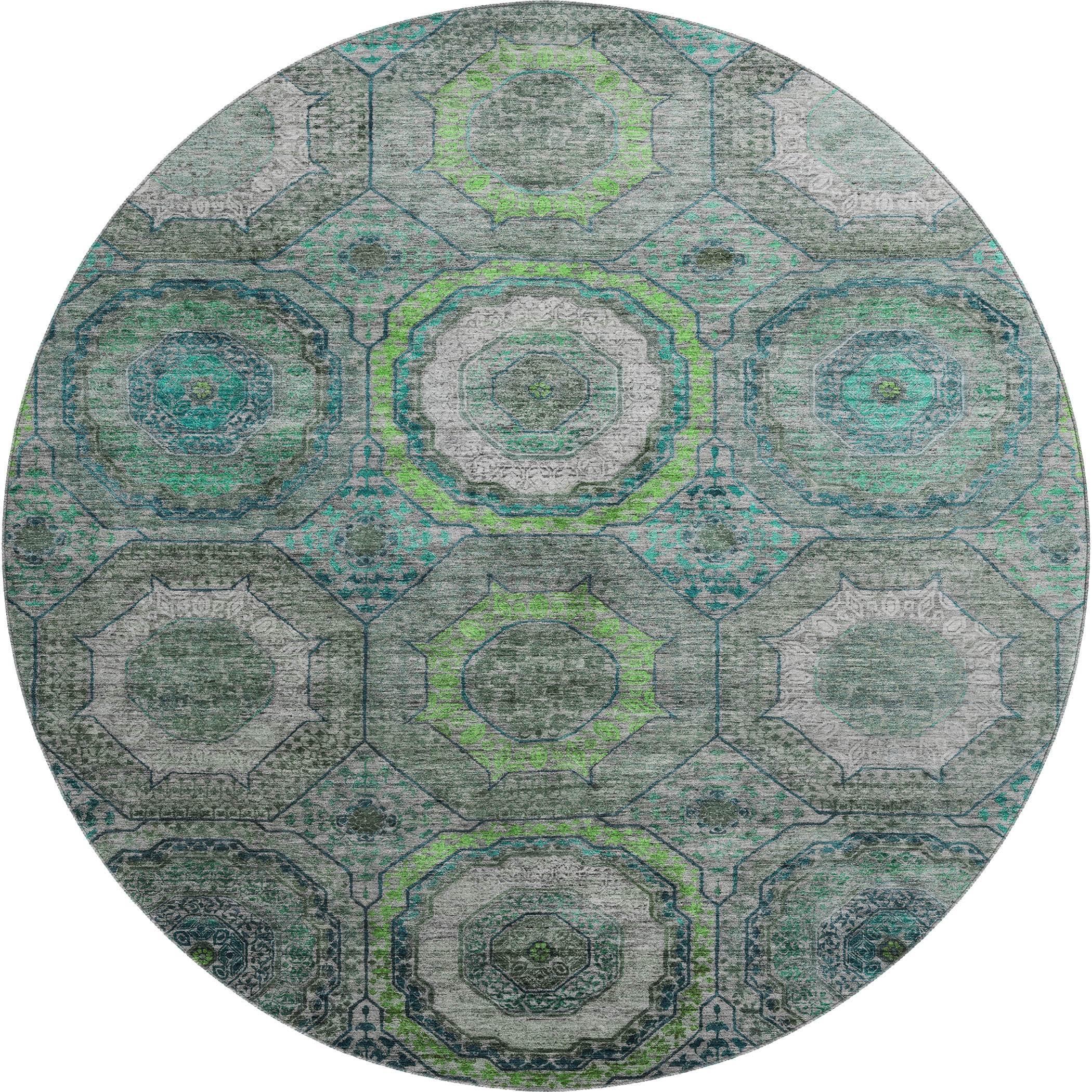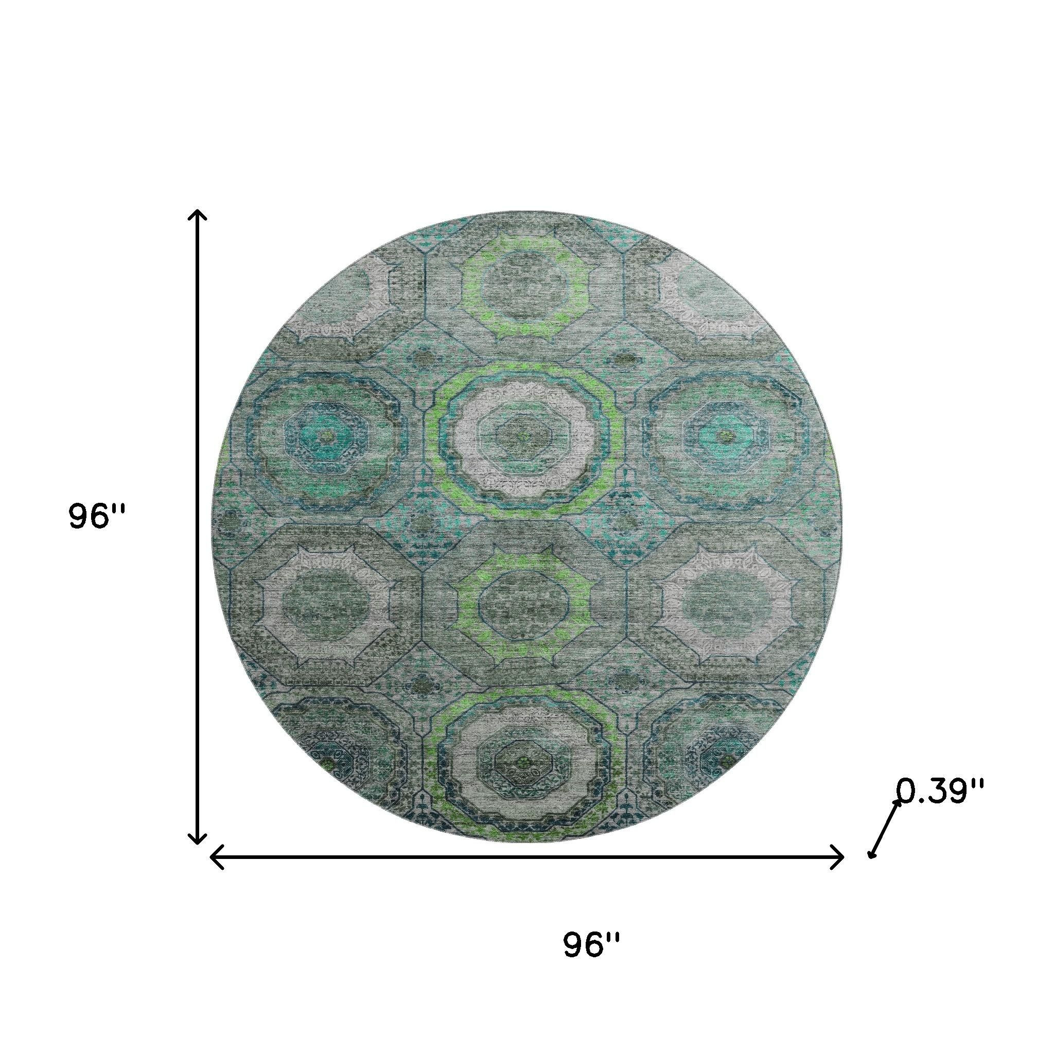 Add some artistry to your room with this 8-foot teal and lime green geometric washable round rug with uv protection. Ideal for spaces with kids and pets, this rug is stain resistant to help repel dirt and spilled liquids. Built to last, this rug crafted from polyester fibers is known for its durability and long lasting appeal. Rugs are a great way to showcase your style, hide imperfections, warm your home and reduce noise. This larger sized, transitional styled rug is ready to create a focal point or statement piece in your room. 96.00-inch h x 96.00-inch w x 0.39-inch d.