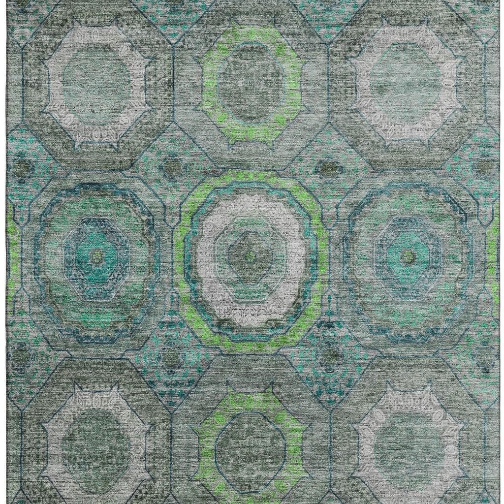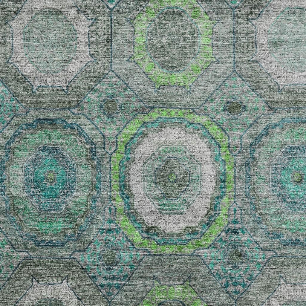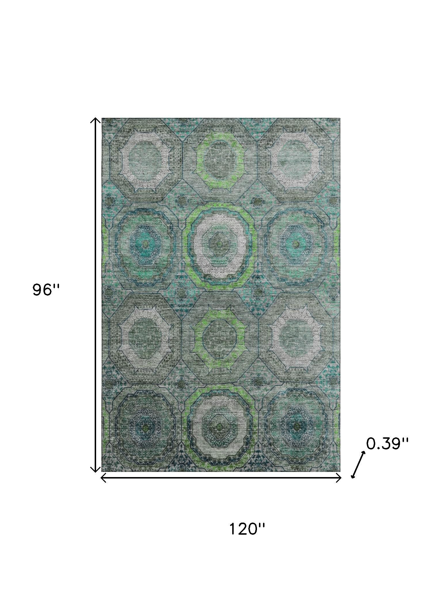 Set an inviting tone in your space with this 8-foot x 10-foot teal and lime green geometric washable area rug with uv protection. Ideal for spaces with kids and pets, this rug is stain resistant to help repel dirt and spilled liquids. Built to last, this rug crafted from polyester fibers is known for its durability and long lasting appeal. Rugs are a great way to showcase your style, hide imperfections, warm your home and reduce noise. This larger sized, transitional styled rug is ready to create a focal point or statement piece in your room. 96.00-inch h x 120.00-inch w x 0.39-inch d.