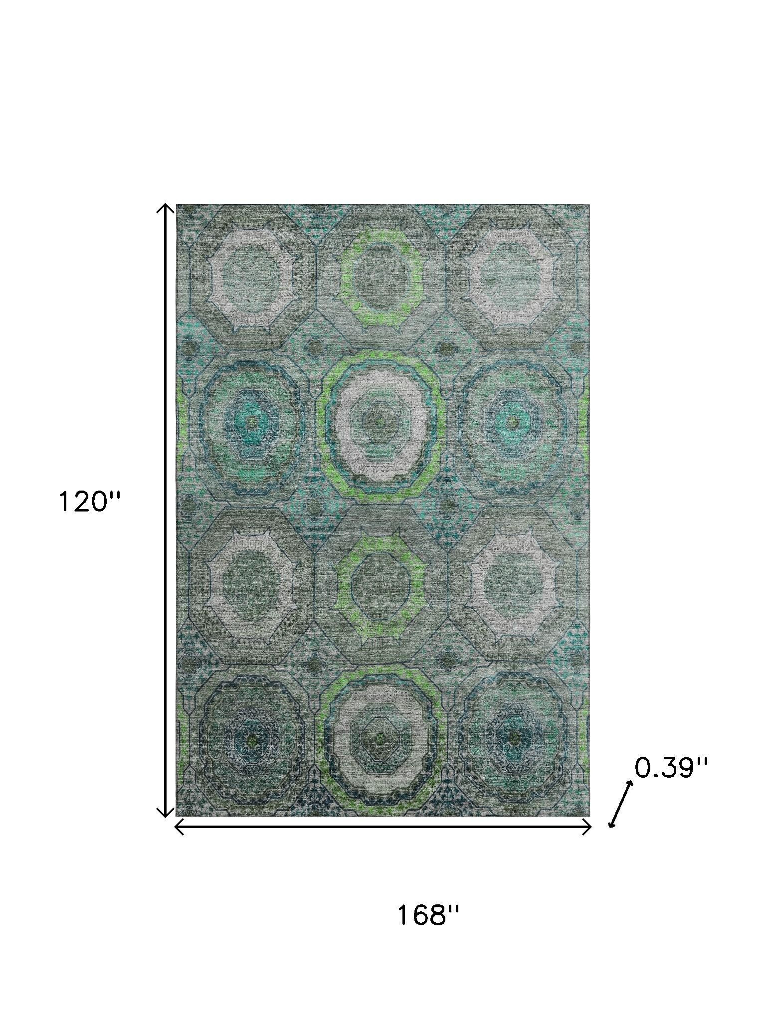 This 10-foot x 14-foot teal and lime green geometric washable area rug with uv protection, is a great way to add warmth to a room. Ideal for spaces with kids and pets, this rug is stain resistant to help repel dirt and spilled liquids. Built to last, this rug crafted from polyester fibers is known for its durability and long lasting appeal. Rugs are a great way to showcase your style, hide imperfections, warm your home and reduce noise. This larger sized, transitional styled rug is ready to create a focal point or statement piece in your room. 120.00-inch h x 168.00-inch w x 0.39-inch d.